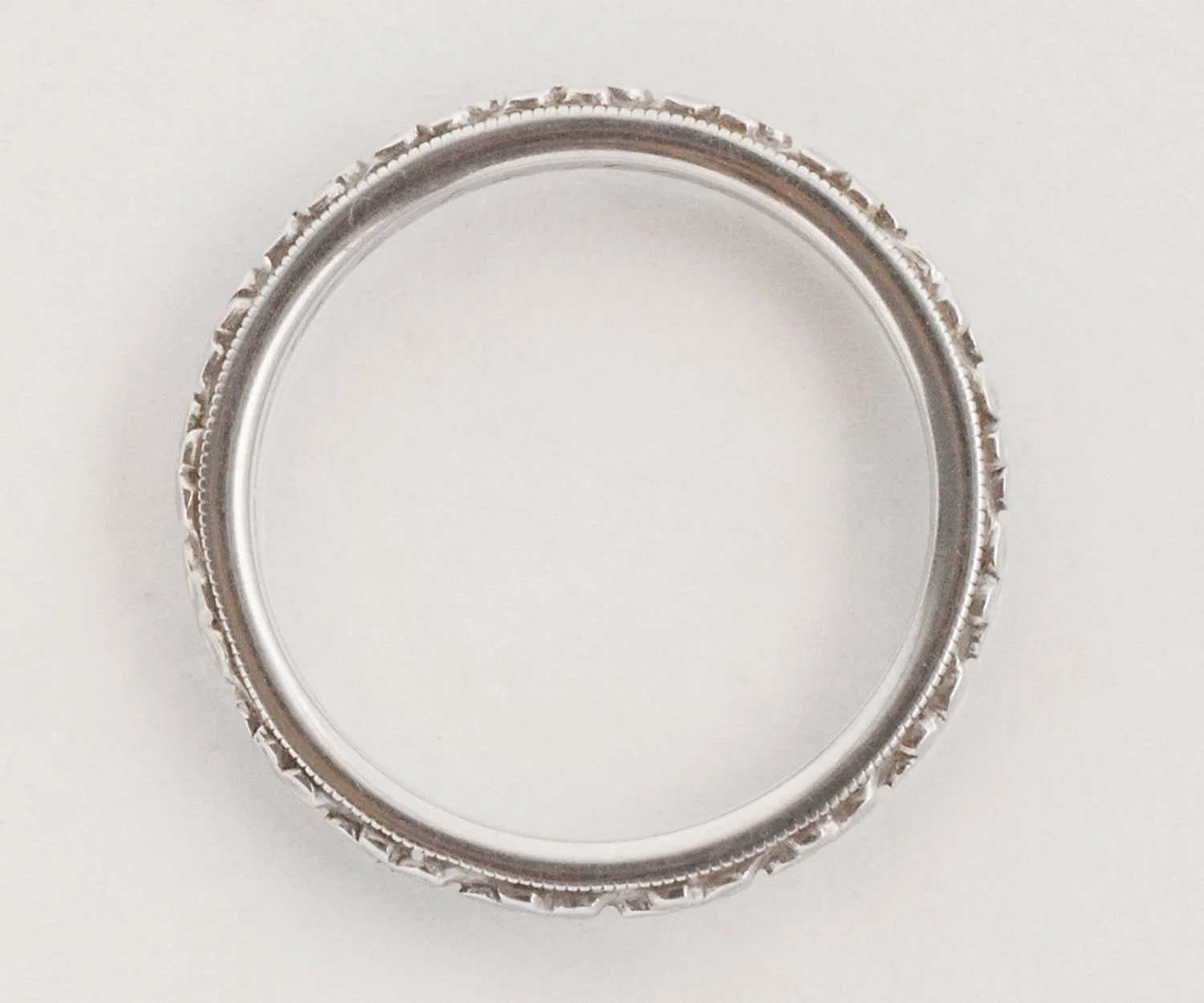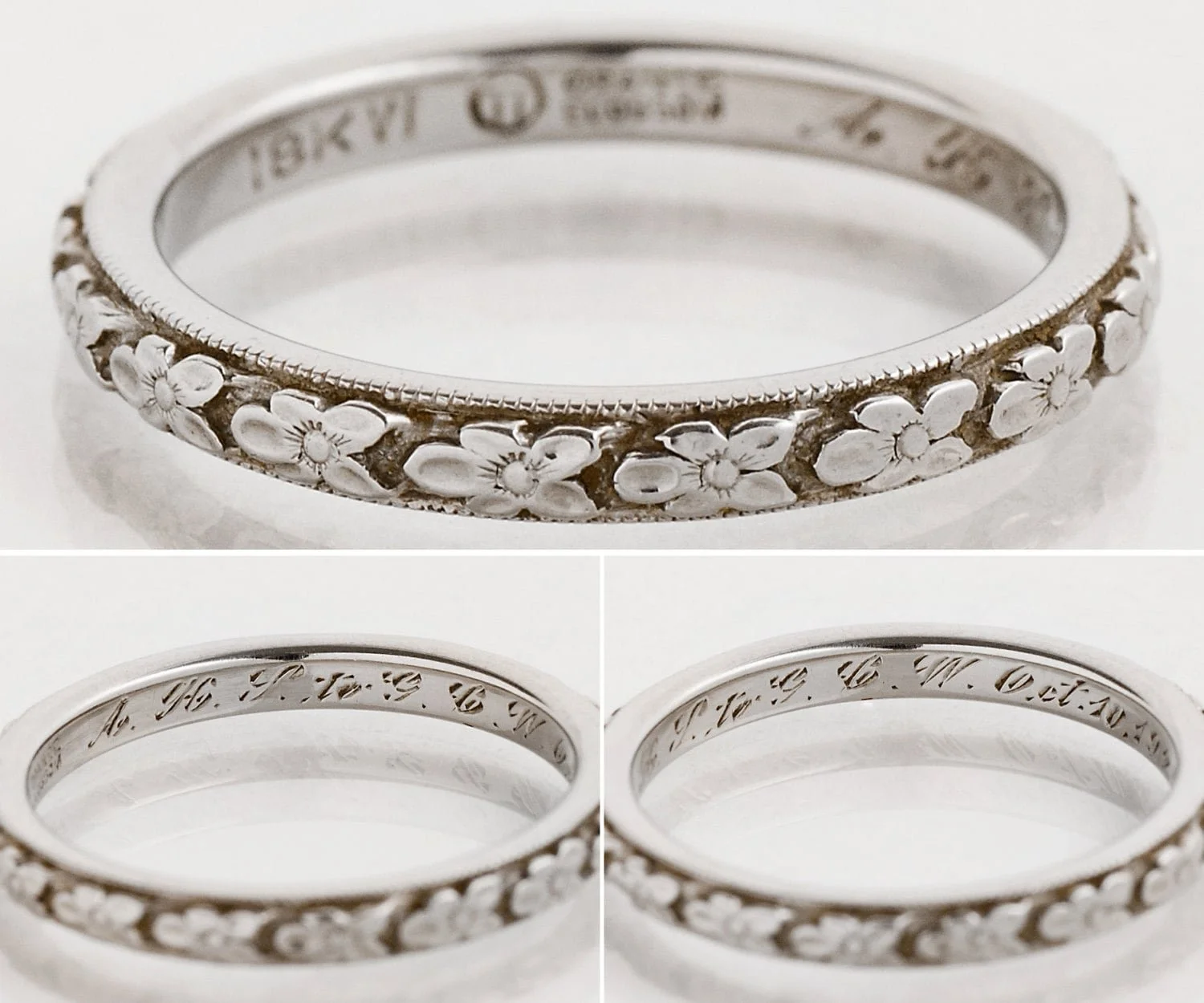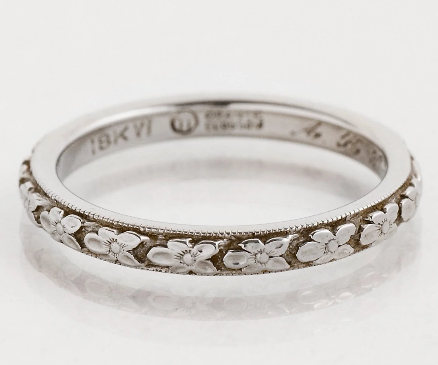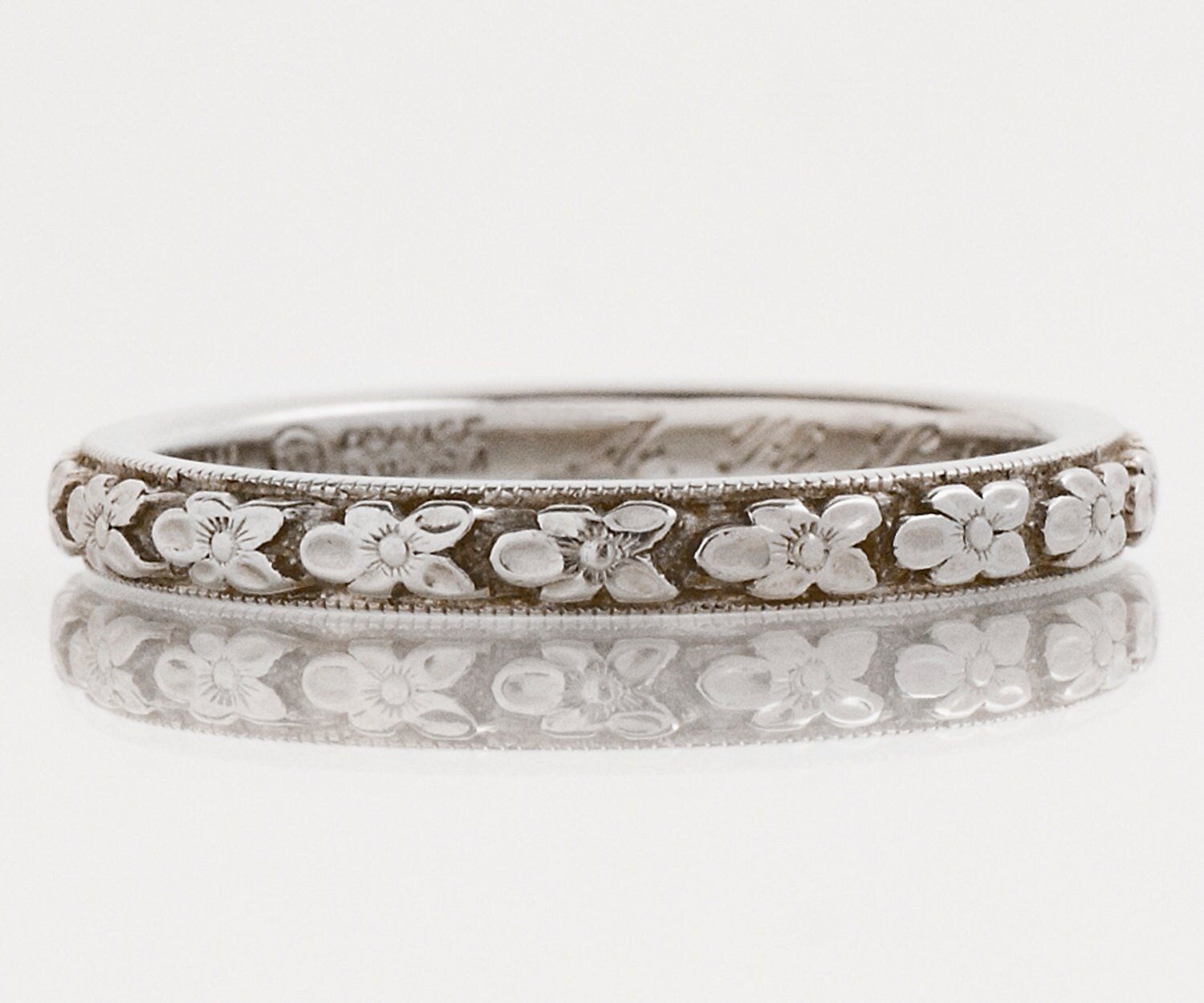 The eternal floral pattern in this lovely 18 k white gold antique wedding band really pops and is finished off with crisp milgrain. As always, we love to see the engraving inside the ring, allowing us to dream of a great and timeless romance back in 1925!