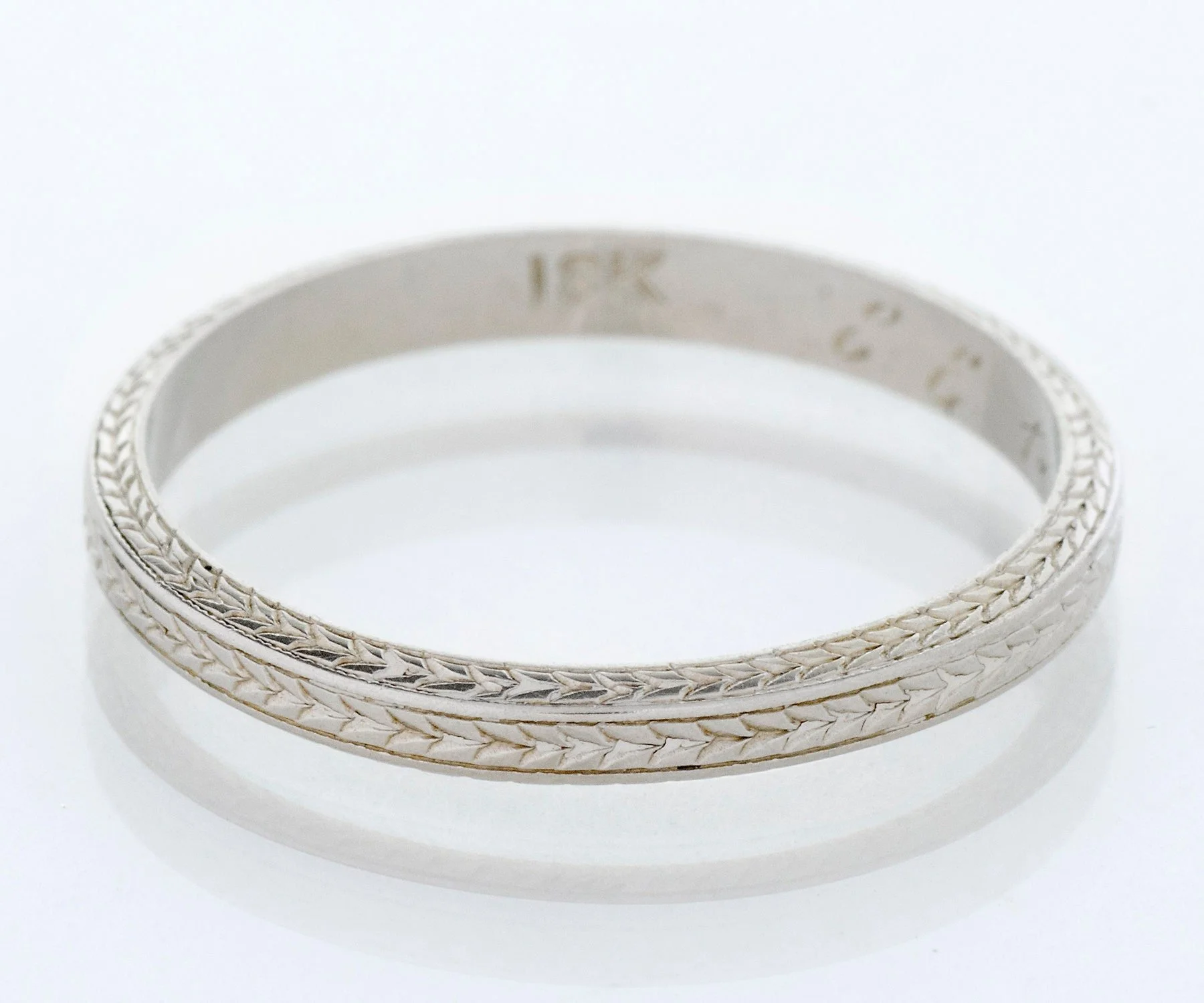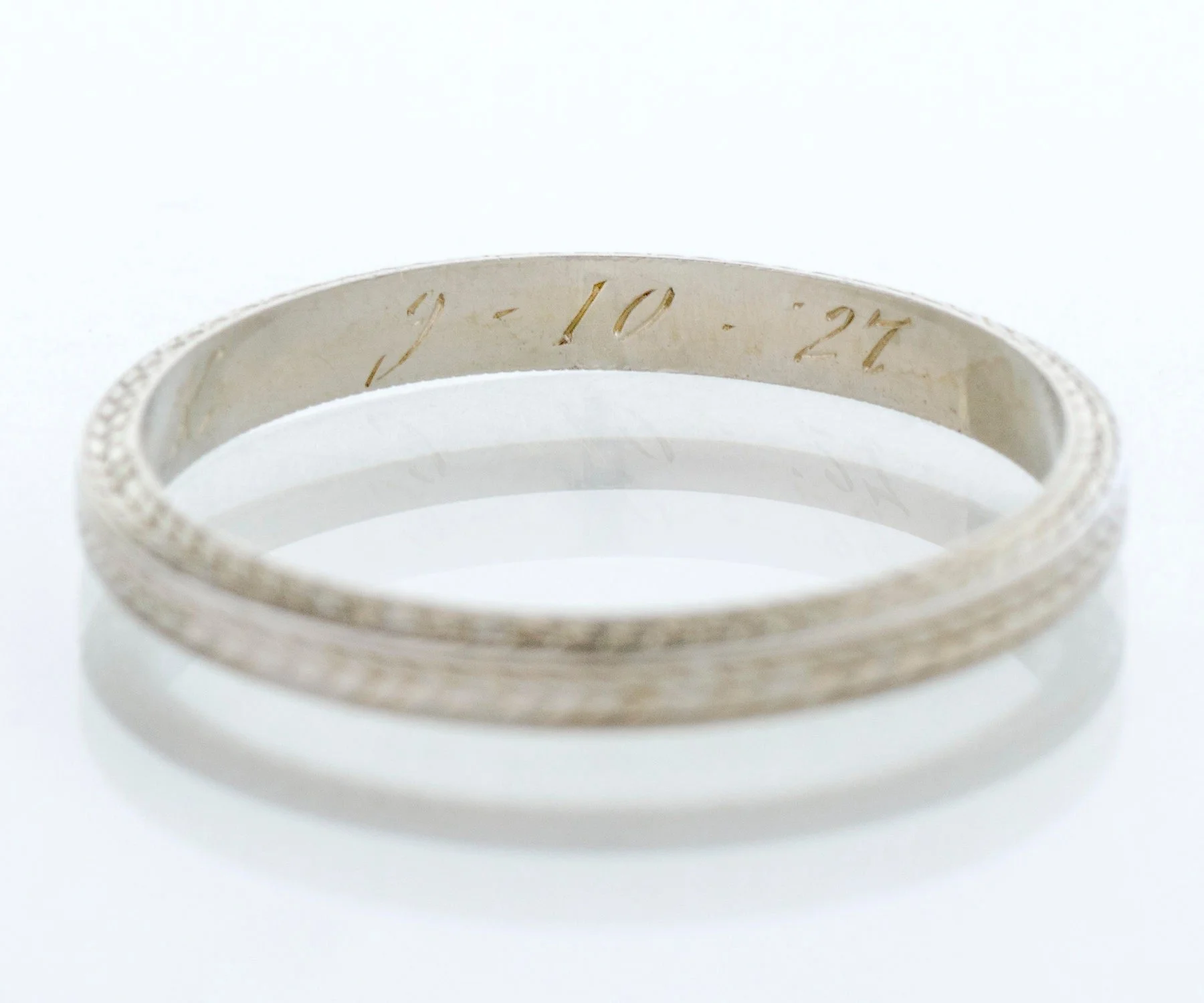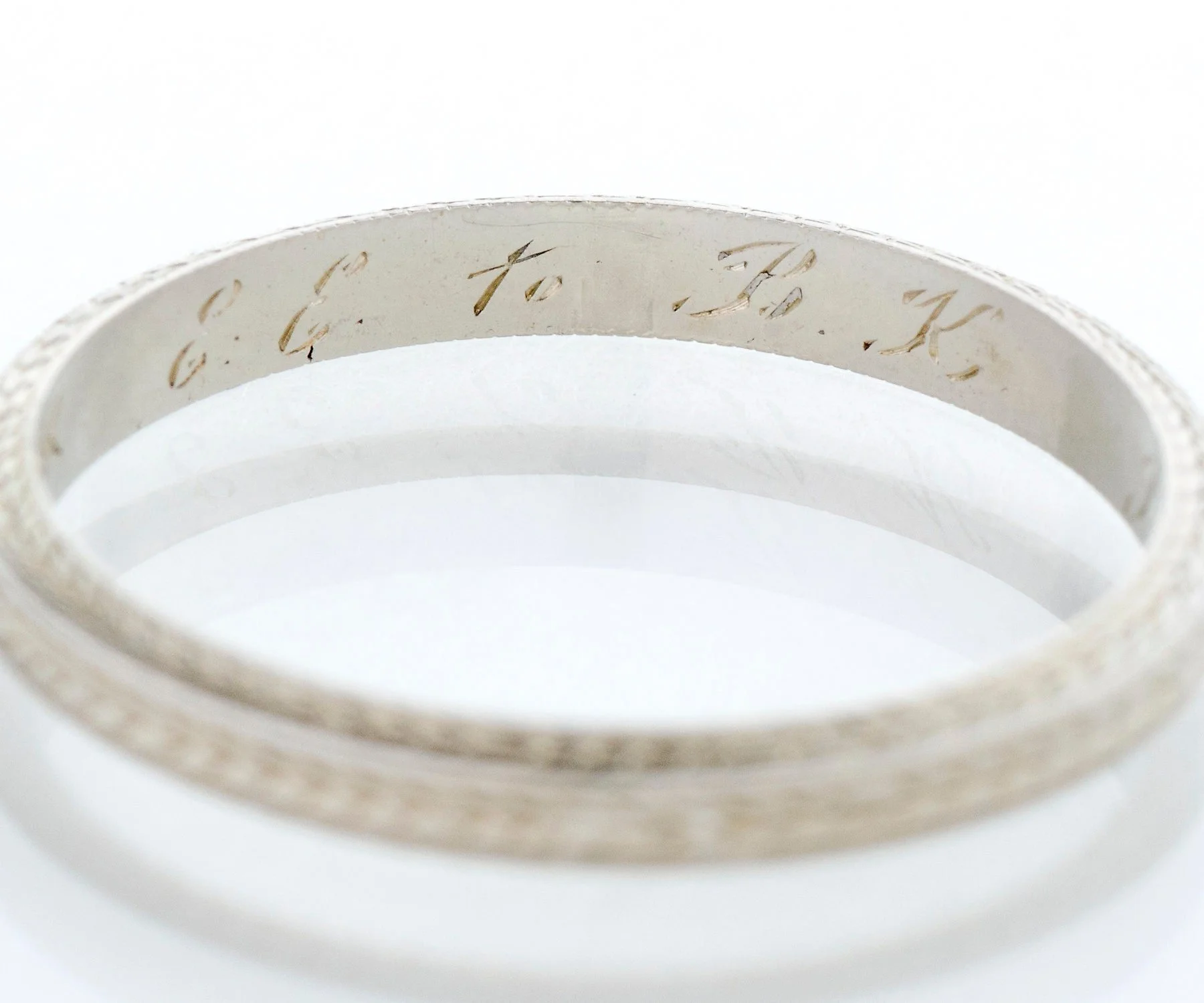 Antique Wedding Band - Antique 18k White Gold Engraved "1927" Wedding Band 18k White Gold Engraved "E.E. to B.K. 3-10-27" Ring Size 6 Band measures approximately 2.3mm wide.