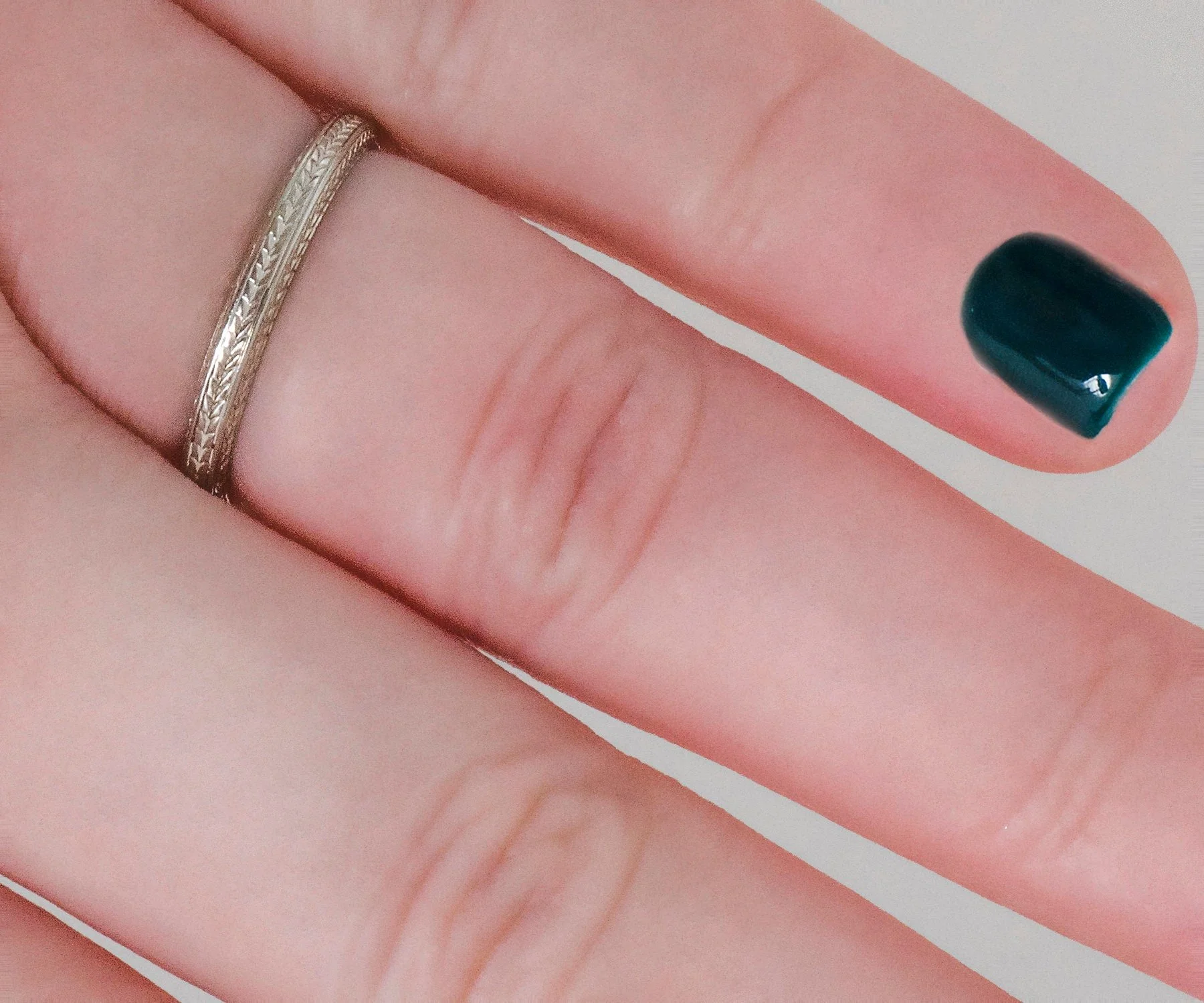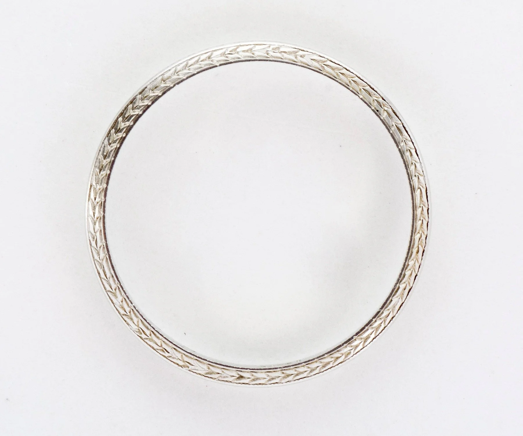 A classic in its time during the decadent 1920's is this exquisite antique 18k white gold wedding band. With its delicate leaf pattern adorning the outside, it also has a special engraving inside with initials and a special date of "3-10-27". Delicate and gorgeous!