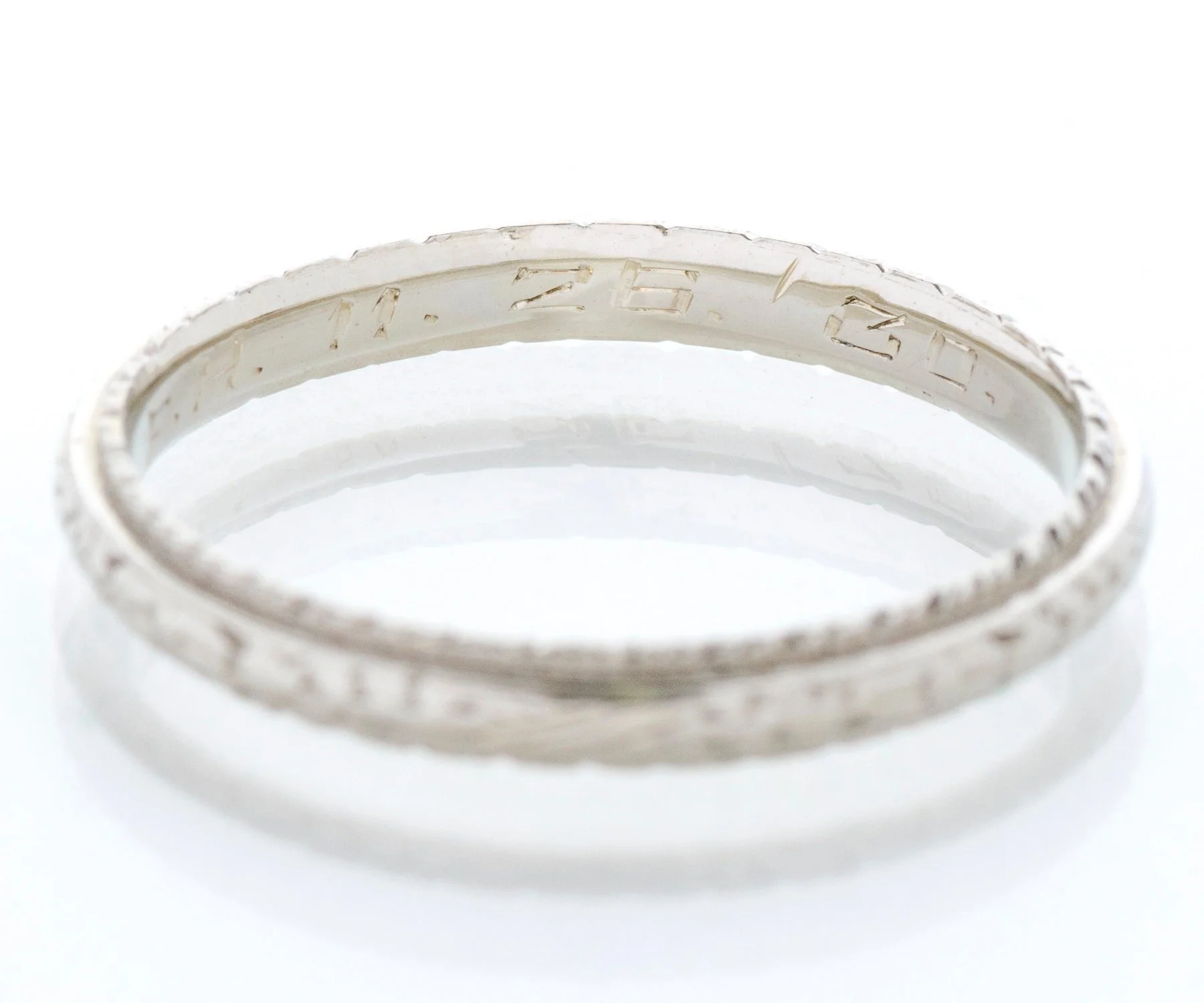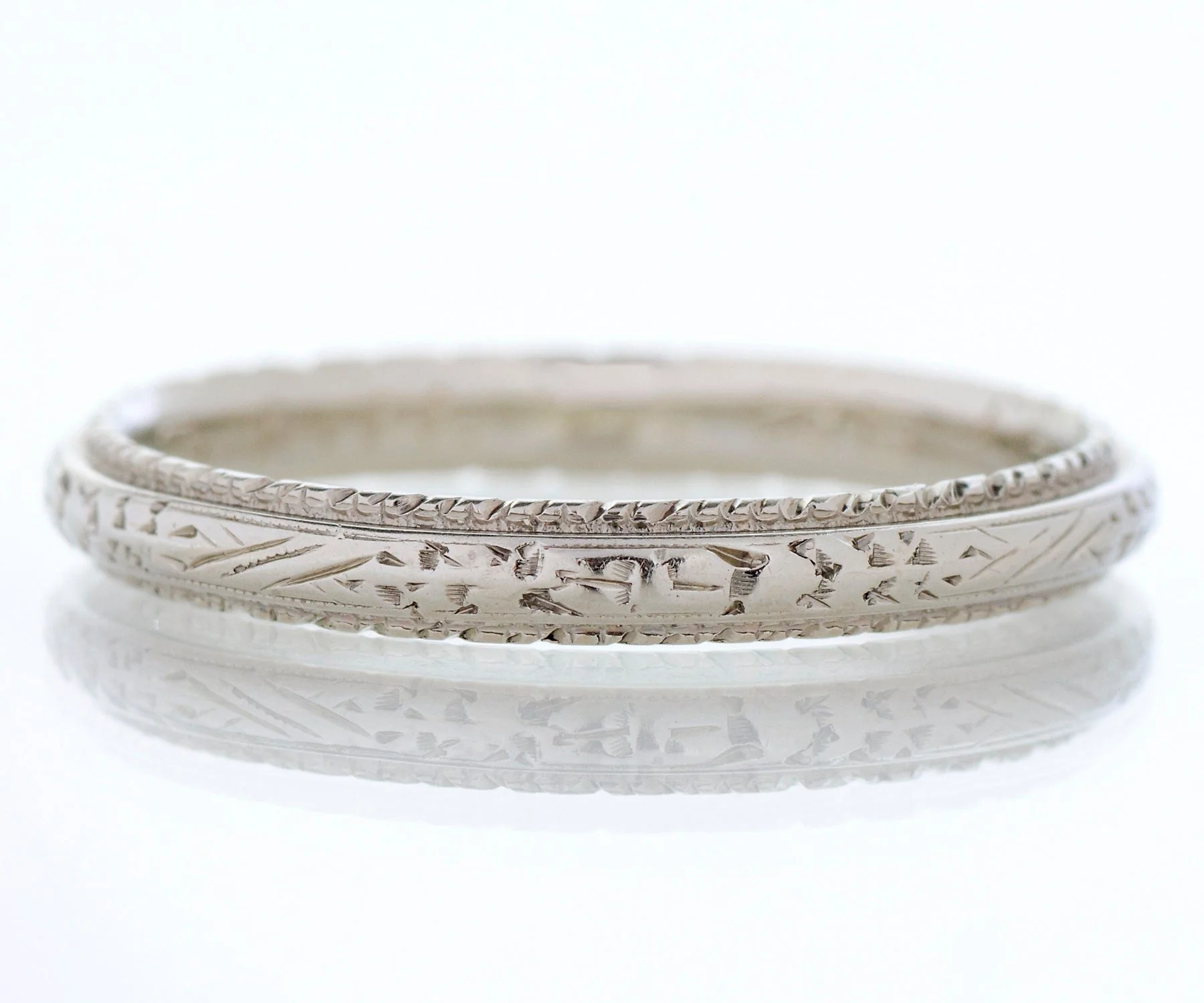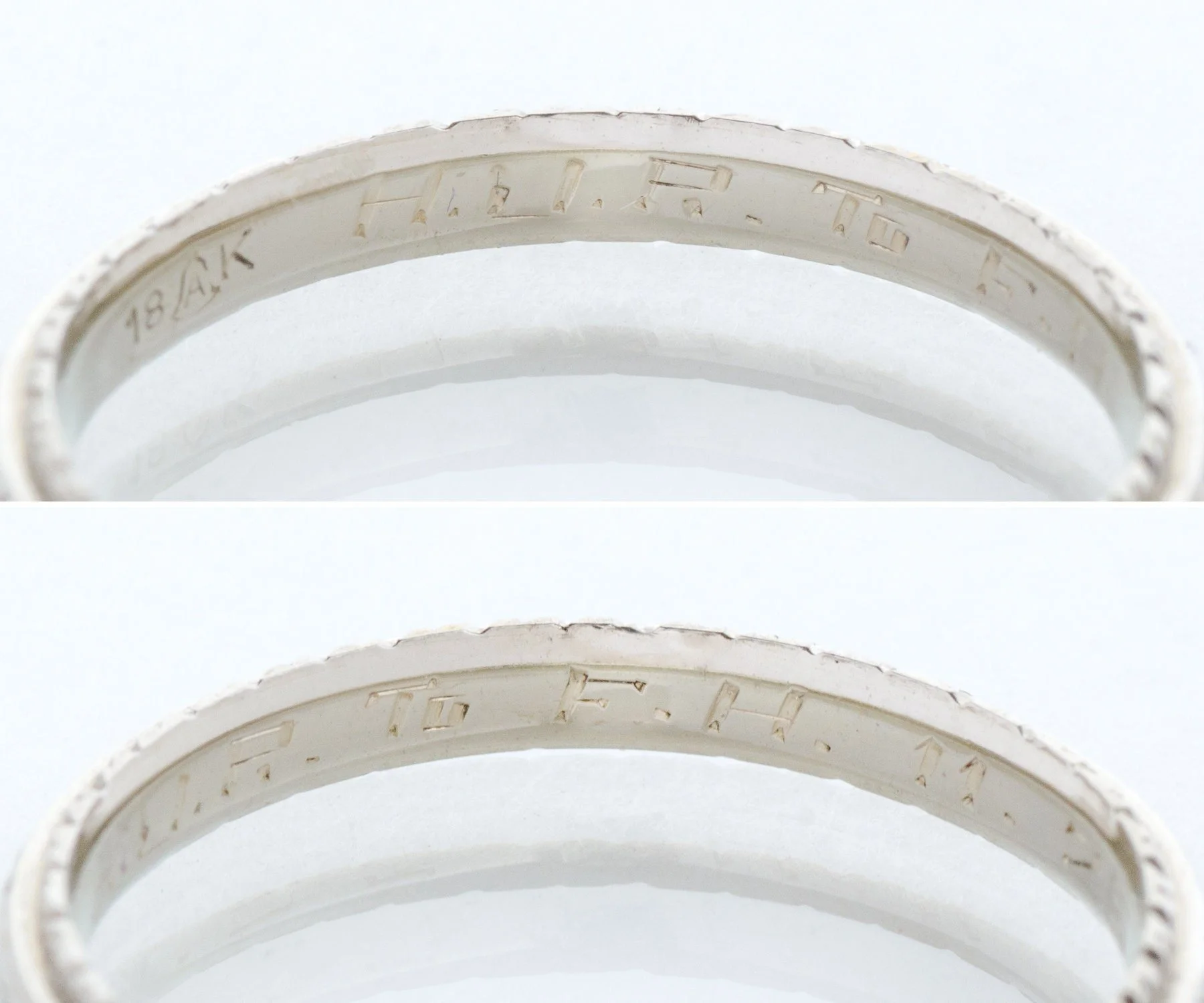 Antique Wedding Band - Antique 18k White Gold Engraved "1930" Wedding Band 18k White Gold Engraved "H.J.P. to F.H. 11.26.30" Ring Size 6.5 Band measures approximately 2.5mm wide.