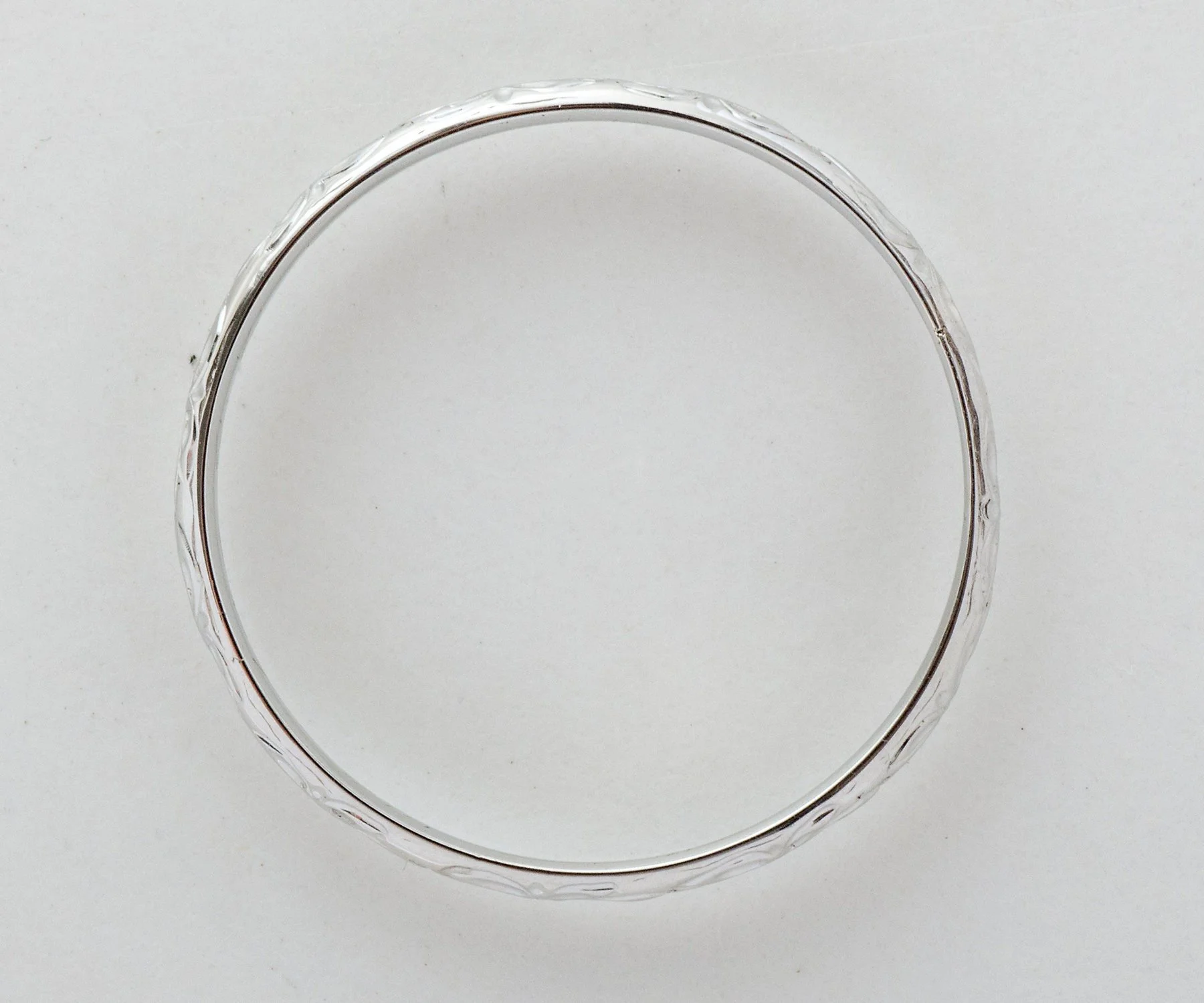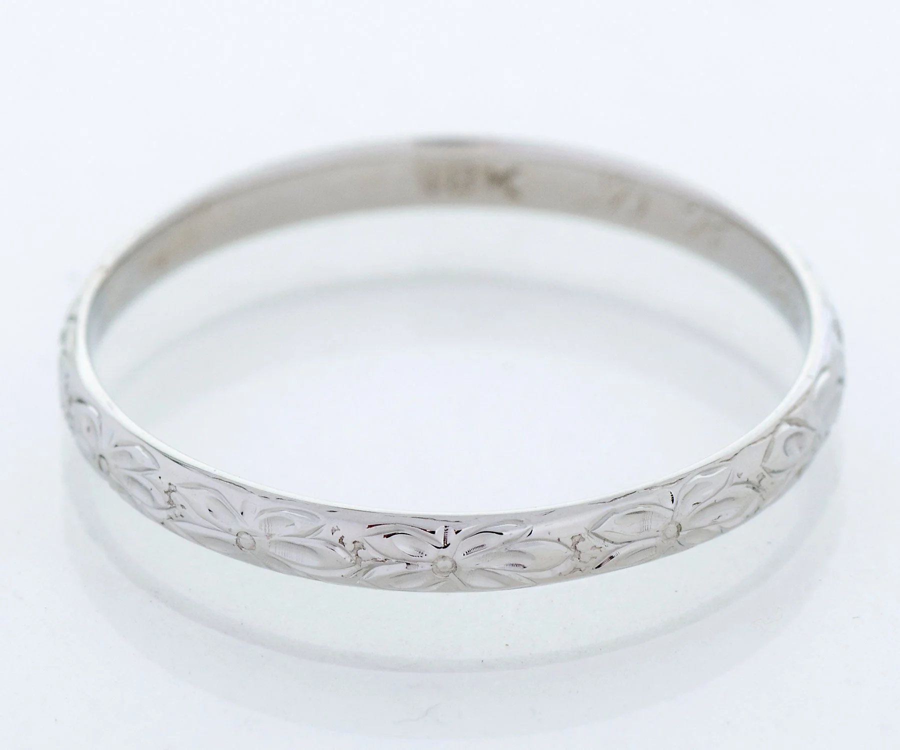We really love seeing the original engraving of dates on our antique wedding bands. Besides enabling us to date exactly, it allows us to imagine a romance of so long ago! This pretty band was created in 18k white gold and displays an engraved orange blossom pattern all around. Very romantic to couple this aged beauty with your engagement ring of any era.