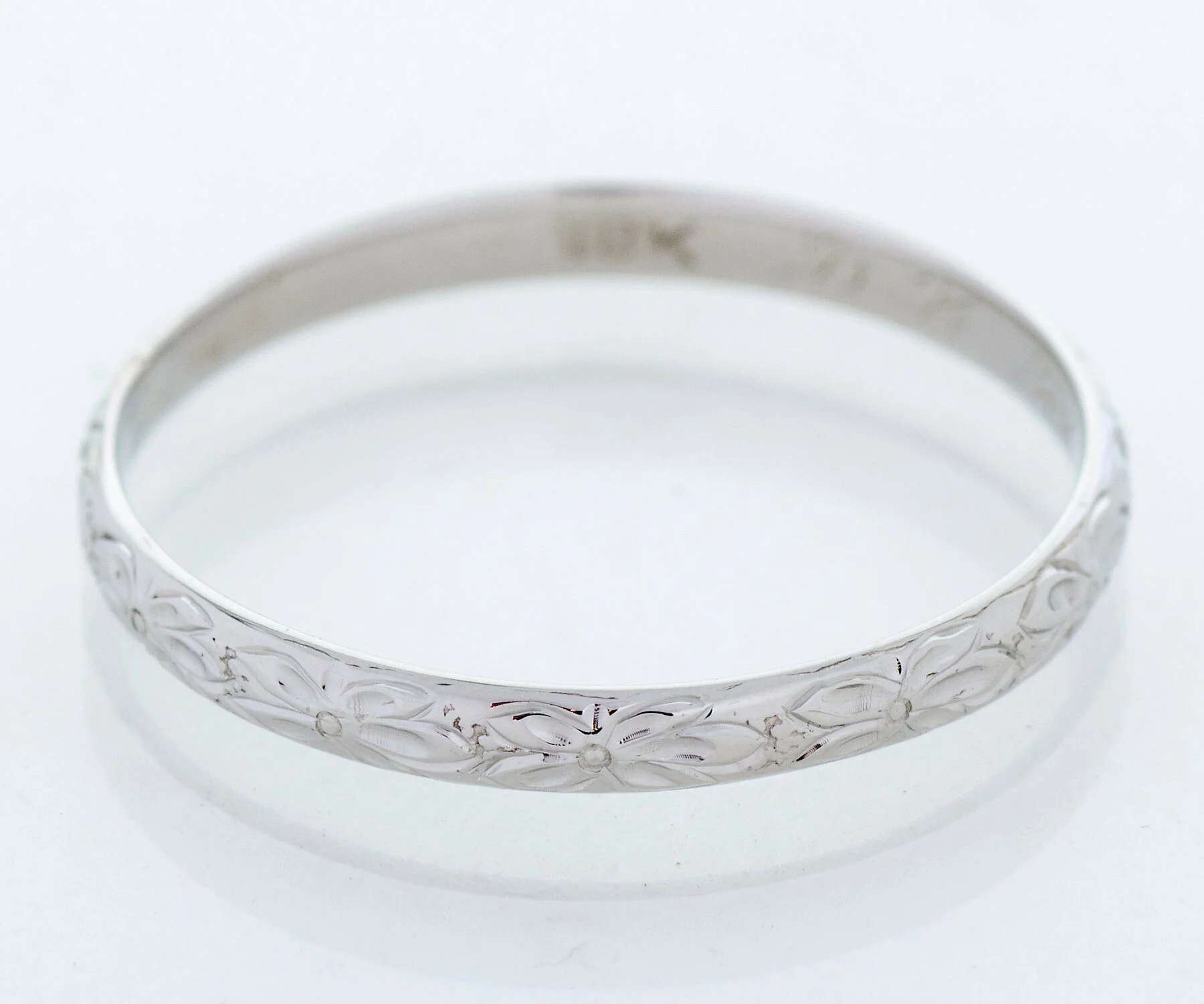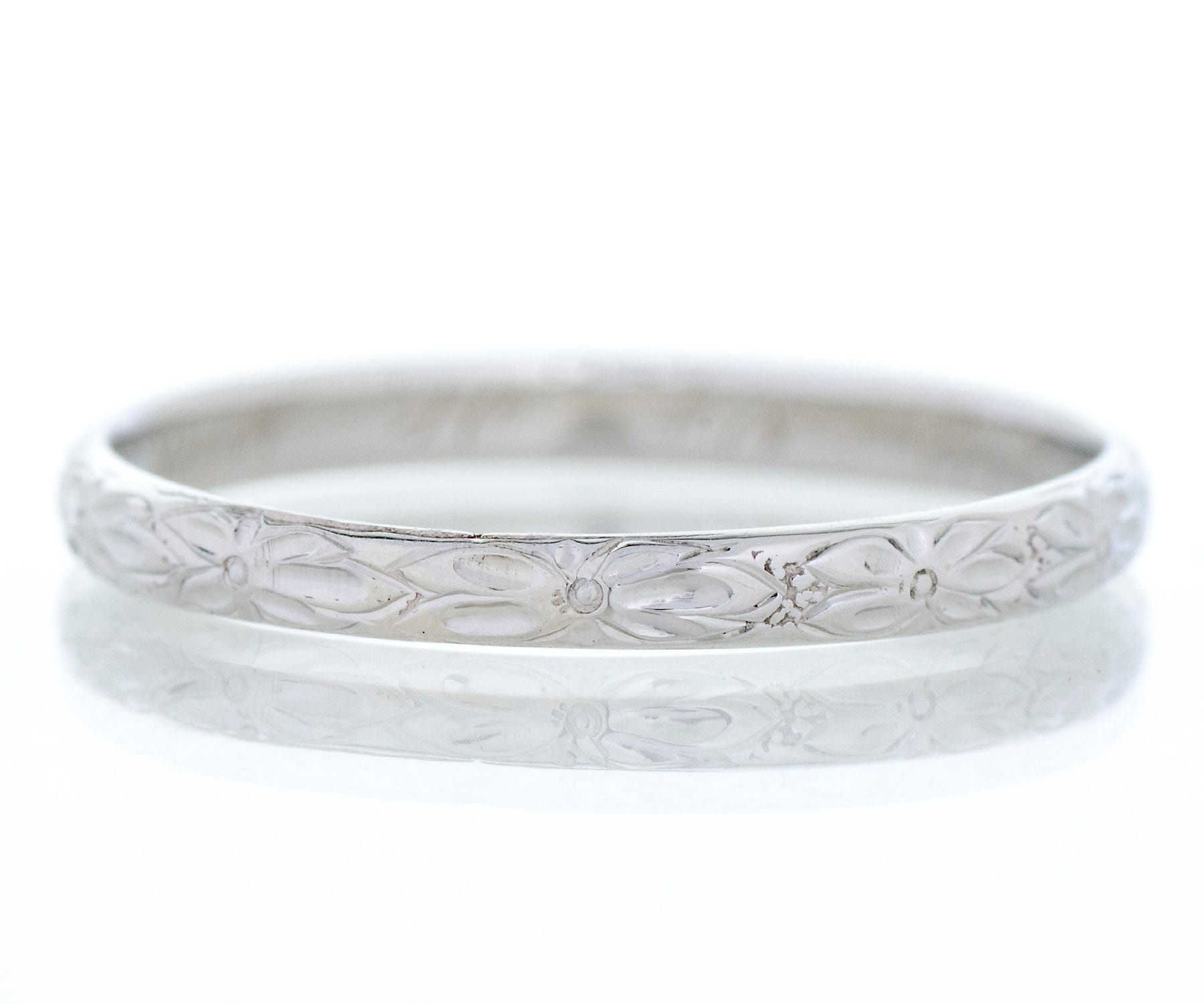 We really love seeing the original engraving of dates on our antique wedding bands. Besides enabling us to date exactly, it allows us to imagine a romance of so long ago! This pretty band was created in 18k white gold and displays an engraved orange blossom pattern all around. Very romantic to couple this aged beauty with your engagement ring of any era.