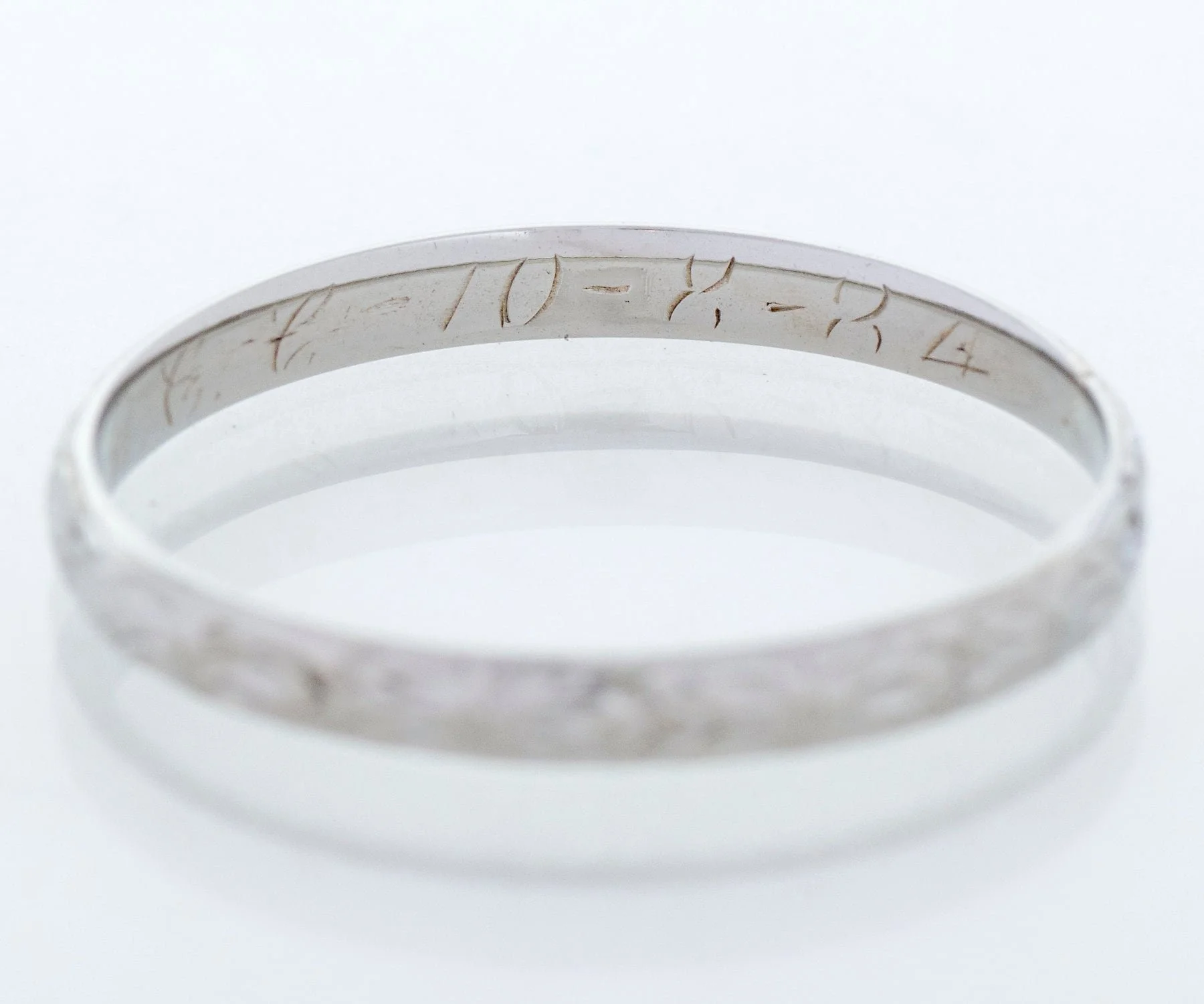 Antique Wedding Band - Antique 18k White Gold Engraved "1934" Wedding Band 18k White Gold Engraved "10-8-34" Ring Size 6 1/8 Band measures approximately 2mm wide.