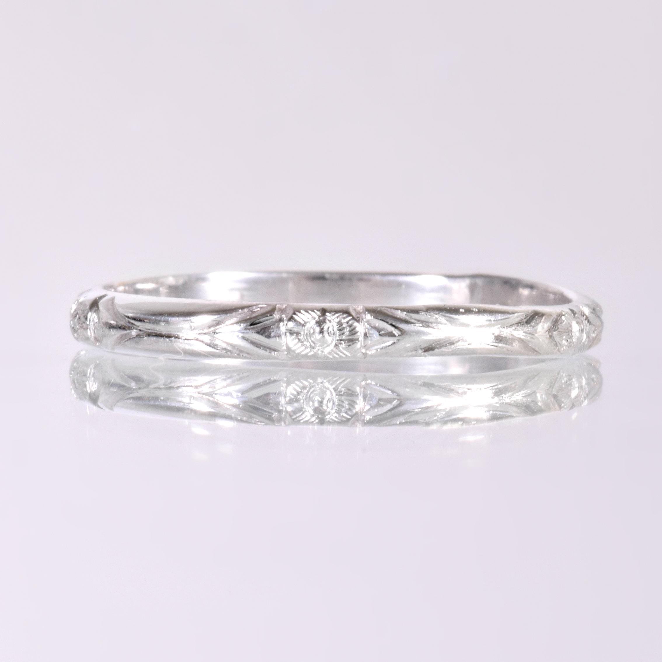 Antique Wedding Band - Antique 18k White Gold Engraved Wedding Band