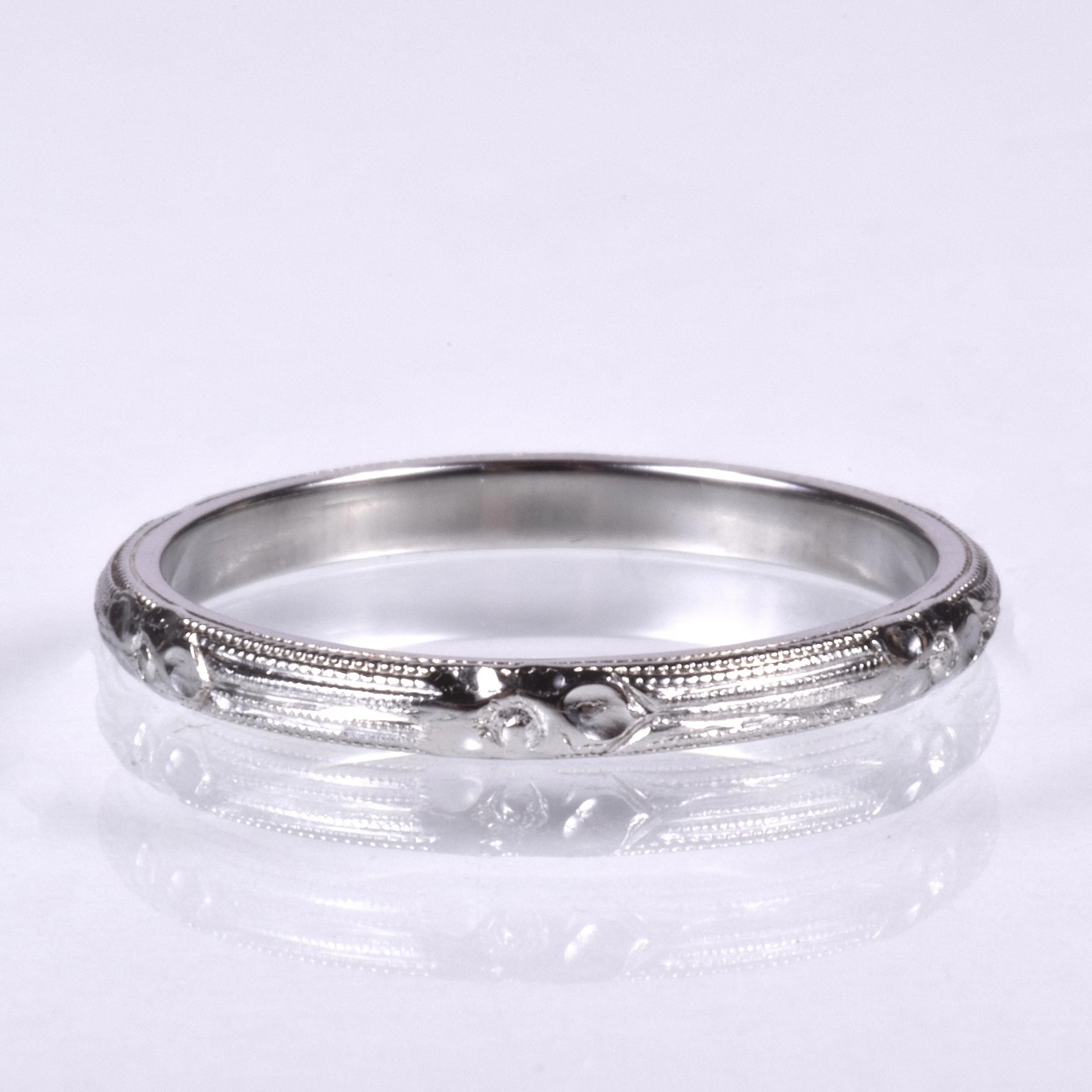 Antique Wedding Band - Antique 18k White Gold Floral Engraved Milgrain Wedding Band