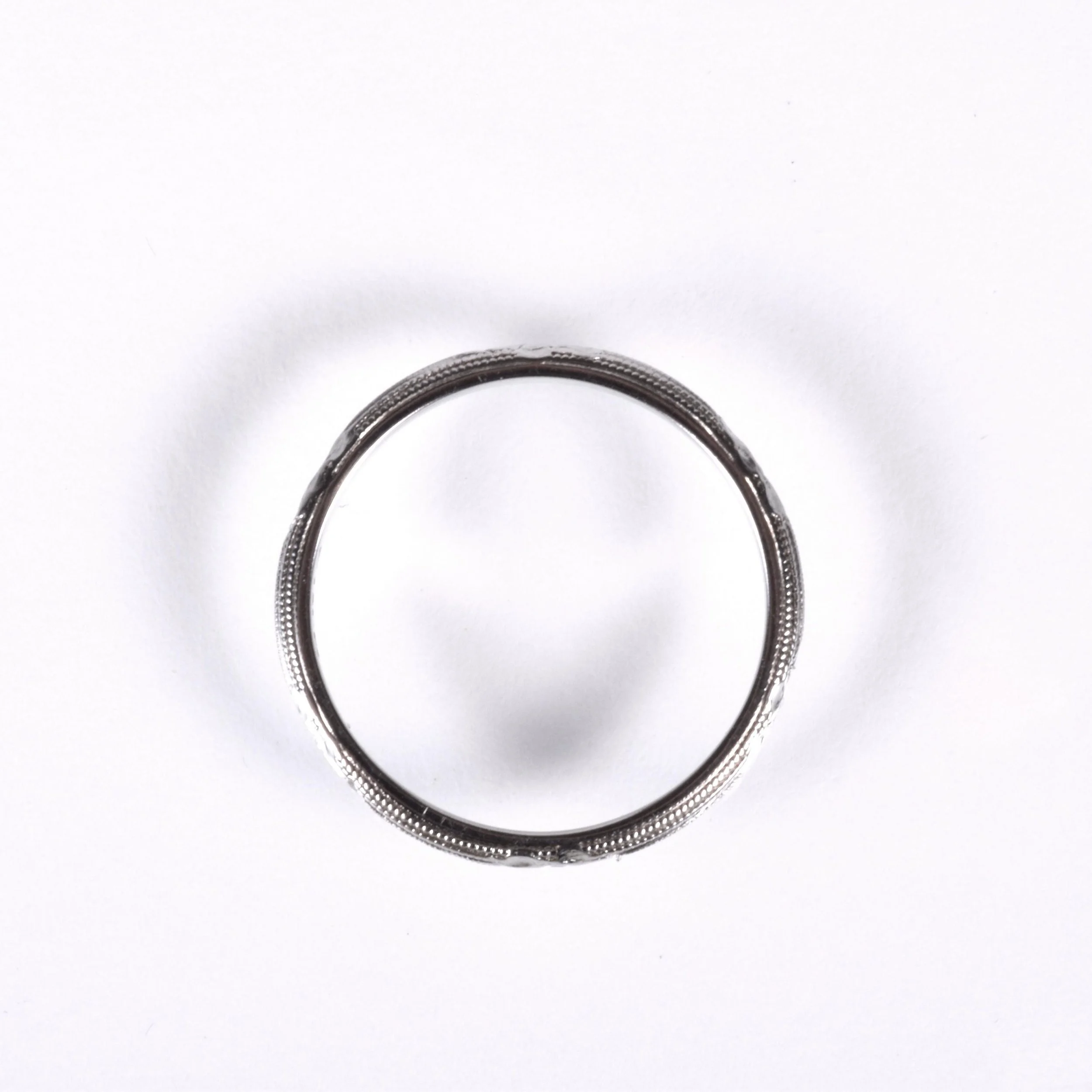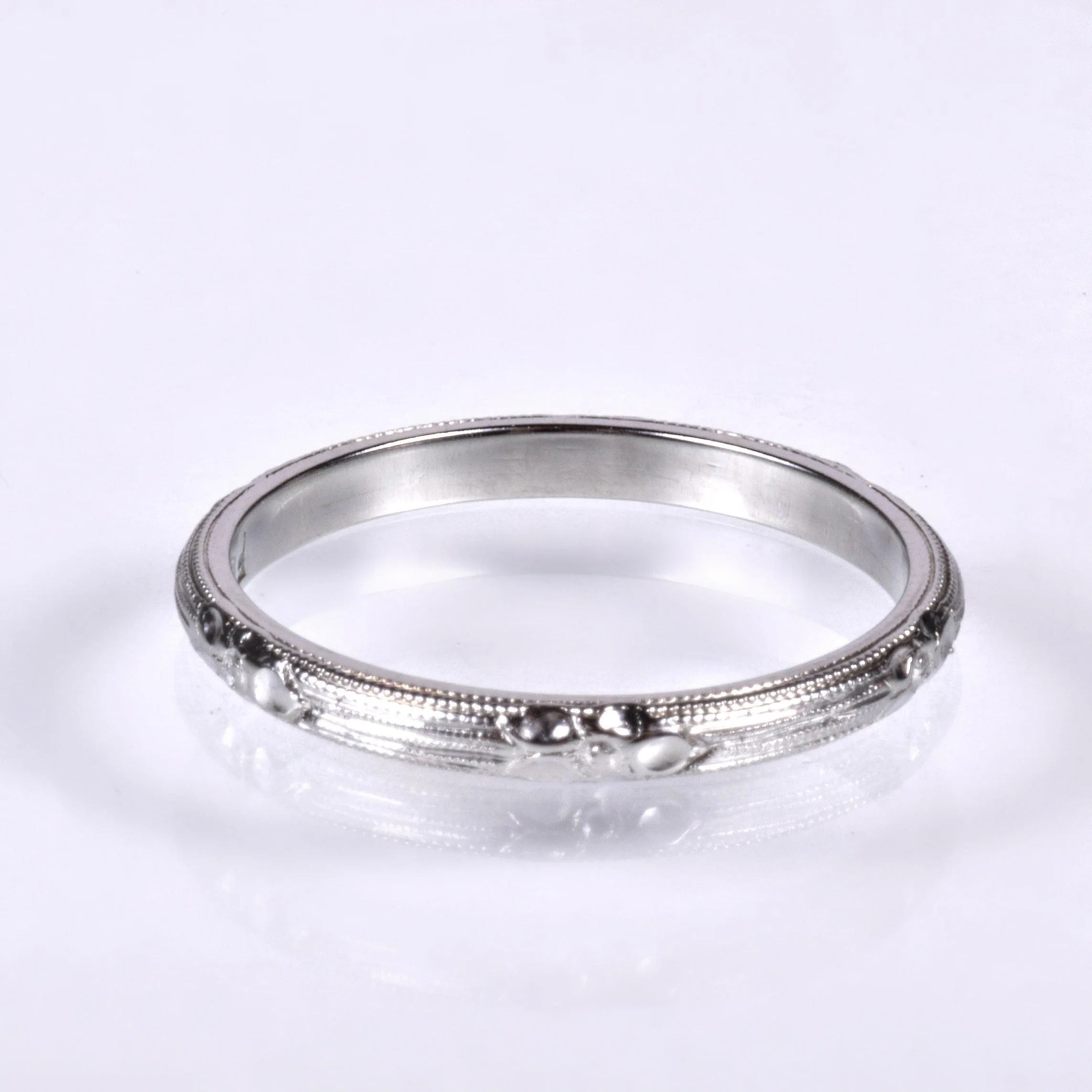 Antique Wedding Band - Antique 18k White Gold Floral Engraved Milgrain Wedding Band 18k White Gold Intermittent blossom pattern with milgrain Stamped FB Ring Size 6 Band measures approximately 2mm wide.