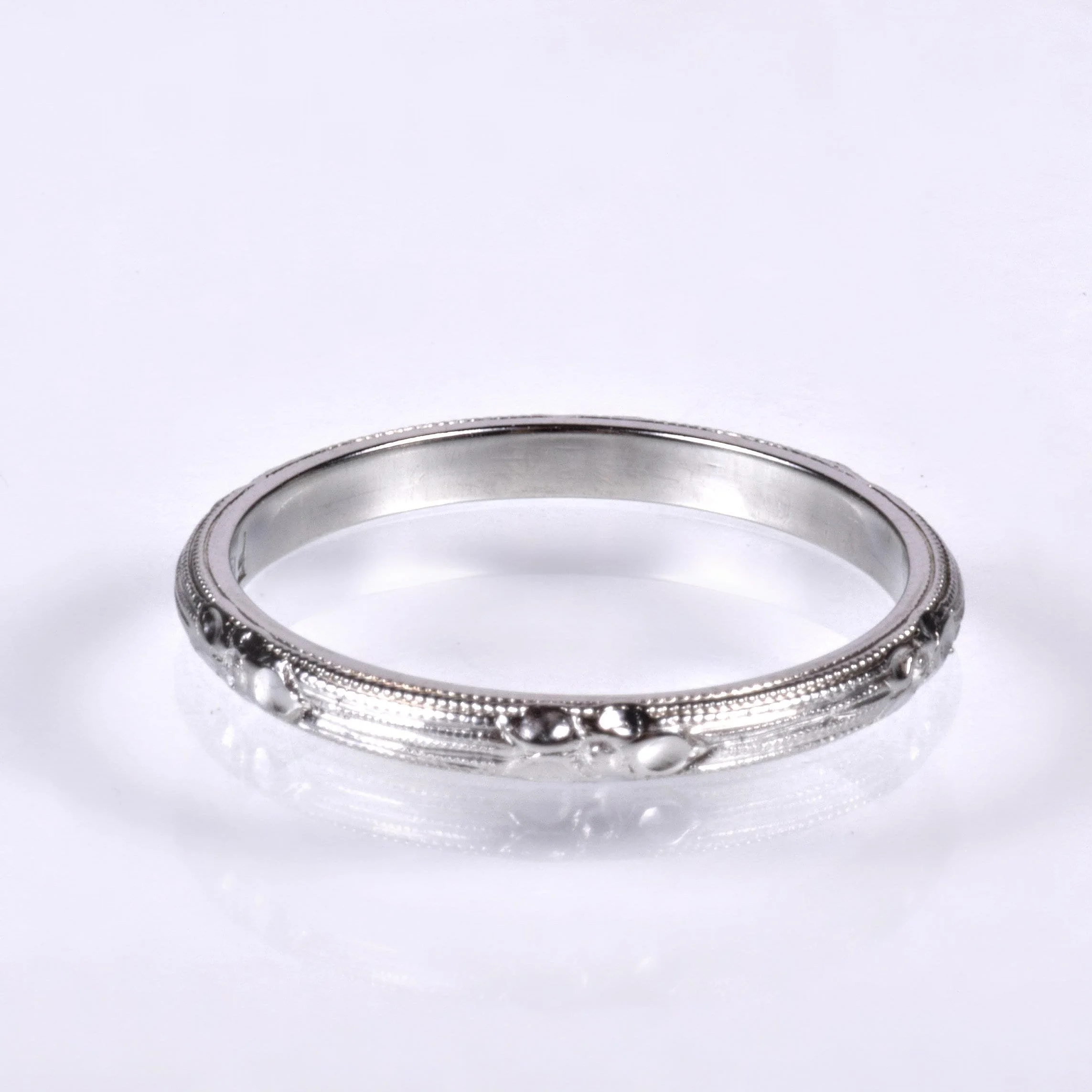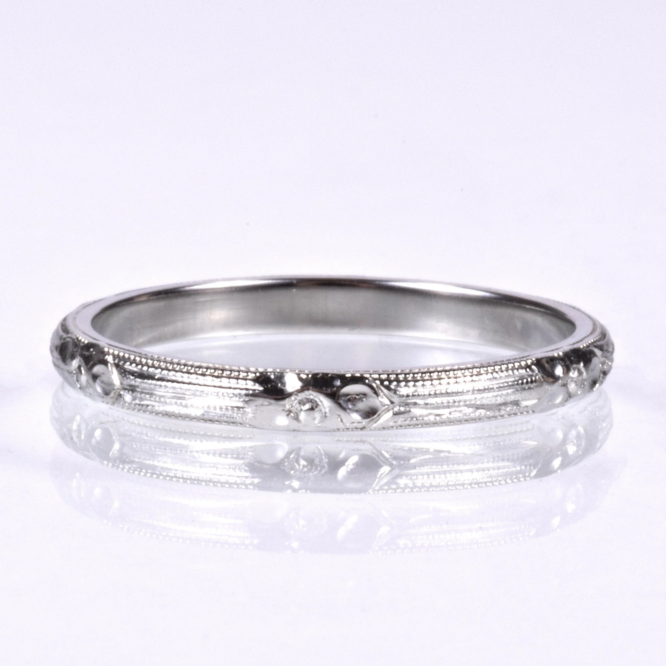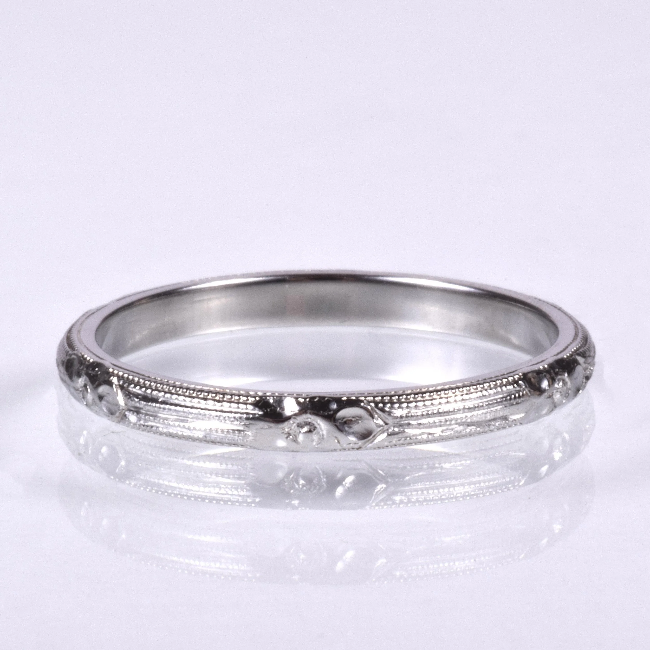 Antique Wedding Band - Antique 18k White Gold Floral Engraved Milgrain Wedding Band
