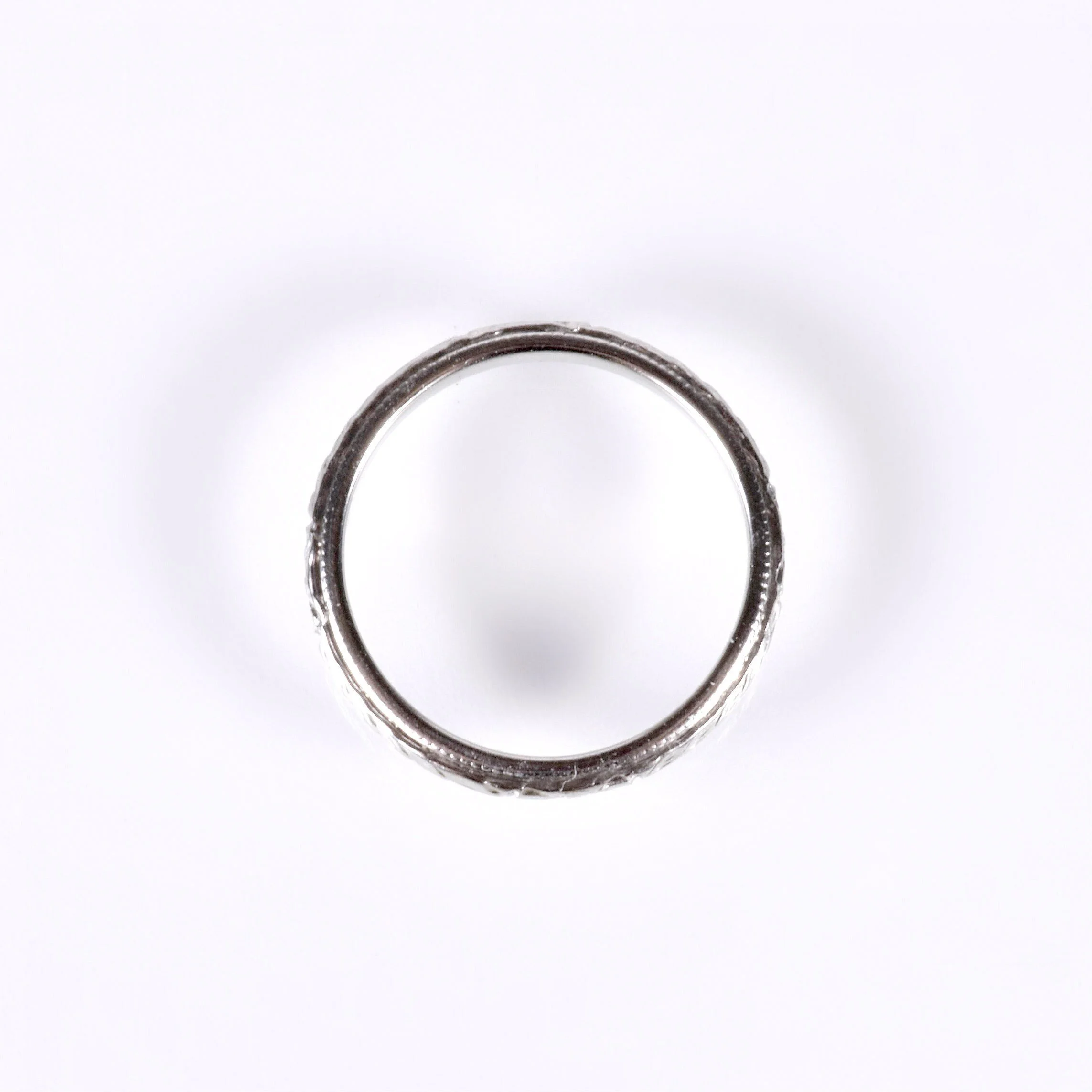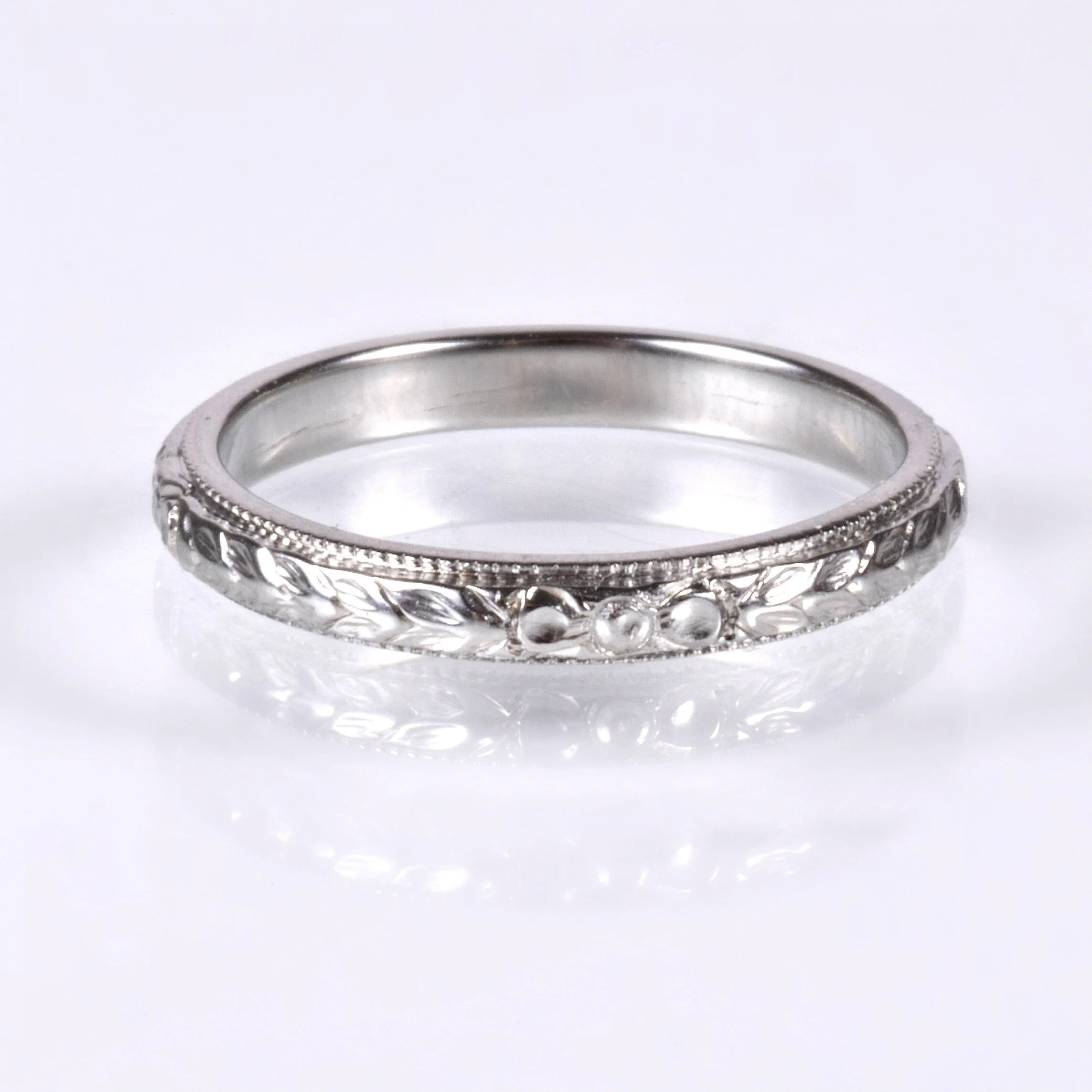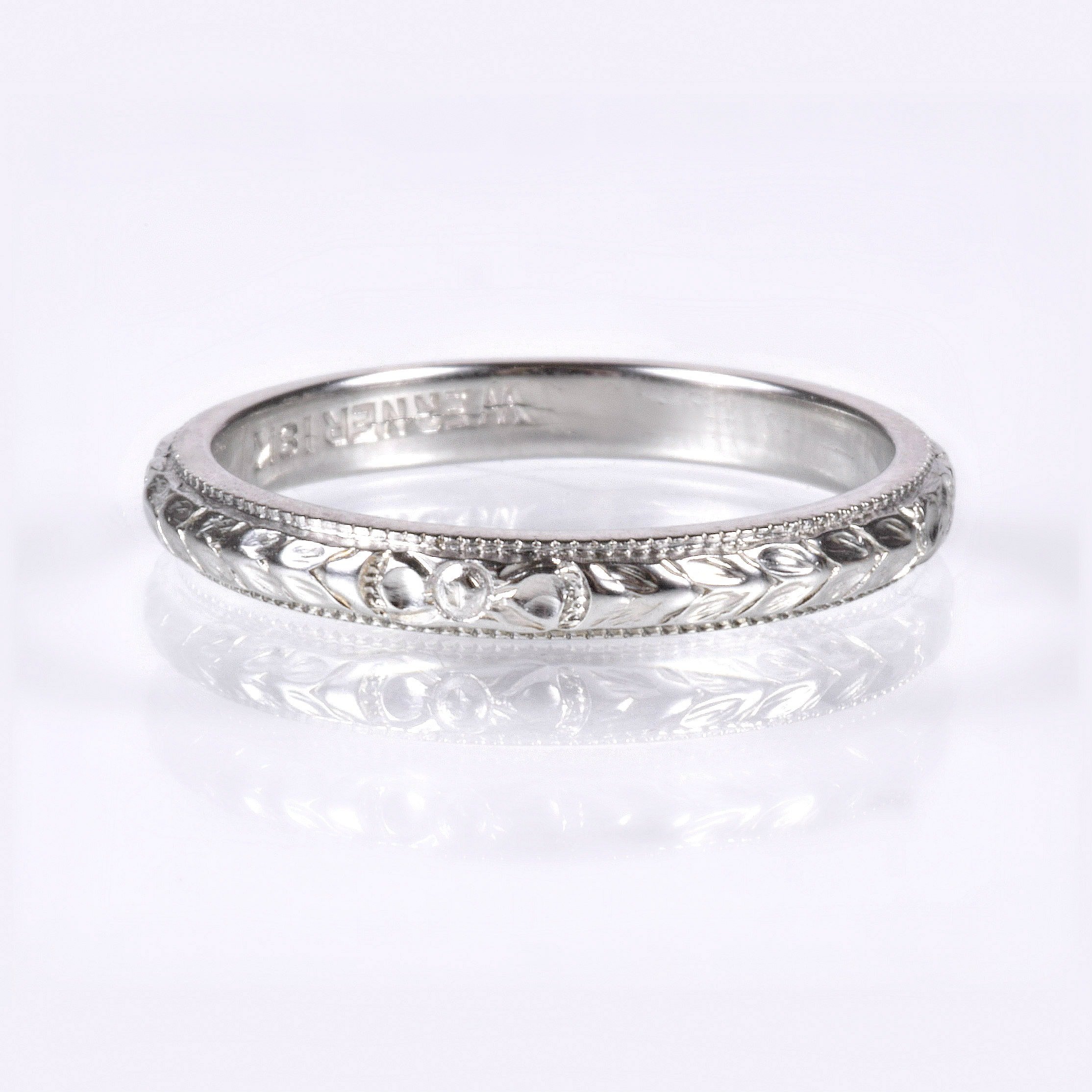 Antique Wedding Band - Antique 18k White Gold Leaf Patterned Wedding Band