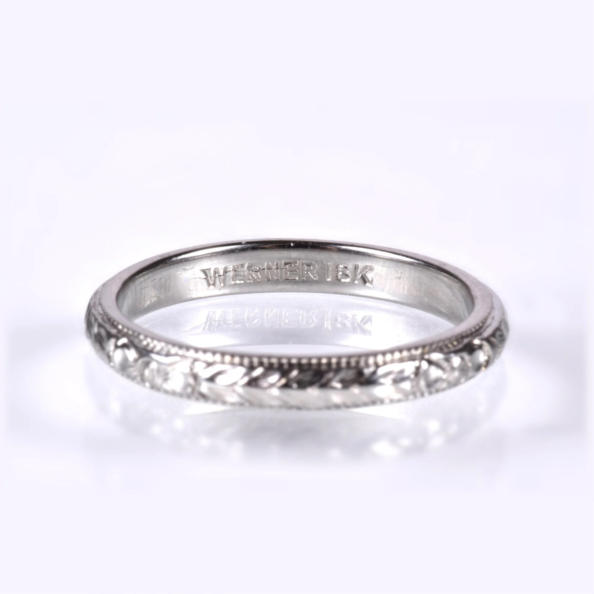 Antique Wedding Band - Antique 18k White Gold Leaf Patterned Wedding Band 18k White Gold Leaf Pattern Signed - Werner Ring Size 4.5 Band measures approximately 1.45mm wide.