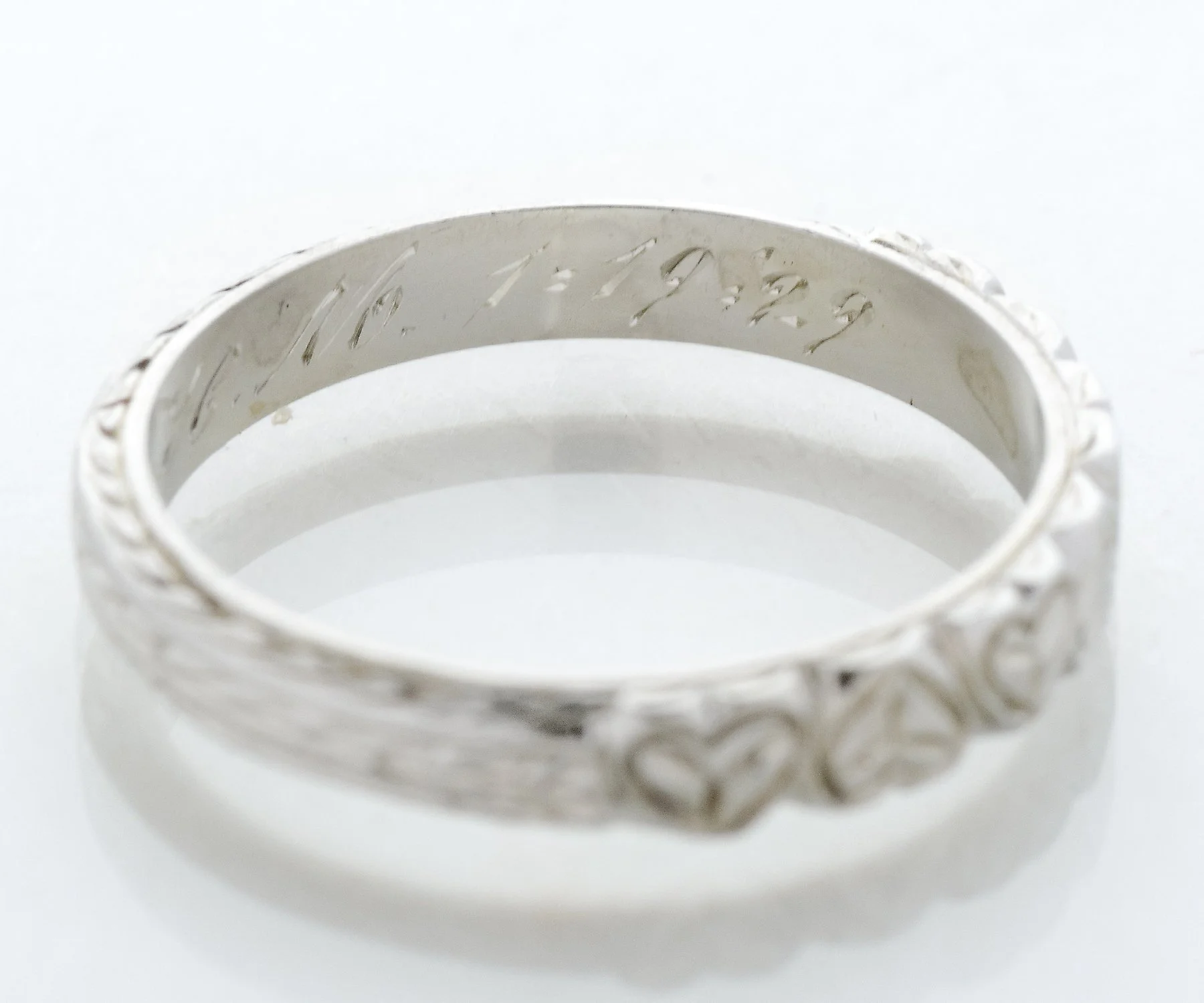 Antique Wedding Band - Antique 18k White Gold Split Pattern Dated "1929" Wedding Band 18k White Gold Hearts & Wheat Pattern Engraved "E.P. to H.M. 1-19-29" Ring Size 5.5 Band measures approximately 3mm wide.