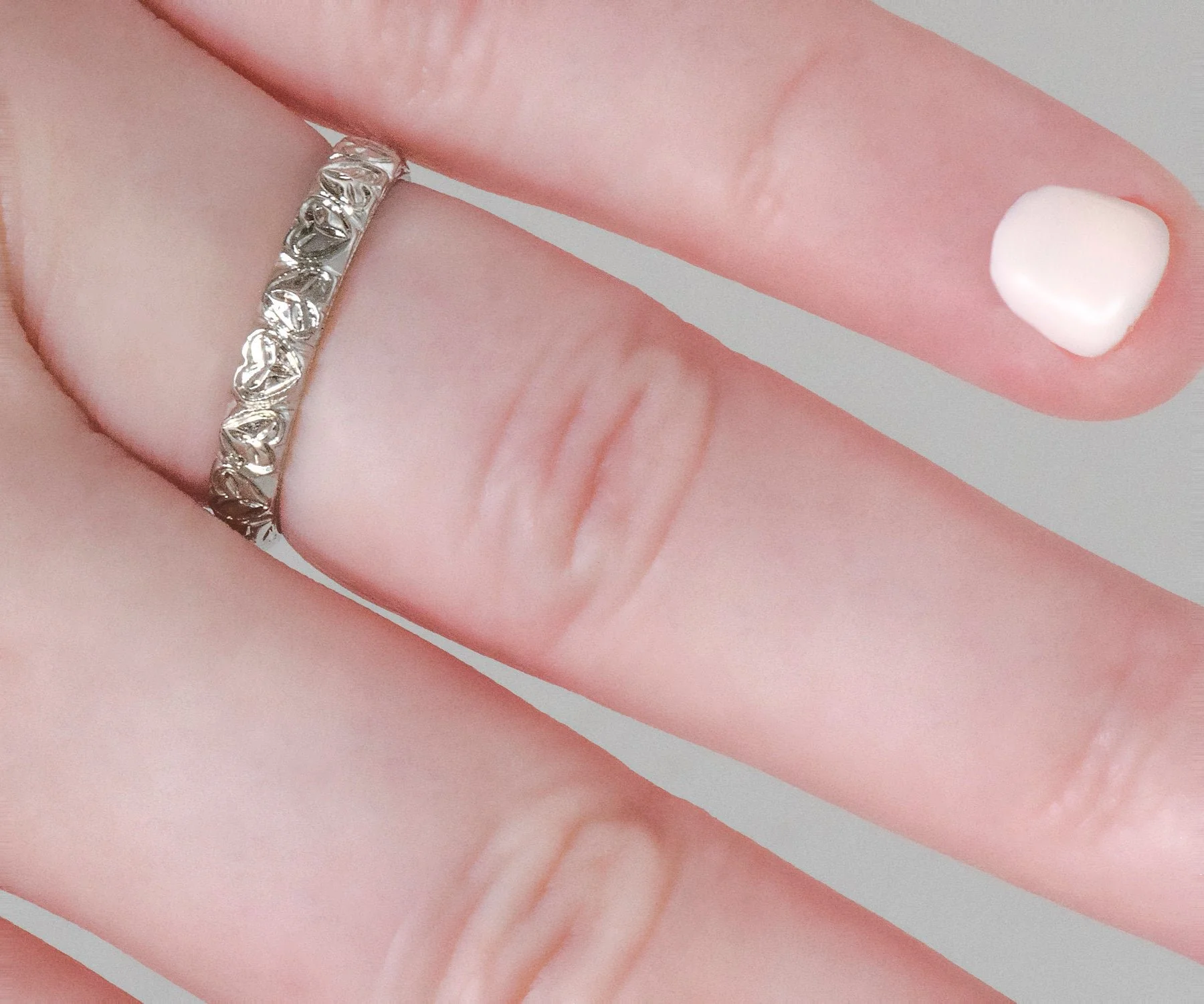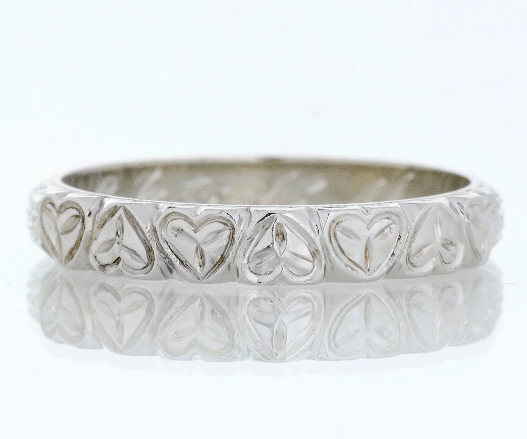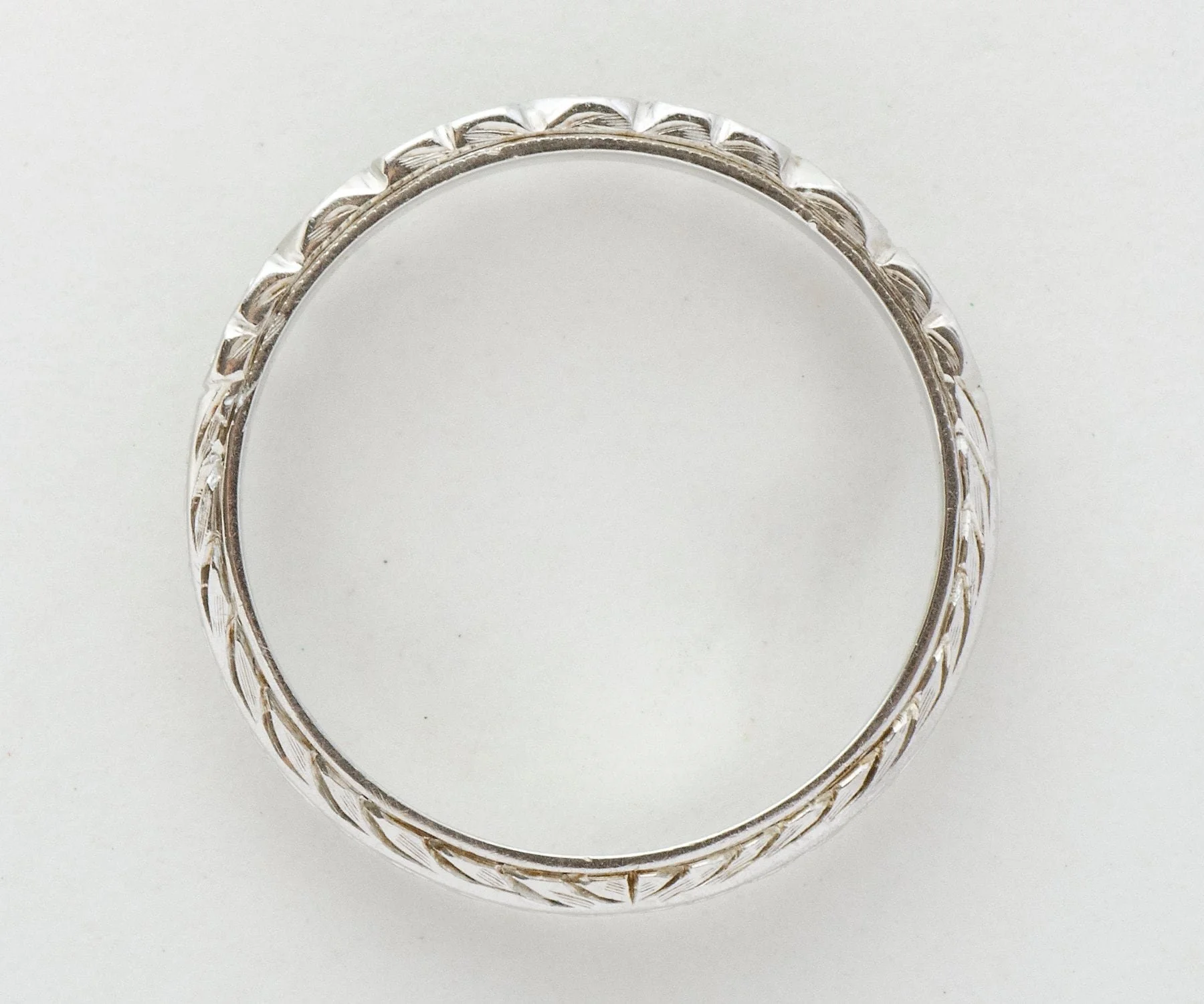 Romantic heart engraved pattern on one side and the meaningful wheat pattern on the other! Engraving still visible on this 18k white gold antique wedding band and we love to see that in our shop! The wheat pattern was thought to signify a few things including a bountiful harvest, a connection to the natural world and fertility!