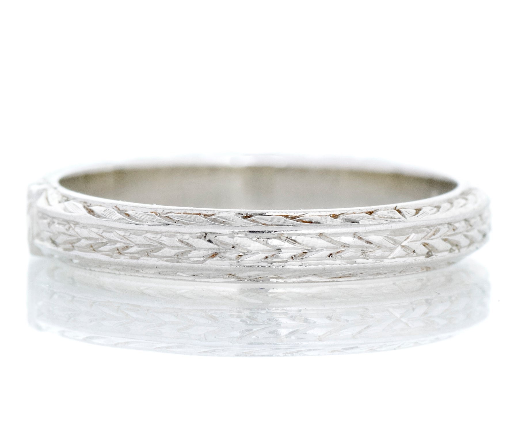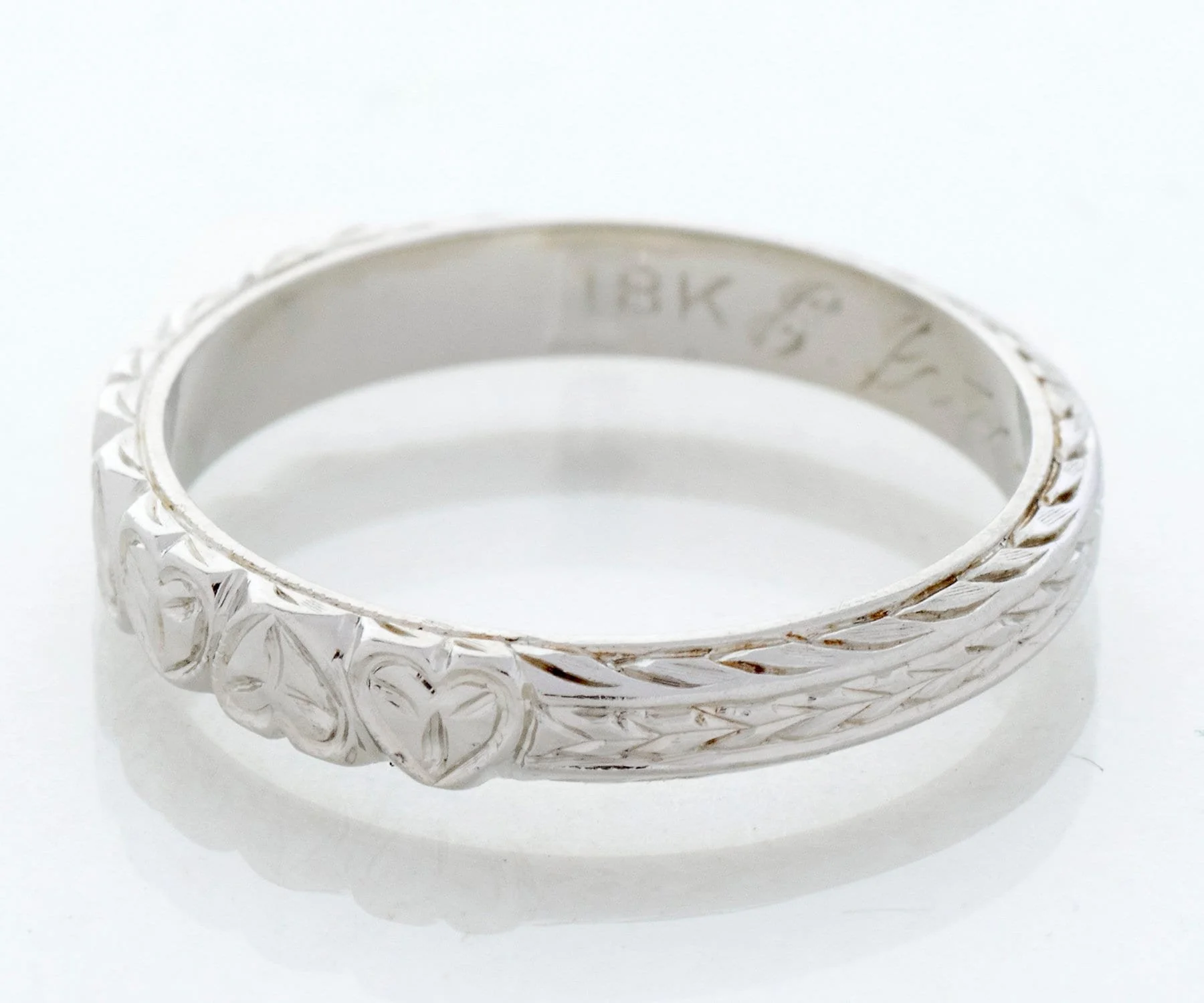 Antique Wedding Band - Antique 18k White Gold Split Pattern Dated "1929" Wedding Band 18k White Gold Hearts & Wheat Pattern Engraved "E.P. to H.M. 1-19-29" Ring Size 5.5 Band measures approximately 3mm wide.