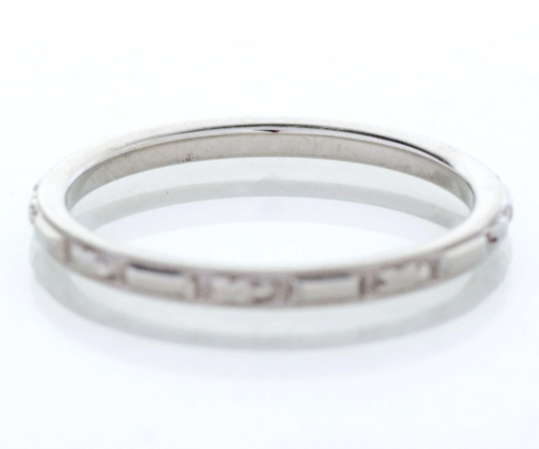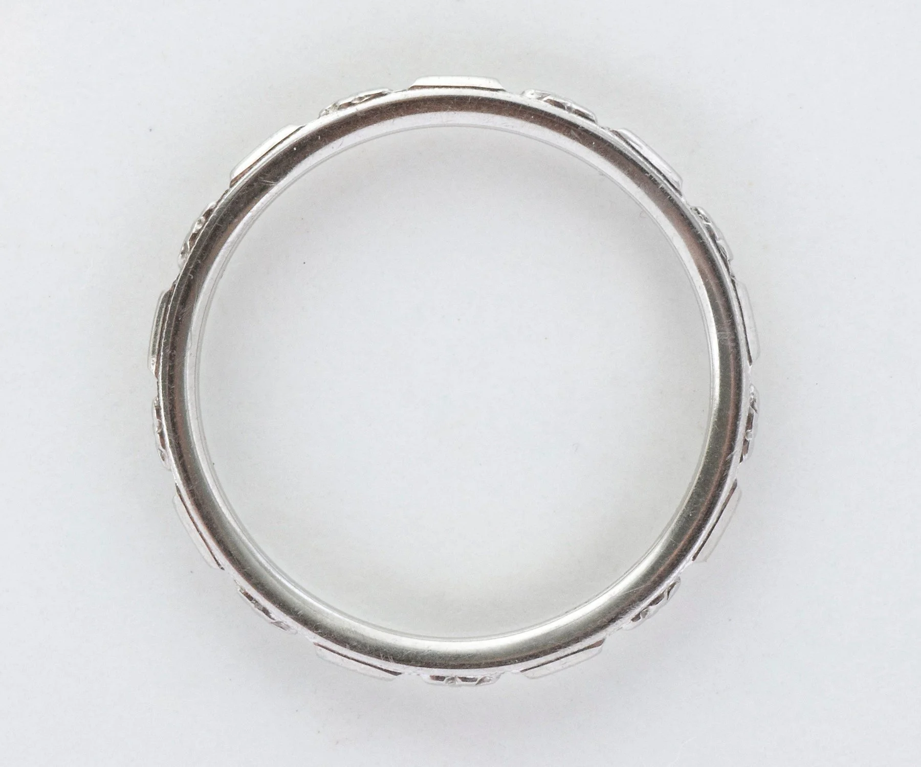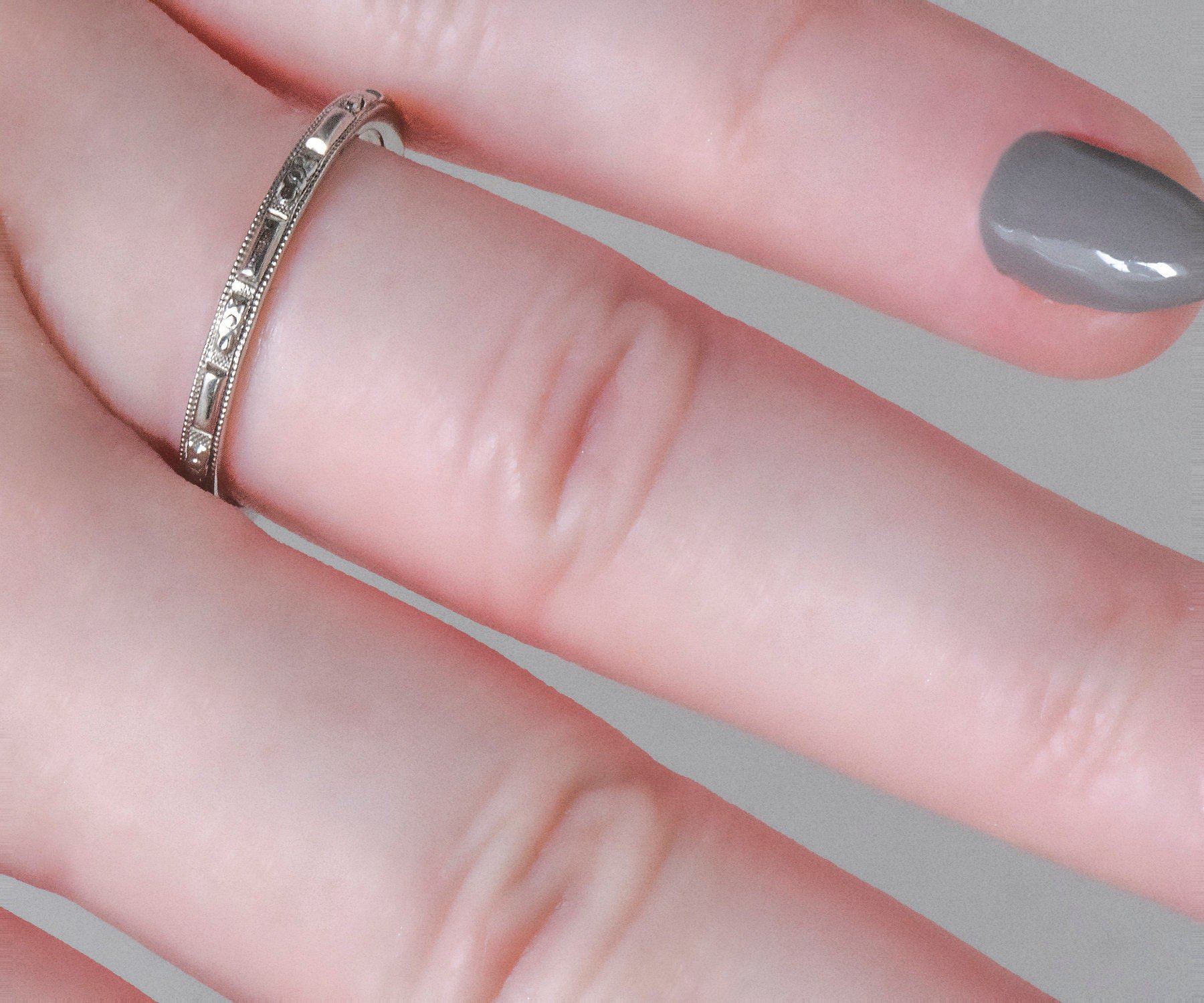With an intermittent crisp orange blossom pattern this 18k white gold Traub antique wedding band will make a lovely statement on your hand. On its own this ring will be dainty and beautiful, or pair it up with your engagement ring of any era. Consider it as well as your right-handed ring, perhaps along with other stacking rings, be they modern or antique.