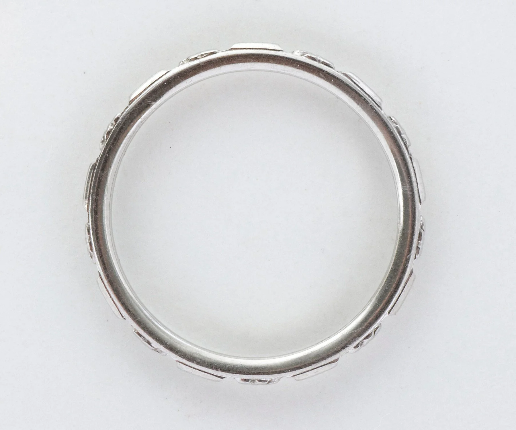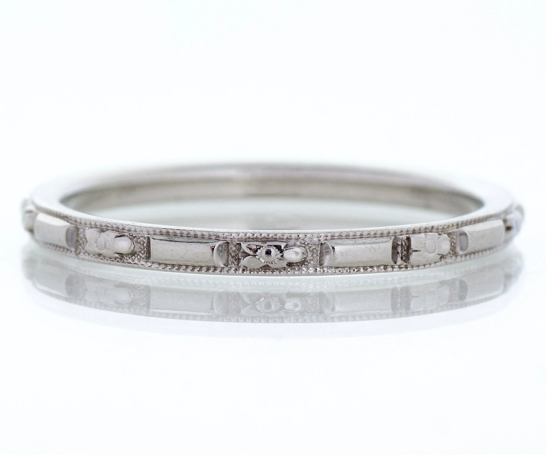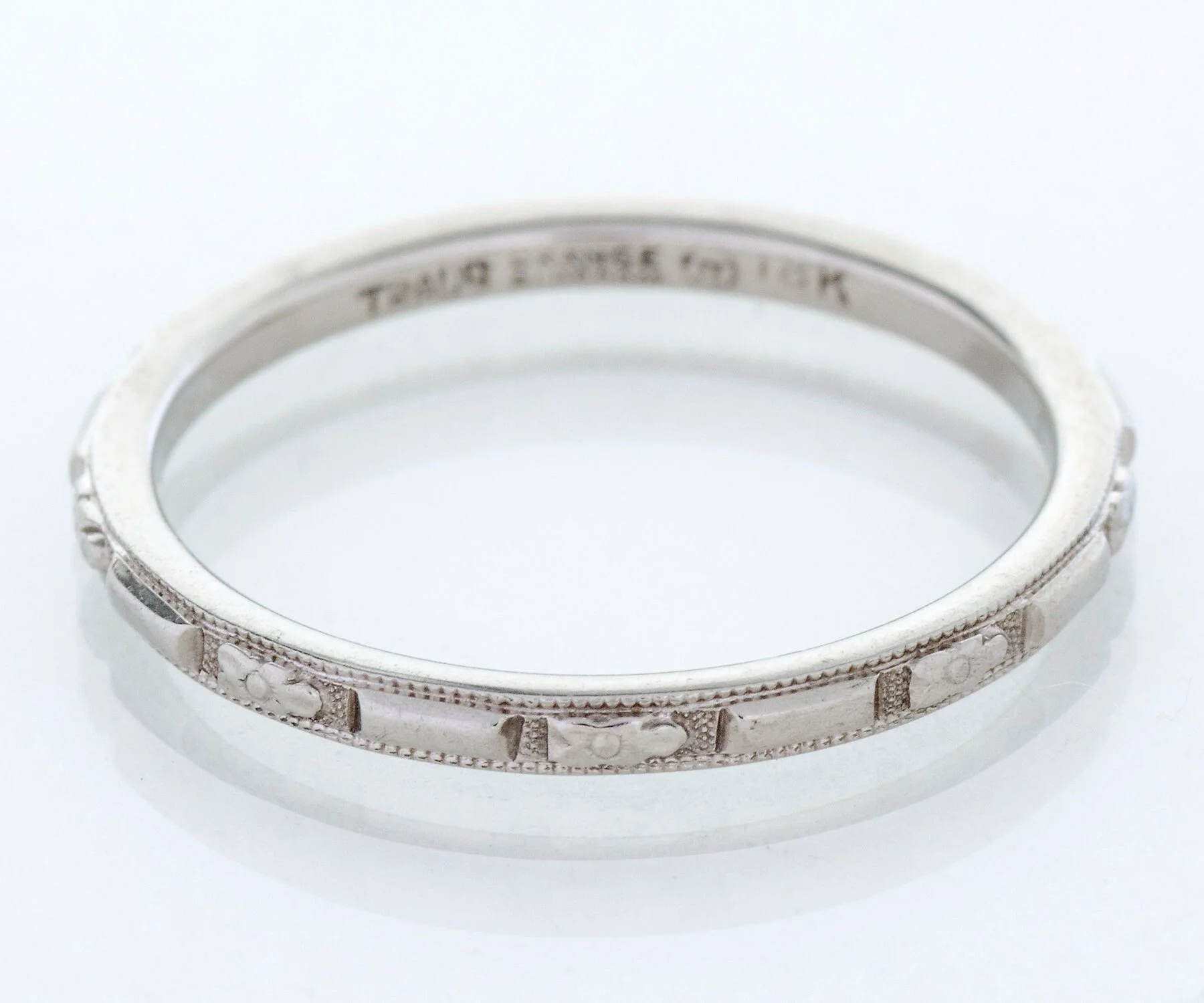 With an intermittent crisp orange blossom pattern this 18k white gold Traub antique wedding band will make a lovely statement on your hand. On its own this ring will be dainty and beautiful, or pair it up with your engagement ring of any era. Consider it as well as your right-handed ring, perhaps along with other stacking rings, be they modern or antique.