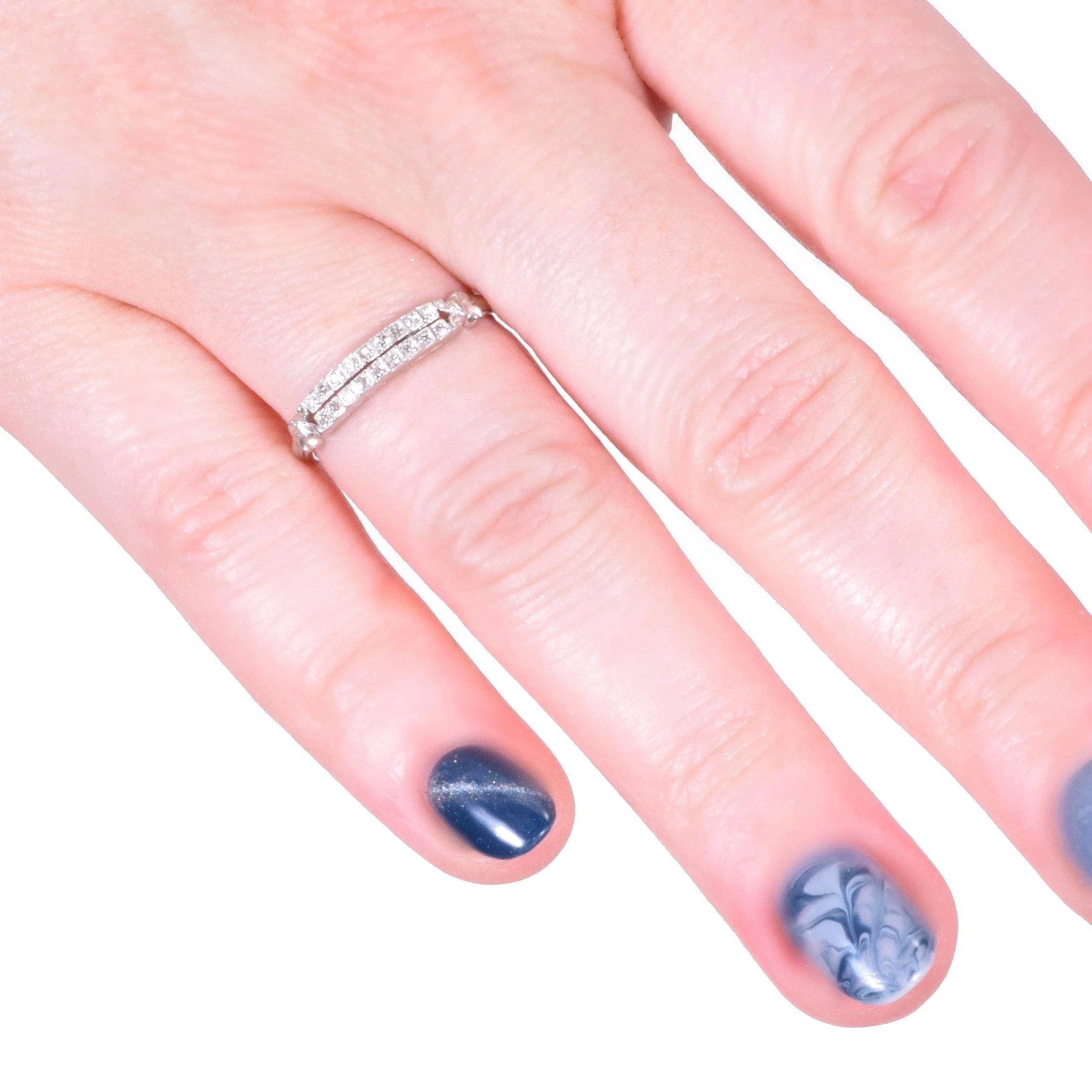 A double row of antique diamonds is really better than a single row, don't you think? A very eye-catching ring to say the least and it stands alone beautifully. Crafted in platinum with a total of .20 carats in a very nice quality featured in this beauty of an antique ring.