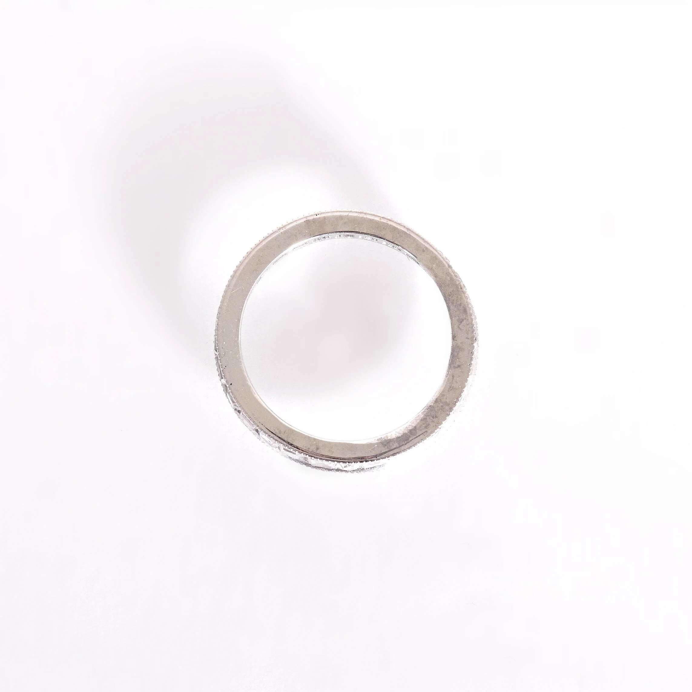 Substantial! Our Art Deco platinum and diamond eternity band is one that can not be ignored! Step cut diamonds at a total of 1.55 carats trail around the entirety of the band shimmering away like nobody's business. If we sound excited about this antique treasure, it's because we are! Hope you are a ring size 4.75, and if you are it's your lucky day!