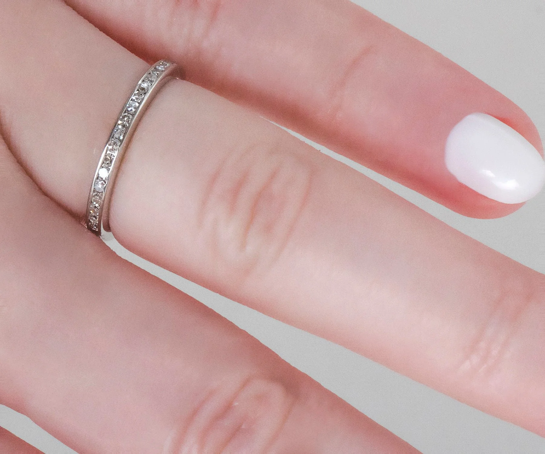 Our lovely Art Deco diamond eternity band is ready to beautify your hand! This platinum band holds 1/2 carat of sparkling diamonds and will look stunning all on its own or paired up alongside your engagement ring of any era. Or, wear this antique treasure on your right hand, alone or in combination with other bands, creating your own unique stacking combination.