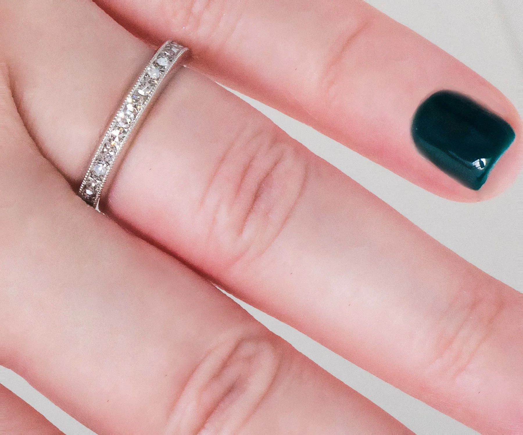 A carats worth of glorious diamonds are on display in this beautiful antique platinum wedding band with crisp milgrain edging on either side. This charming ring can stand alone or be paired up with your engagement ring of any era. Perfect as well for a special anniversary!