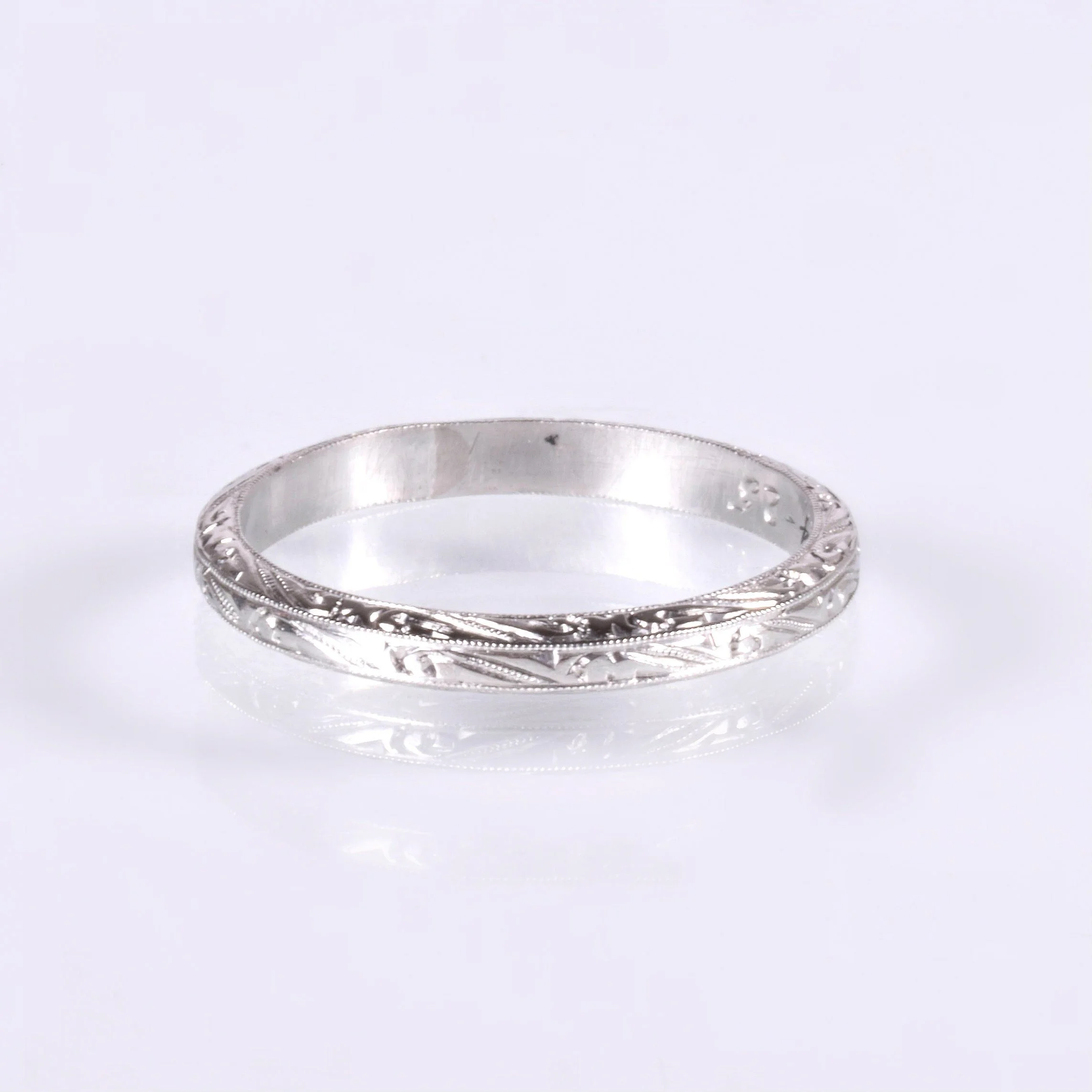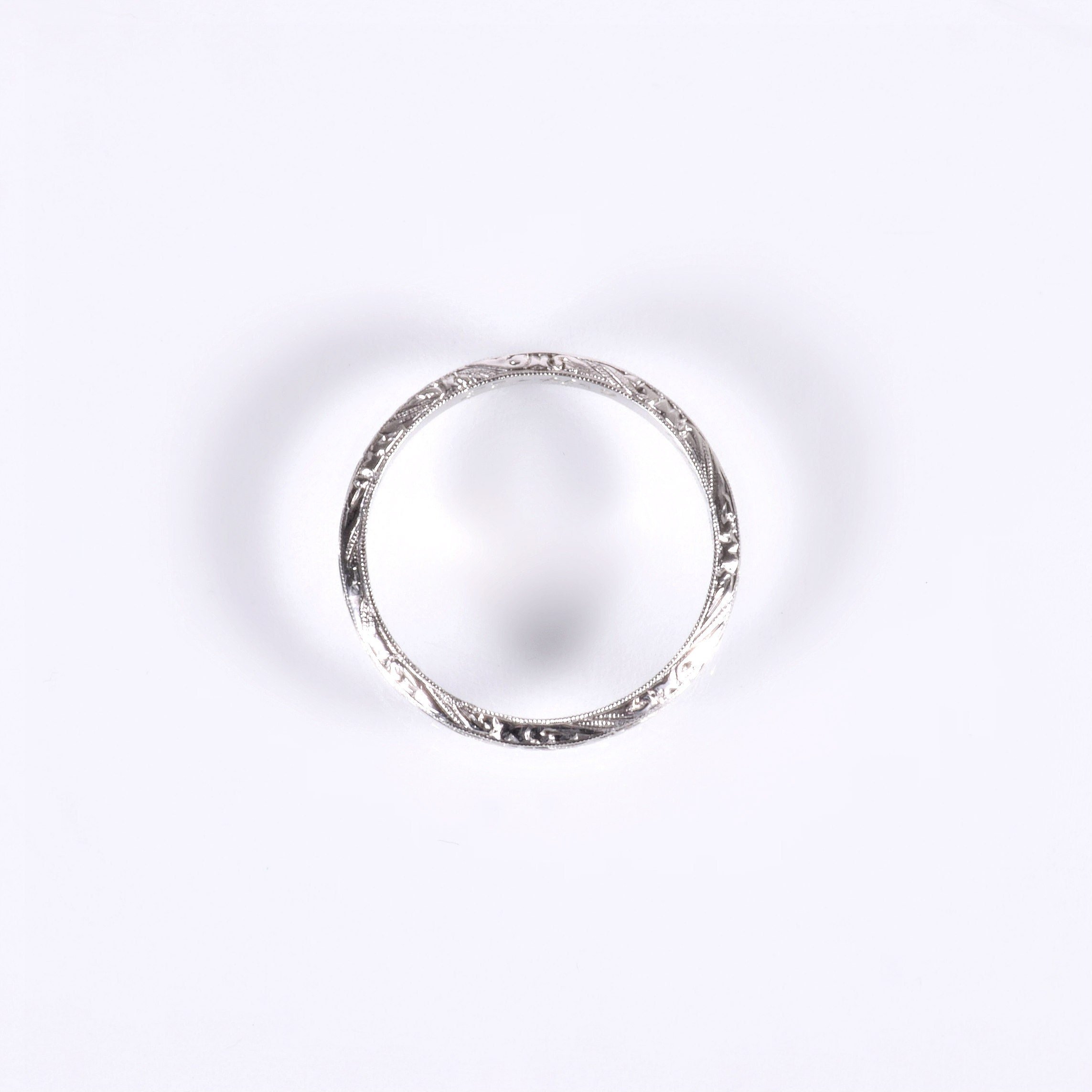 Just shy of 100 years old only by a few short months! We love when we see the original engraving on our antique pieces and this one includes both names and date. In strong, bright platinum a beautifully flowing pattern is displayed all around. Wear this little antique treasure on its own or alongside your engagement ring of any era.