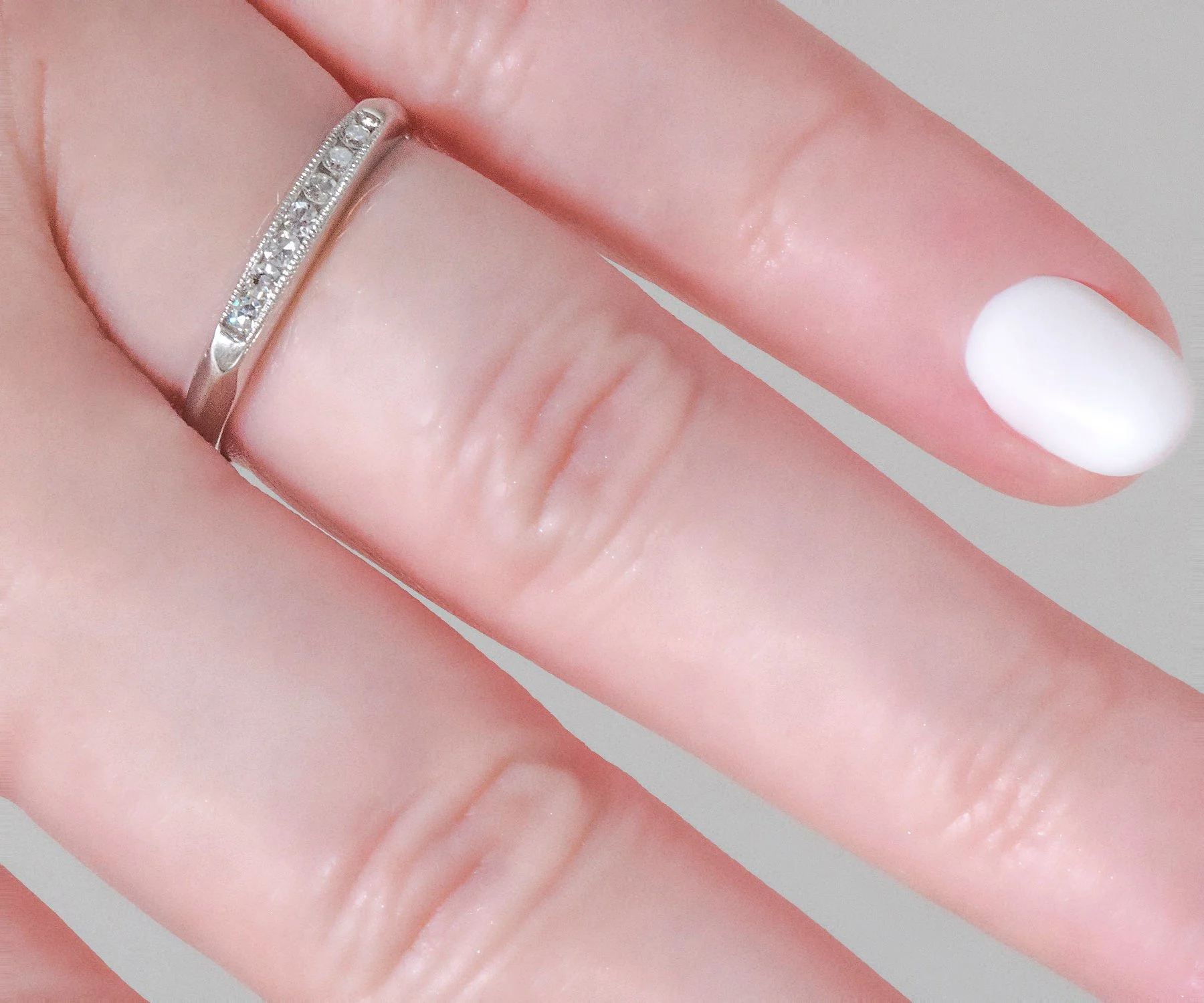 Seven lovely glistening diamonds spray the face of this beautiful platinum wedding band from the 1920's. This antique band can hold its own or pair it up with your engagement ring of any era. A perfect travel band as well, with just the right amount of sparkle!