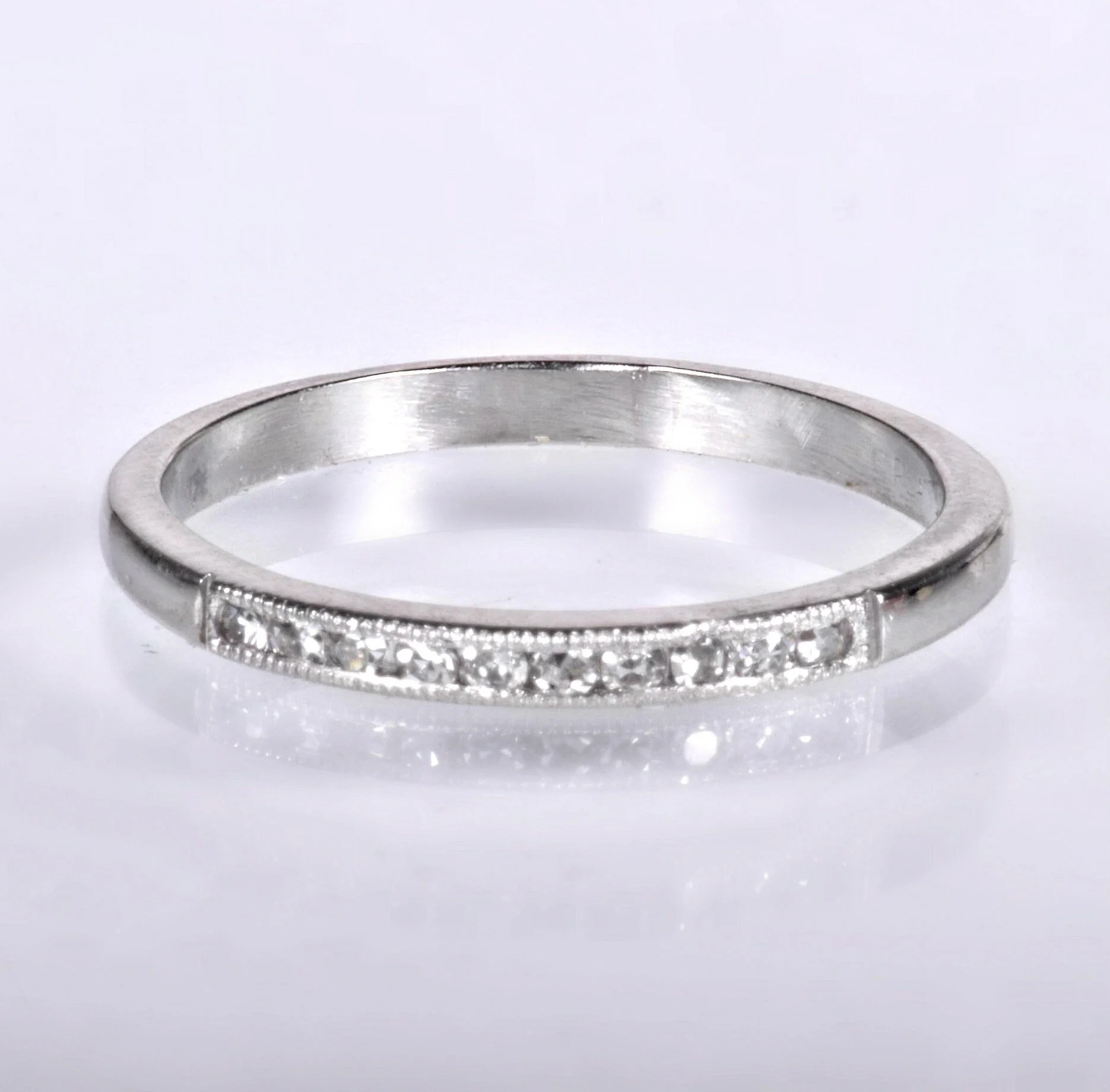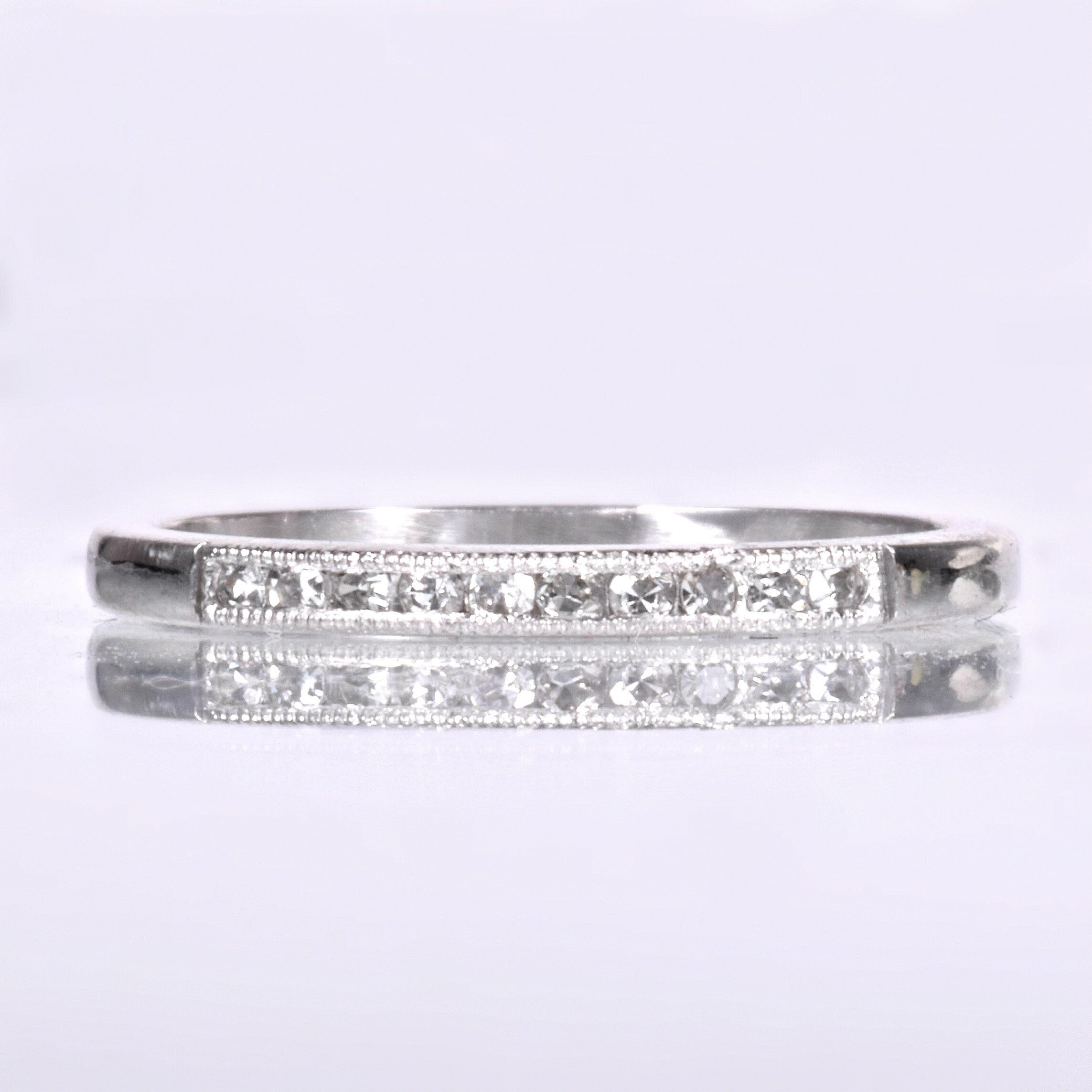 In strong platinum, this wedding band has truly stood the test of time. Ten flickering diamonds sit across the face of this antique knockout, all framed in fine milgrain. The shank is high polished. This is a beautiful choice to wear alone, right or left hand, alongside your engagement ring of any era, or a unique addition to your personal stacking combination.