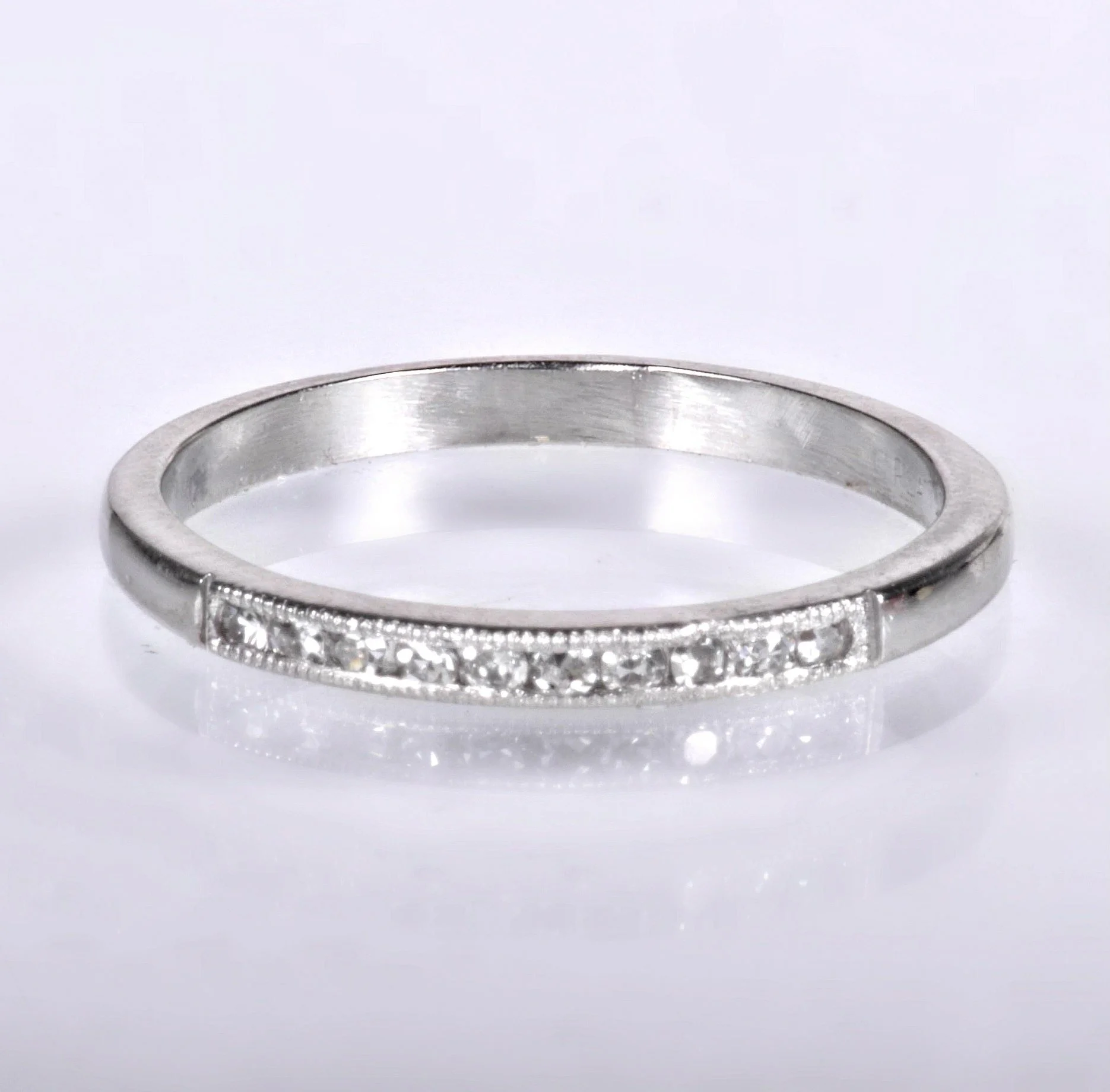 Sharp and classic is this antique platinum diamond wedding band. Ten shimmering diamonds are sprayed across the face of this beauty all framed within fine milgrain finishing. Wear it alone, alongside your engagement ring of any era or as the vintage portion of your eclectic stacking combination!