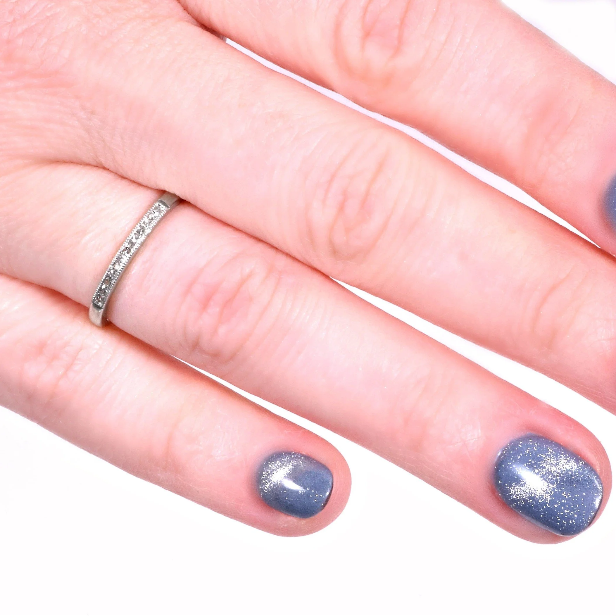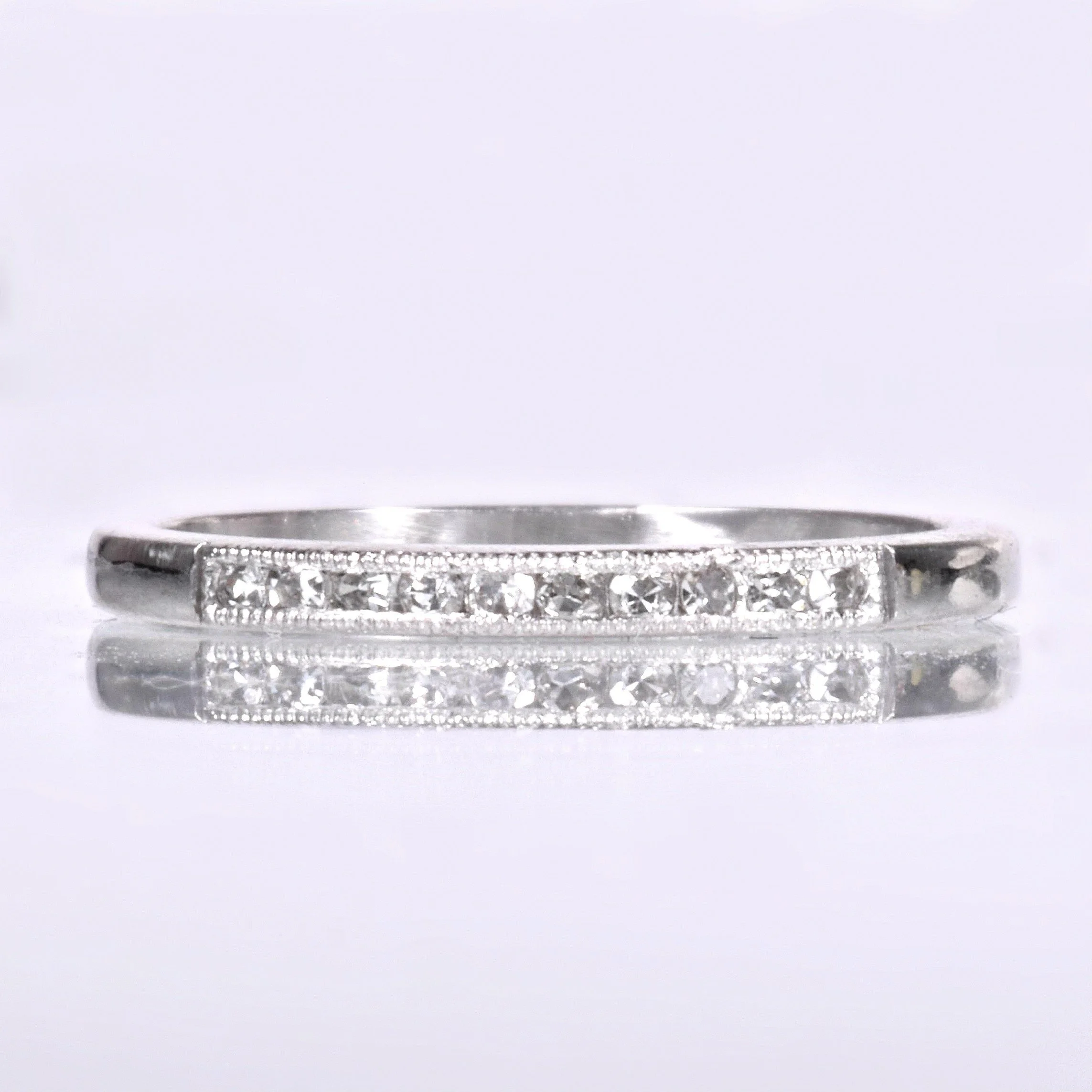 Sharp and classic is this antique platinum diamond wedding band. Ten shimmering diamonds are sprayed across the face of this beauty all framed within fine milgrain finishing. Wear it alone, alongside your engagement ring of any era or as the vintage portion of your eclectic stacking combination!