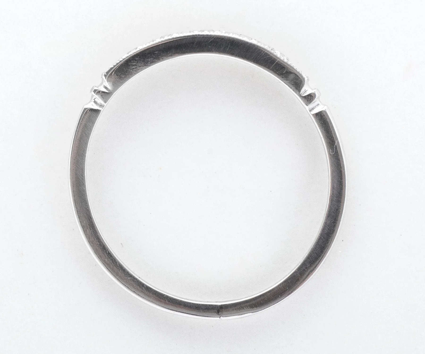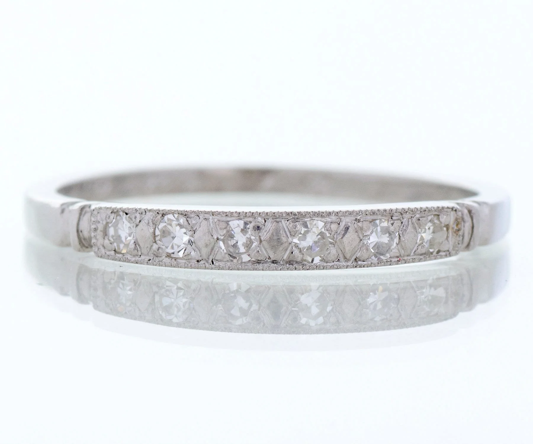 In strong platinum, this 1930's era wedding band has lived a long life but is ready to begin a new one with you! Six tiny diamonds and milgrain edges call attention to this very pretty antique band. Wear it alone or coupled with your engagement ring of any era.