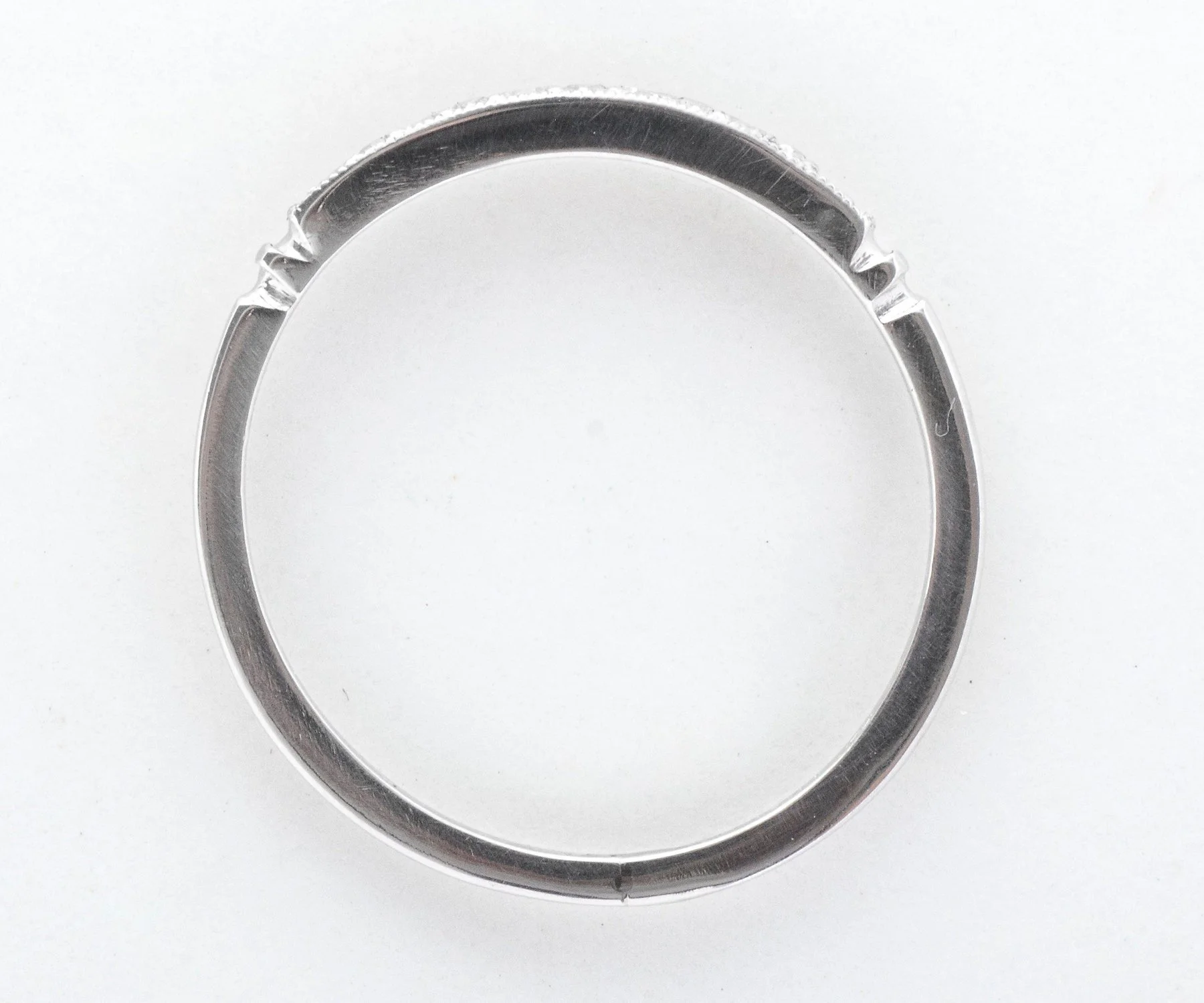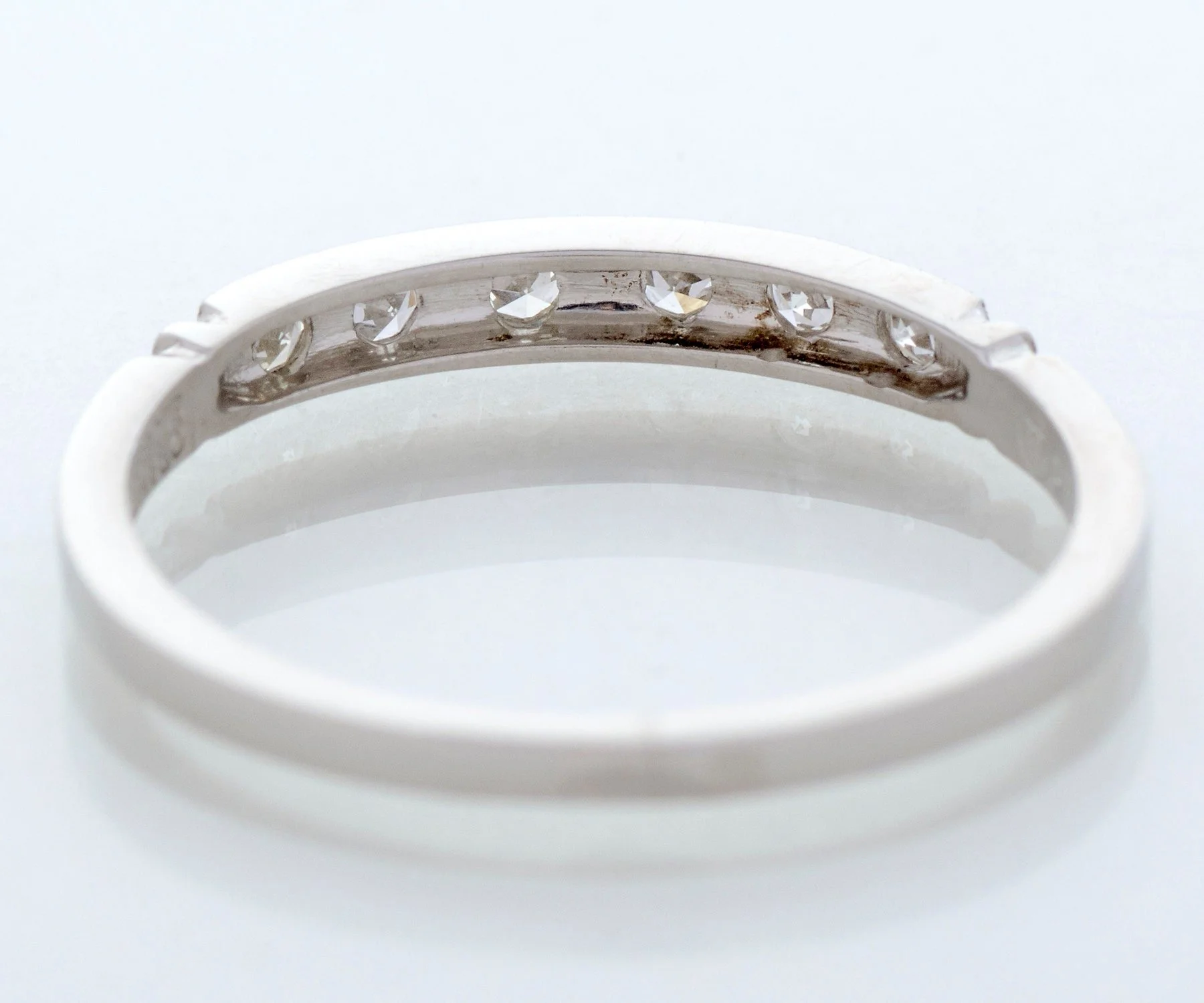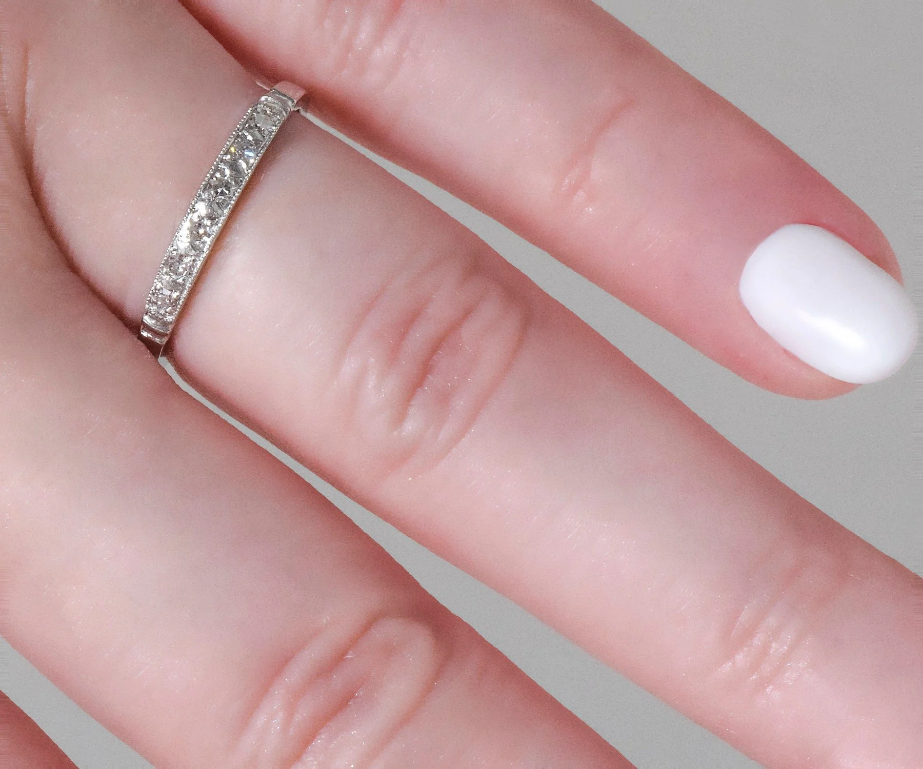 In strong platinum, this 1930's era wedding band has lived a long life but is ready to begin a new one with you! Six tiny diamonds and milgrain edges call attention to this very pretty antique band. Wear it alone or coupled with your engagement ring of any era.