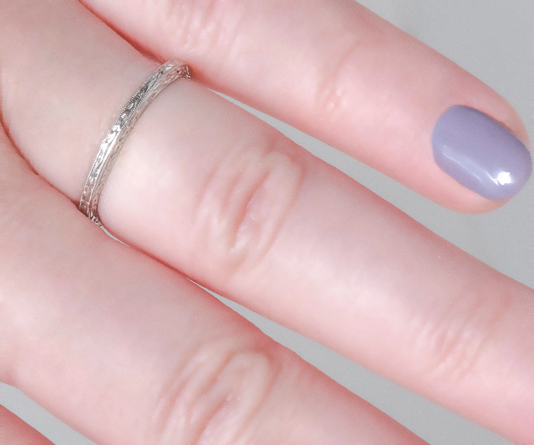 Crisp details adorn this lovely platinum wedding band that can be seen at every angle. This little beauty will pair well with your engagement ring of any era, be worn alone or as the antique portion of your personal and eclectic stacking combination.