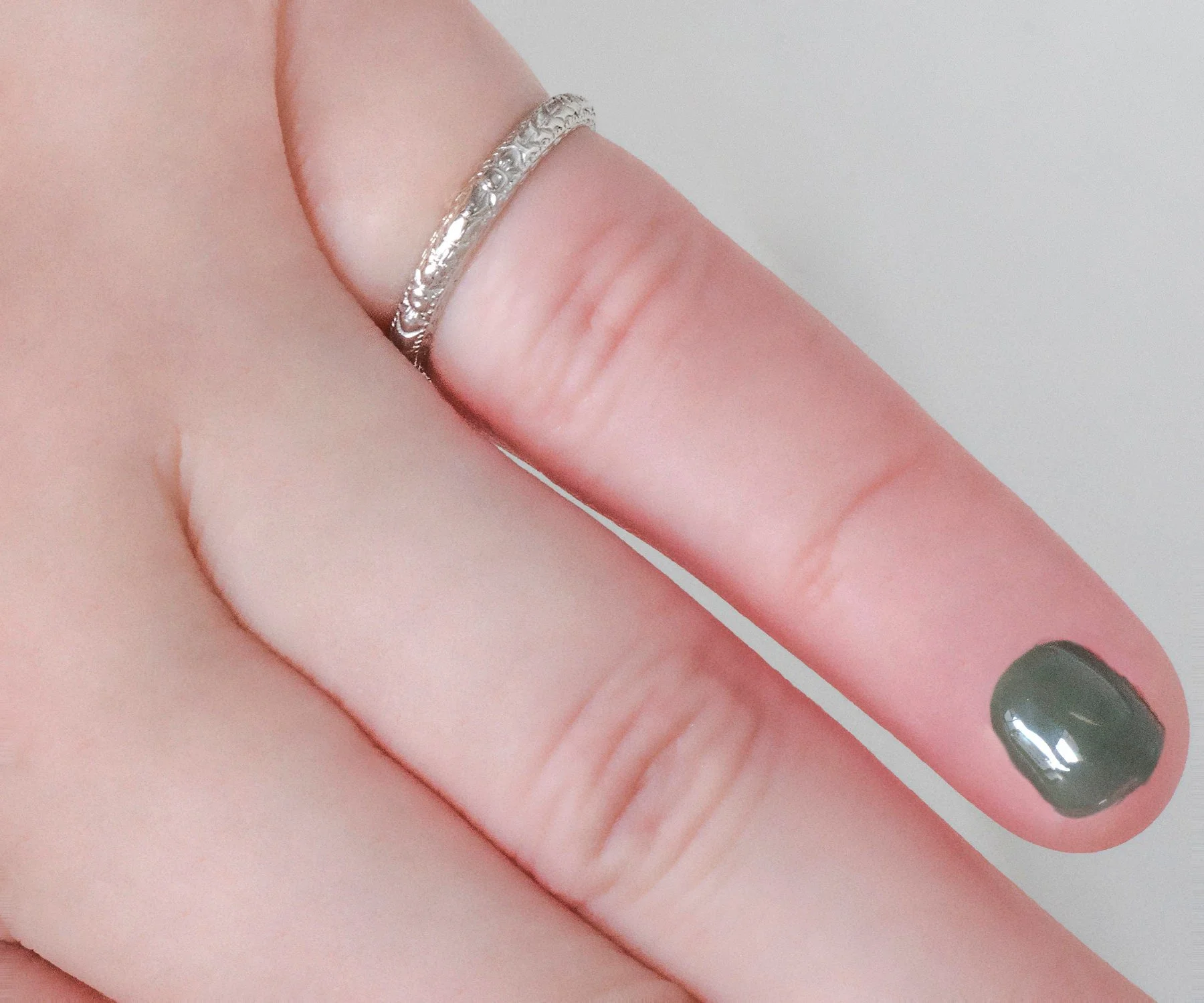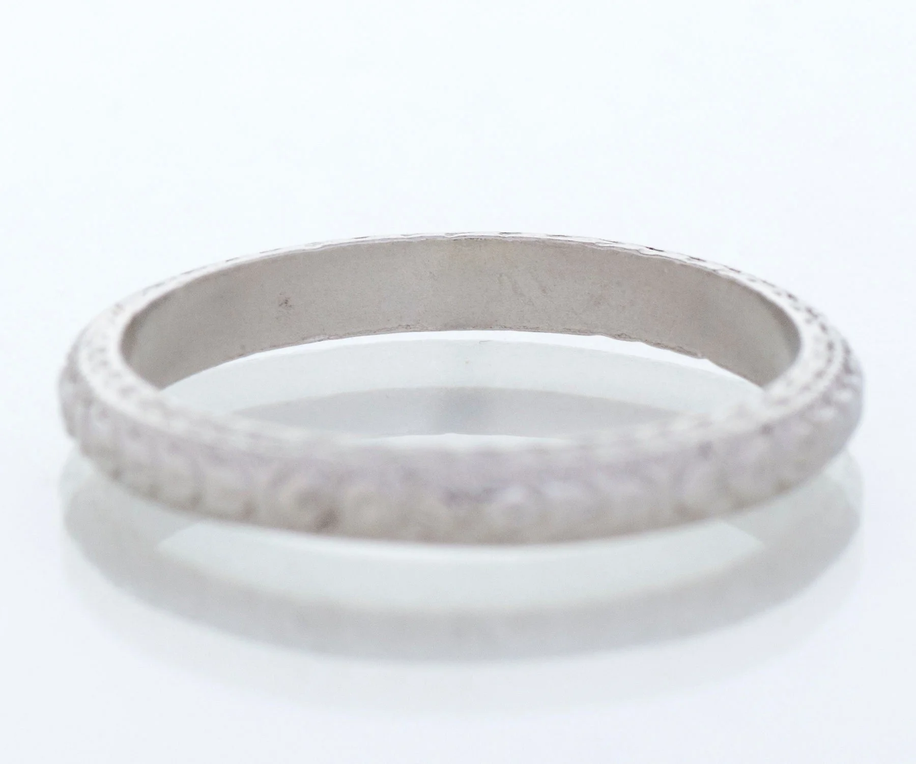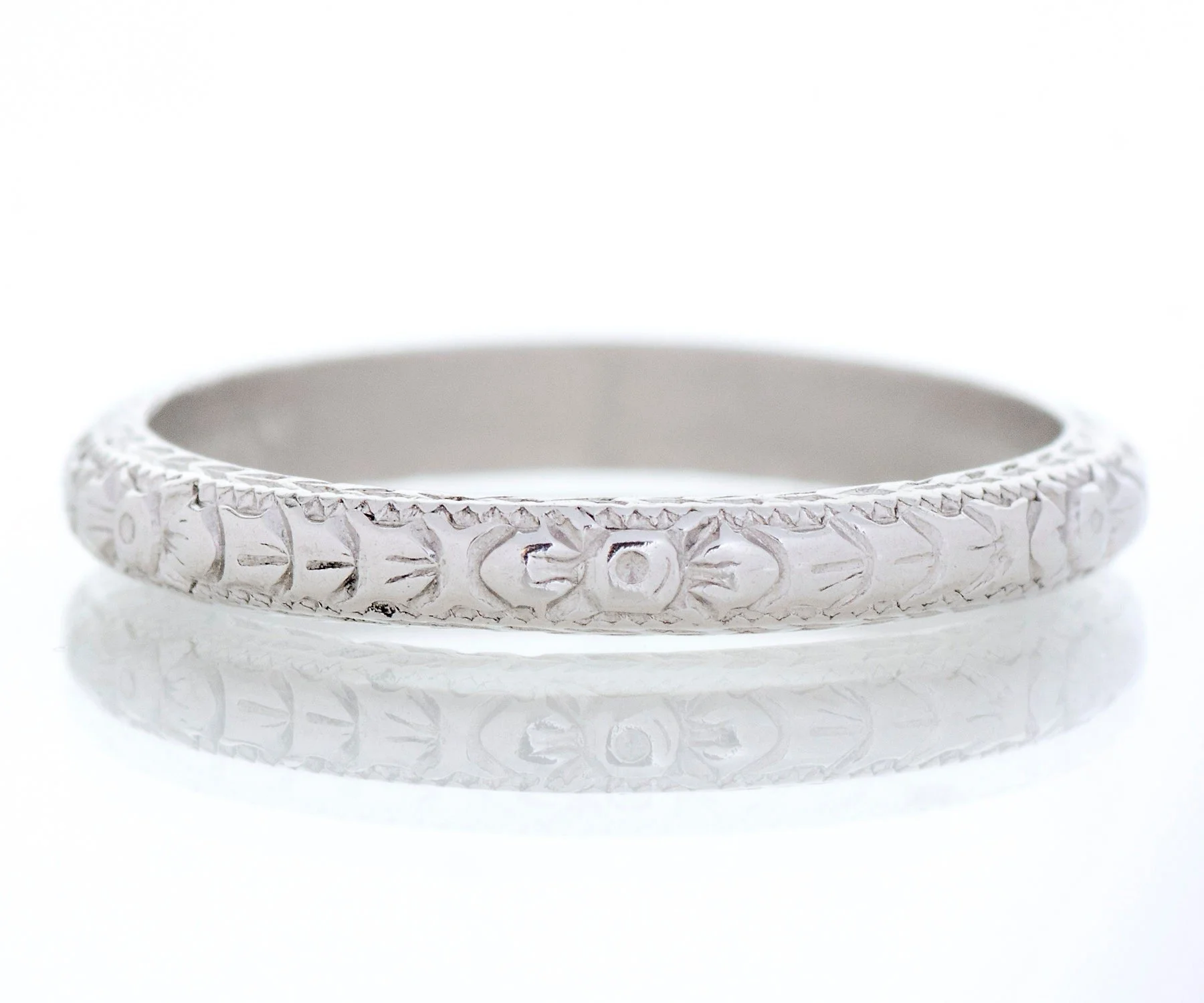 A pretty, crisp engraved pattern surrounds this lovely antique platinum wedding band. Wear it alone, alongside your engagement ring of any era or as part of your personal, unique stacking combination.