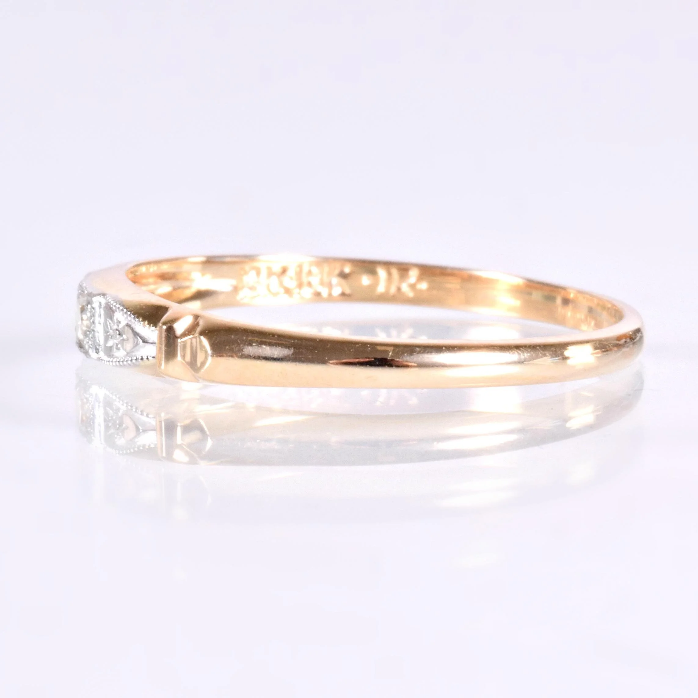 Pretty as a picture is this charmer of an antique diamond band! Bright and bold for its demure size, at the center sits a dynamo of a tiny diamond flanked by 18k white gold engraved sections all of which are outlined in fine milgrain. The remainder of the band is bright and beaming 14k yellow gold. This one is definitely an eye-catcher