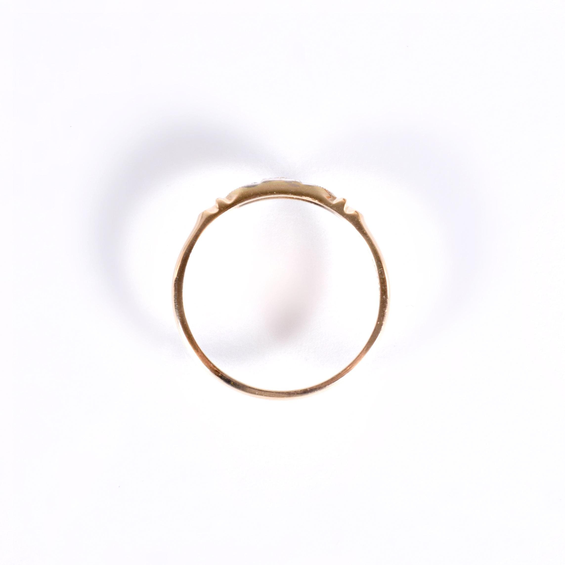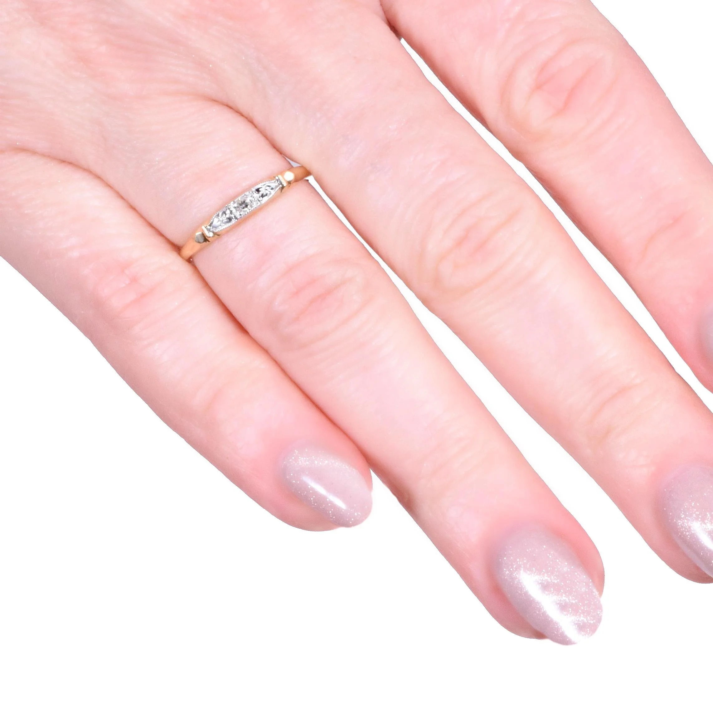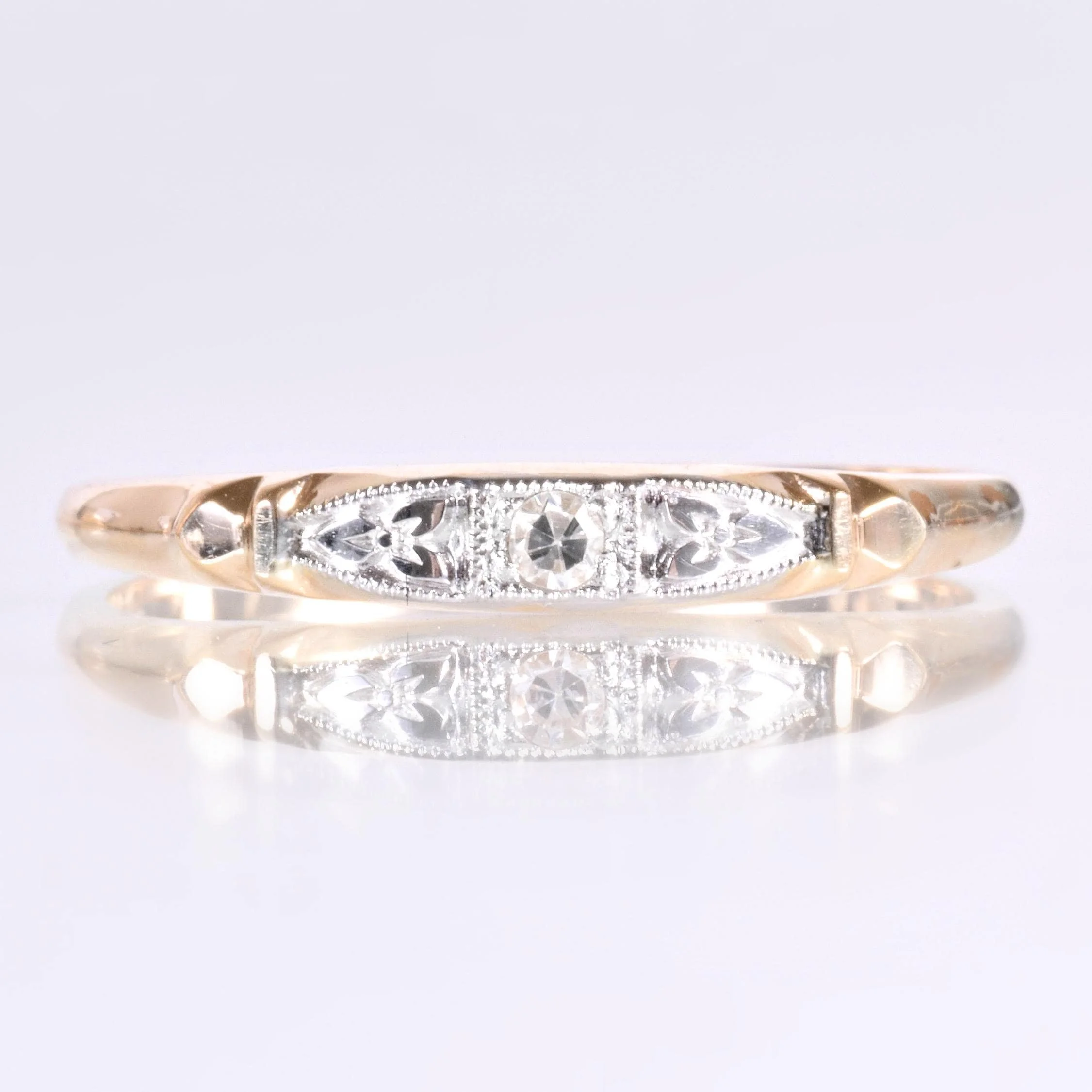 Pretty as a picture is this charmer of an antique diamond band! Bright and bold for its demure size, at the center sits a dynamo of a tiny diamond flanked by 18k white gold engraved sections all of which are outlined in fine milgrain. The remainder of the band is bright and beaming 14k yellow gold. This one is definitely an eye-catcher