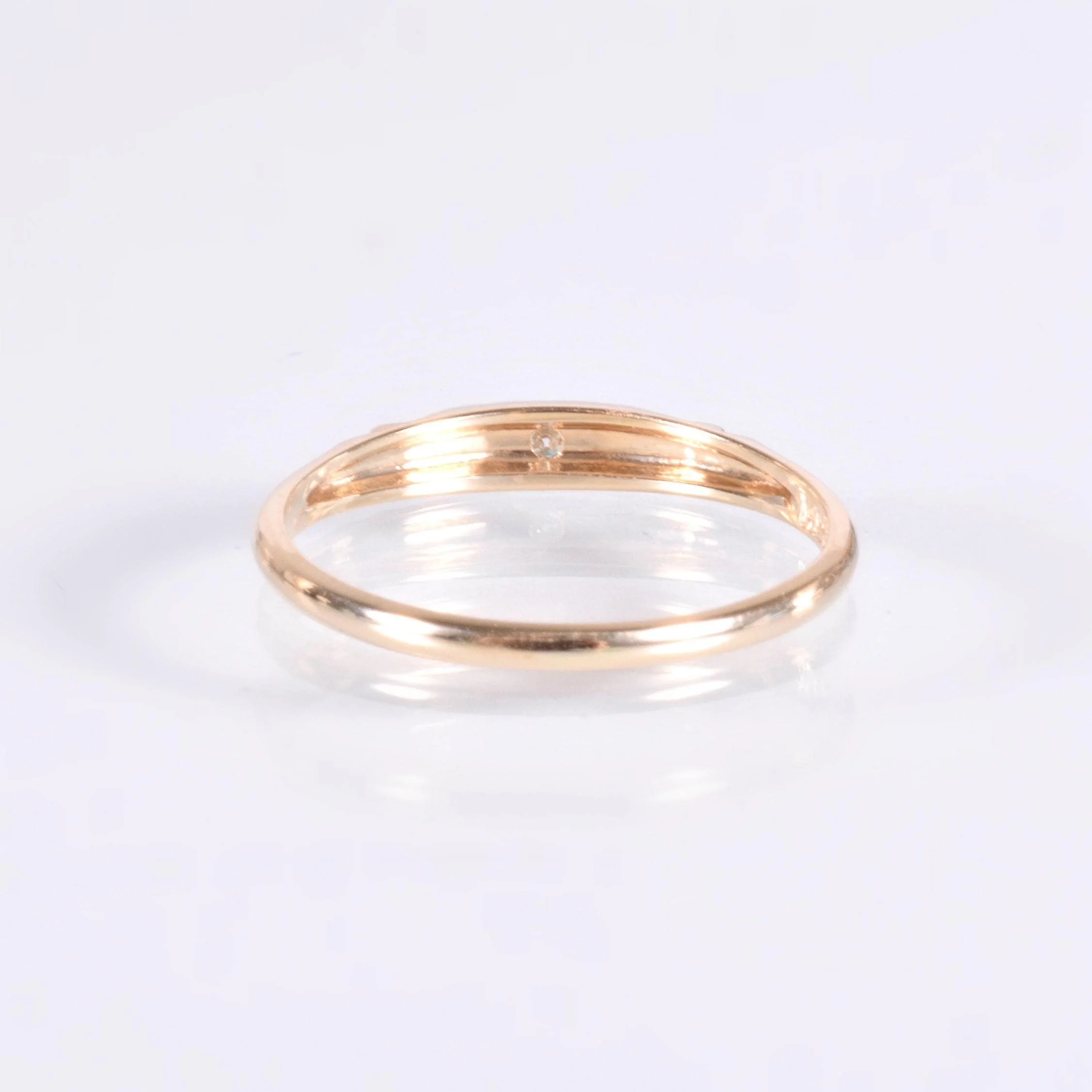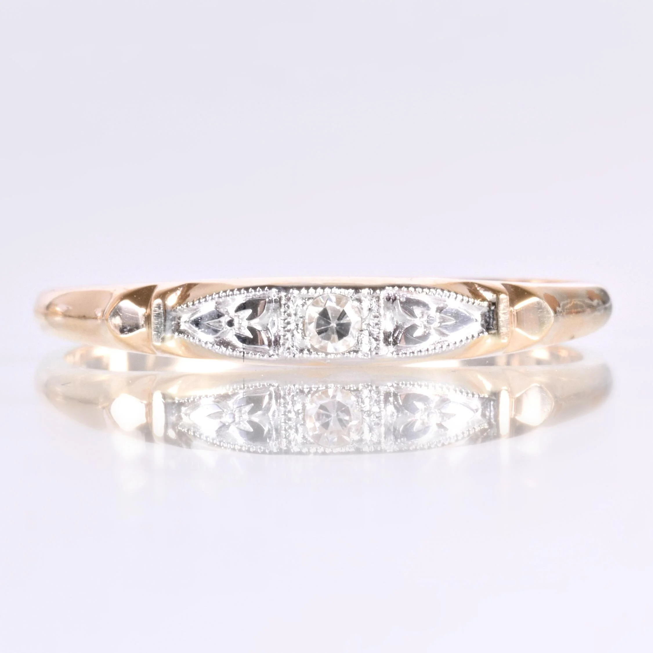 Pretty as a picture is this charmer of an antique diamond band! Bright and bold for its demure size, at the center sits a dynamo of a tiny diamond flanked by 18k white gold engraved sections all of which are outlined in fine milgrain. The remainder of the band is bright and beaming 14k yellow gold. This one is definitely an eye-catcher