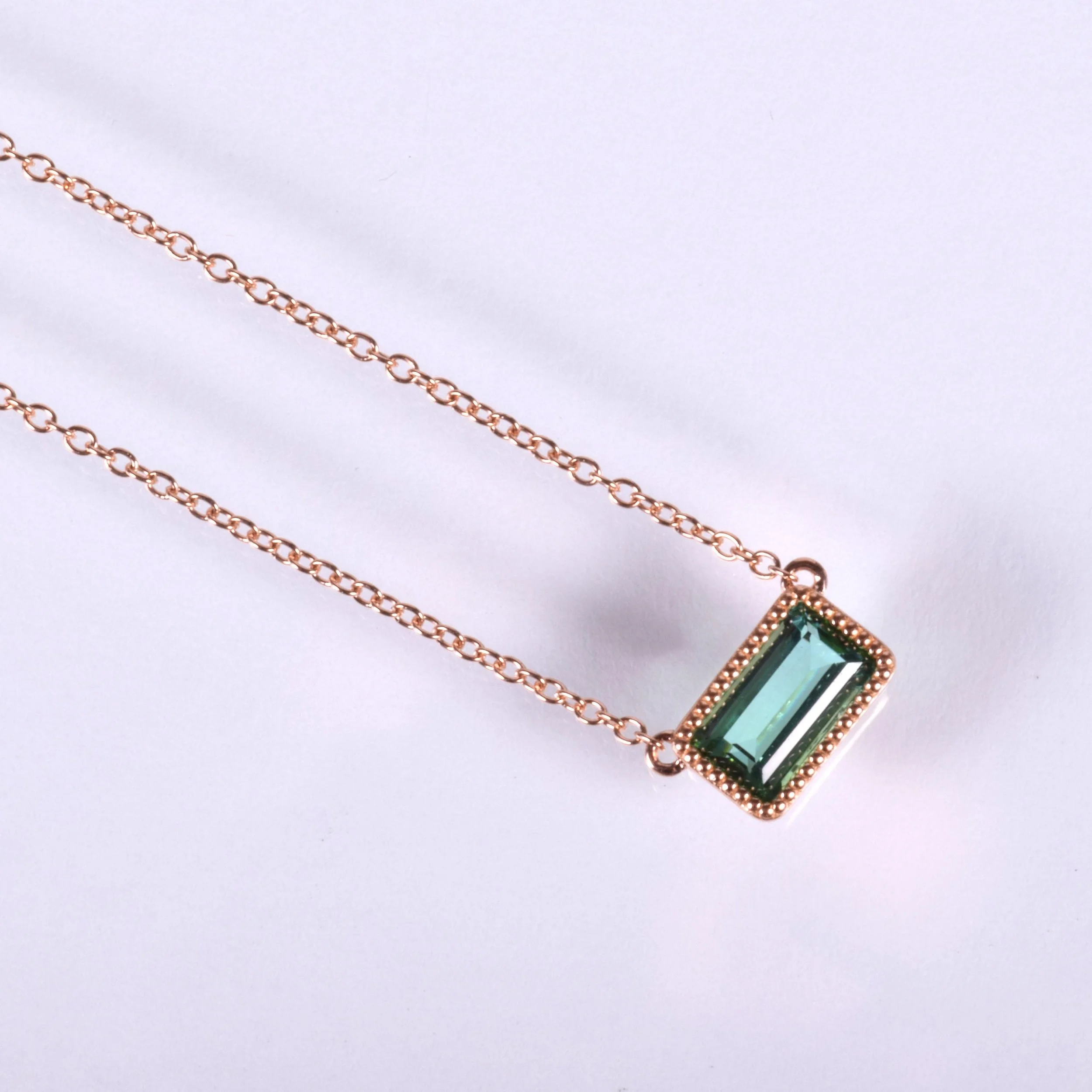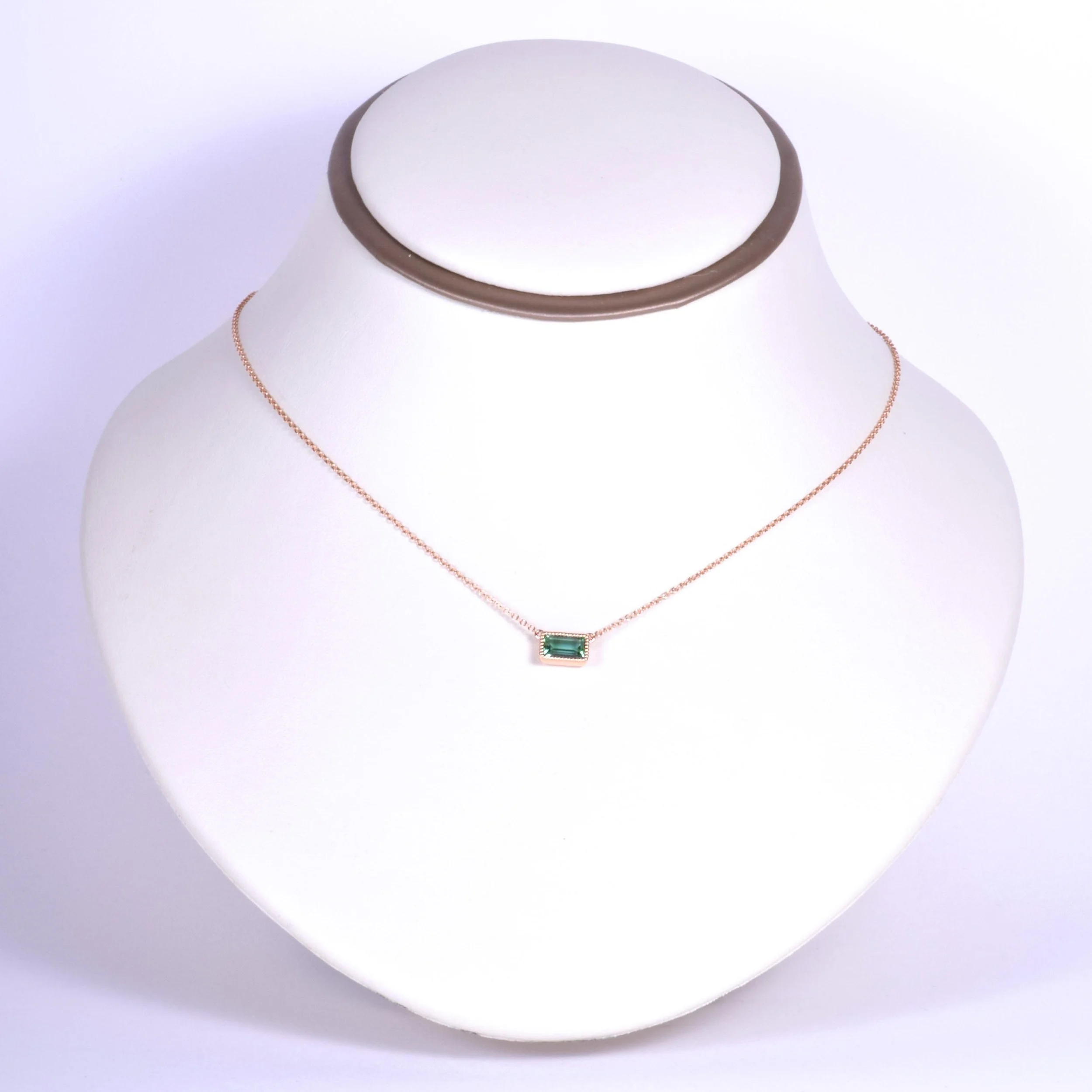 This simple, but classic 18k rose gold necklace can go with you just about anywhere! Designed in house and crafted in Italy, we couldn't be happier as to how this piece turned out. We chose to showcase a gorgeous indicolite tourmaline in this necklace and you can see why! Adding the beaded framework around the bezel set gemstone only accentuates the piece more. The combination of the rose gold setting with the blue-green indicolite is just divine! Wear this lovely necklace on its own or layered with other complimentary necklaces.