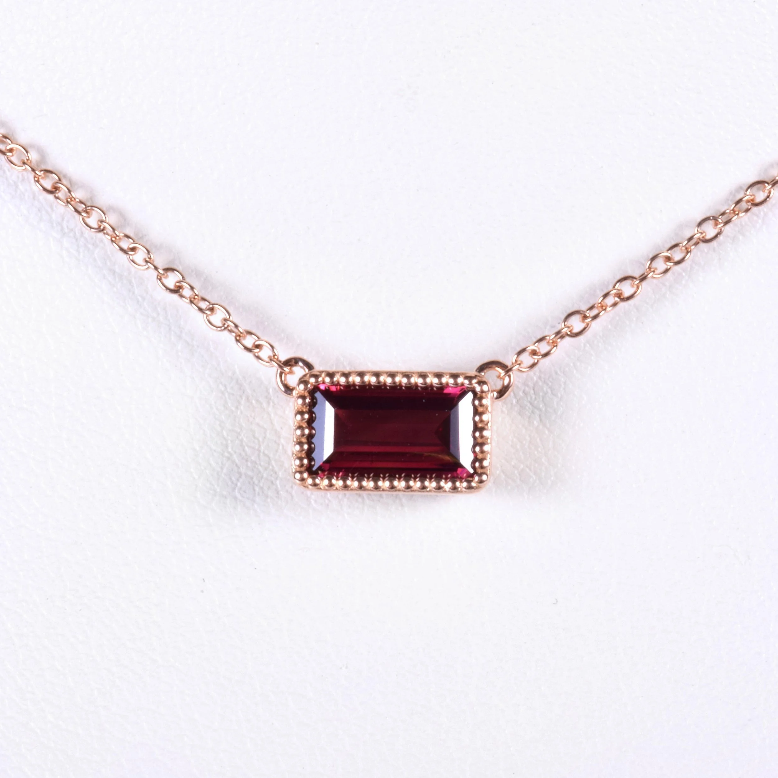 This simple, but classic 18k rose gold necklace can go with you just about anywhere! Designed in house and crafted in Italy, we couldn't be happier as to how this piece turned out. We chose to showcase a stunning rubellite tourmaline in this necklace and you can see why! Adding the beaded framework around the bezel set gemstone only accentuates the piece more. The combination of the rose gold setting with the red tourmaline is a perfect marriage! Wear this lovely necklace on its own or layered with other complimentary necklaces.