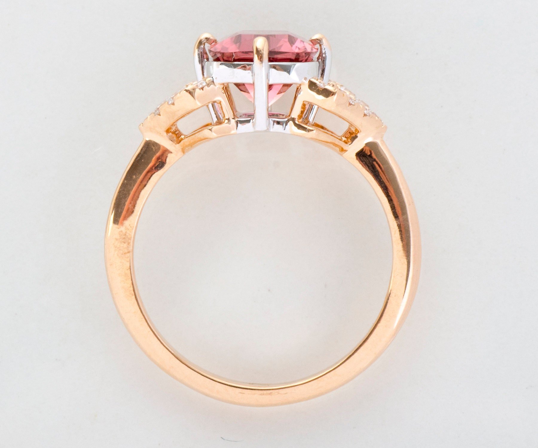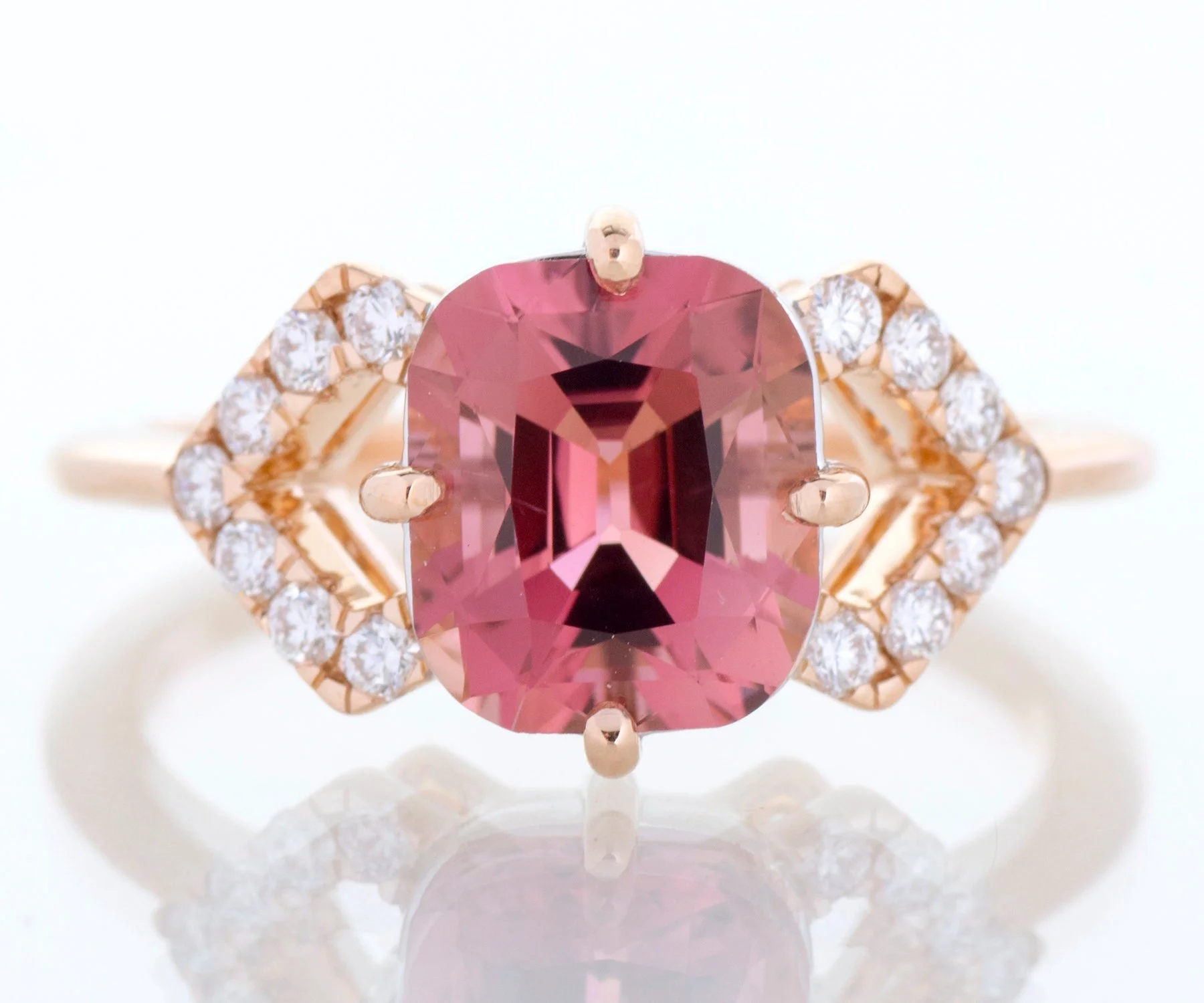 This dazzling beauty comes directly from the creative mind of our in house designer and our amazing fabricator in Italy. We just love how it this ring turned out! In luscious 18k rose gold with diamond filled decorative and angled shoulders, this ring holds at its center a spectacular cushion cut pink tourmaline. What a yummy color!