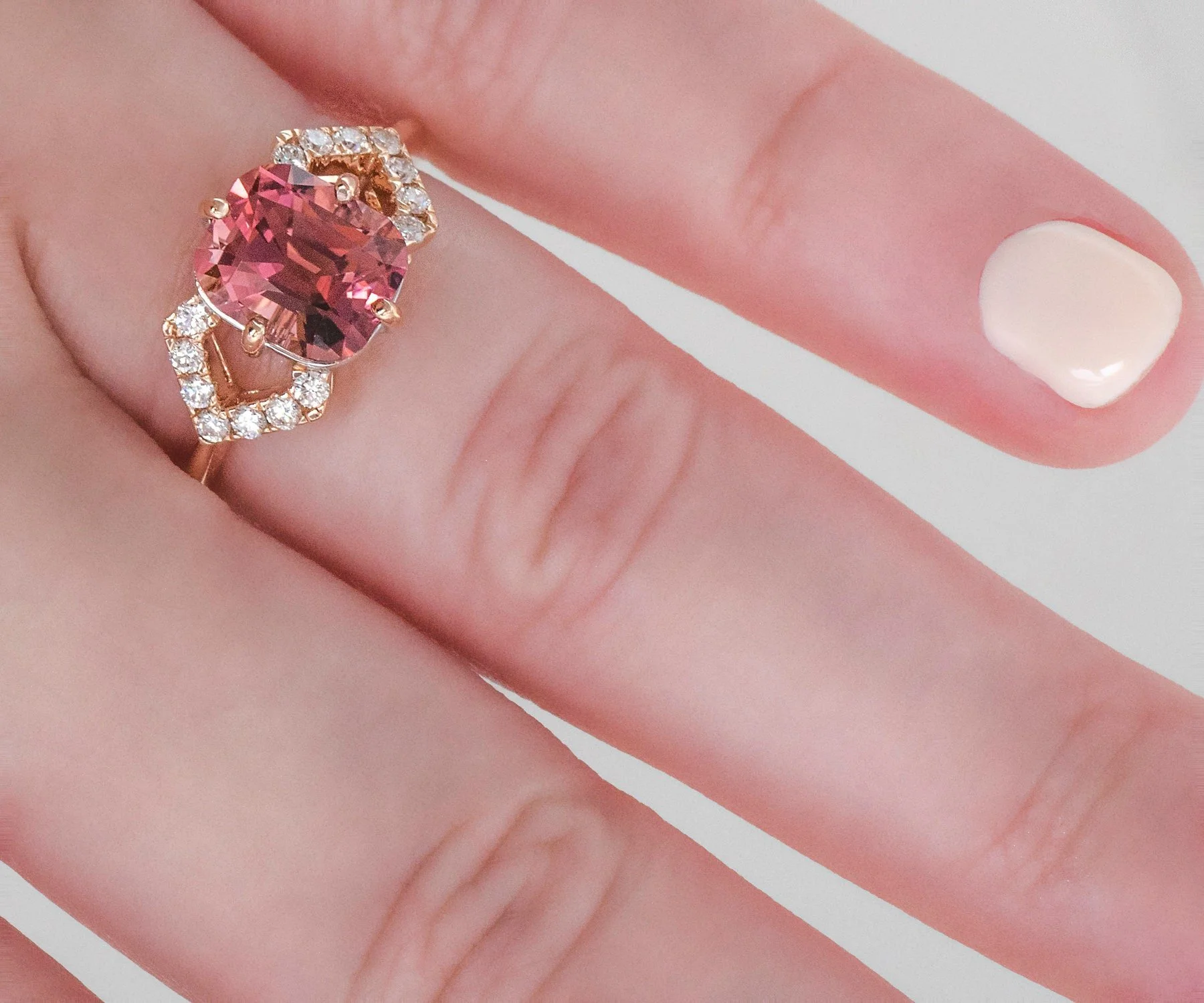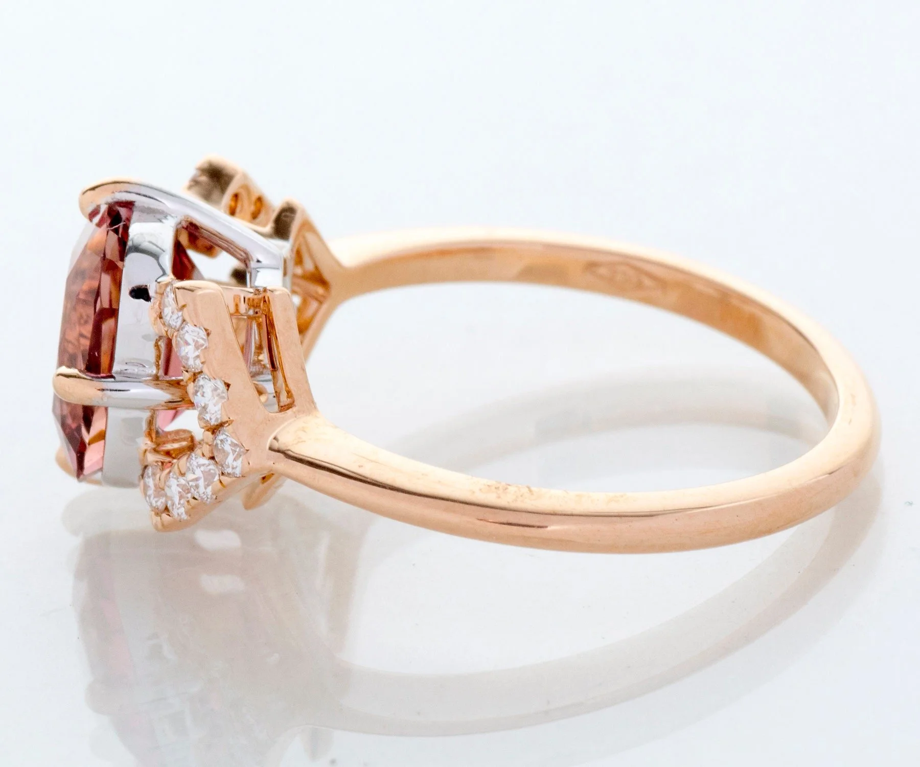 Custom Ring - 18k Rose Gold 2.03ct Cushion Cut Pink Tourmaline & Diamond Ring 18k Rose Gold Cushion Cut Pink Tourmaline =2.03cts 14 Round Brilliant Diamonds =.21ct VS/G-H Ring Size 6.5 (sizable) Ring measures approximately 10.2mm at center, back of band is 1.7mm wide.
