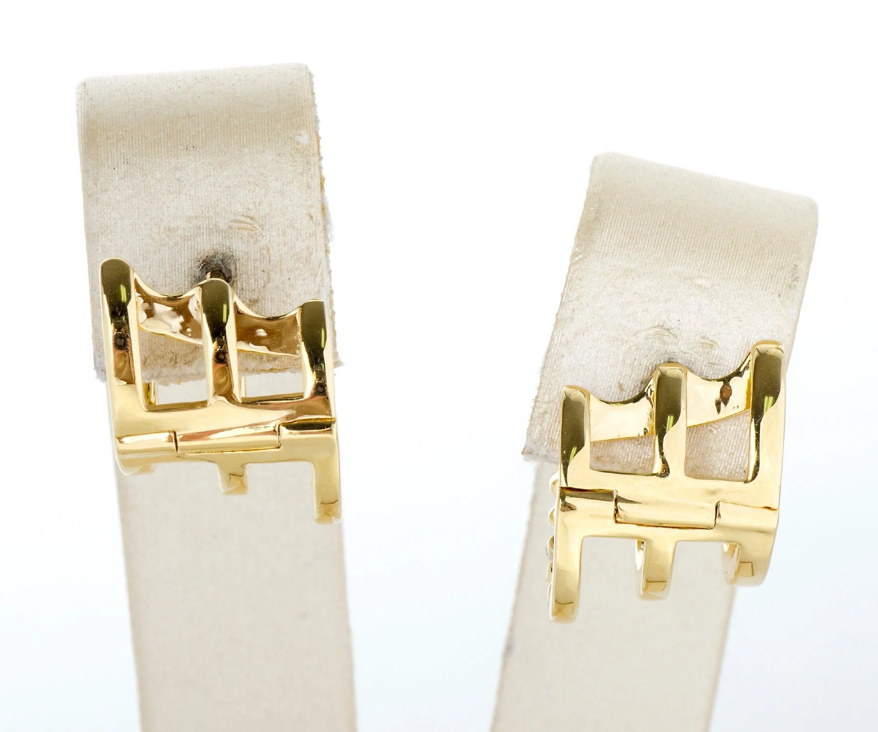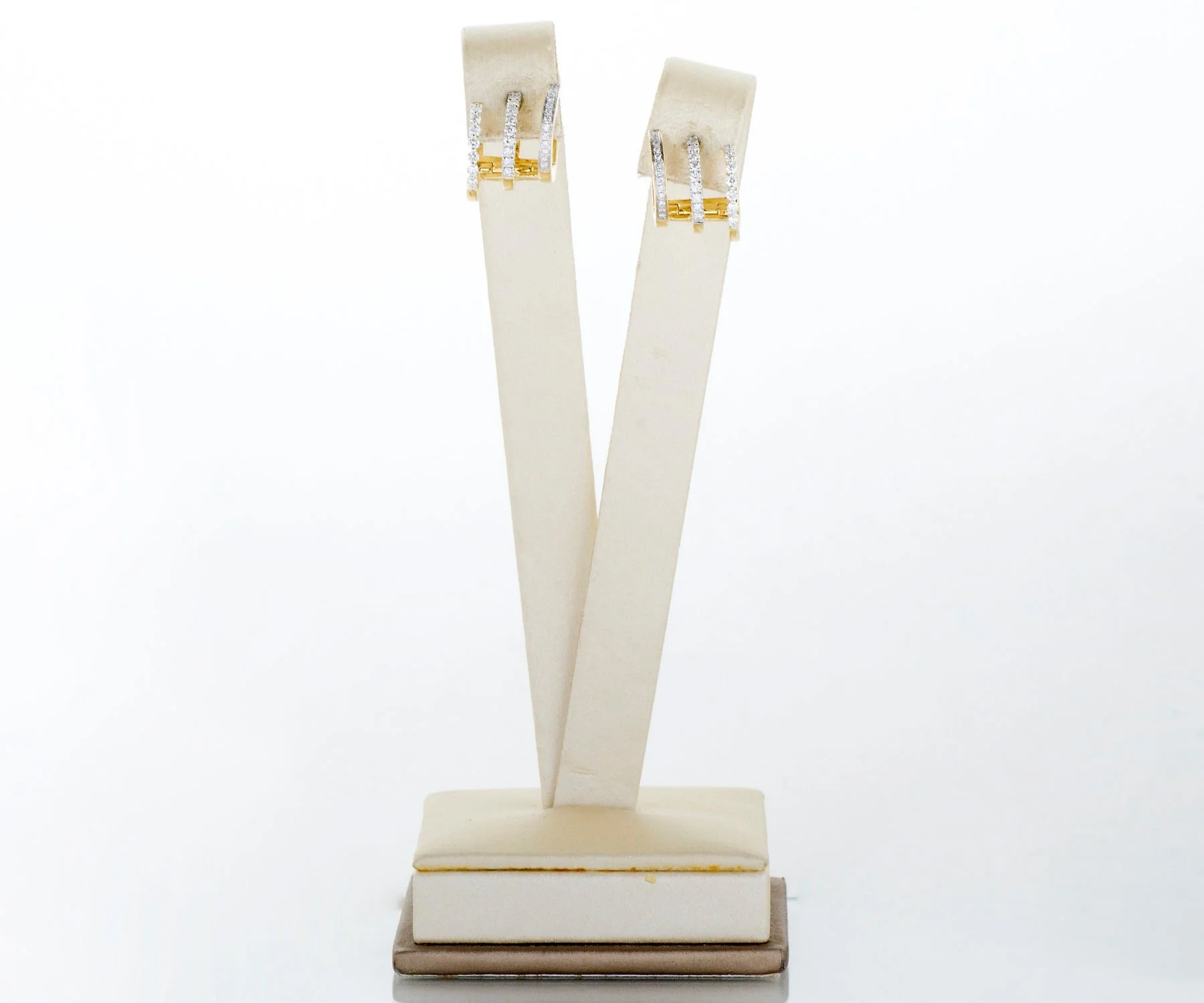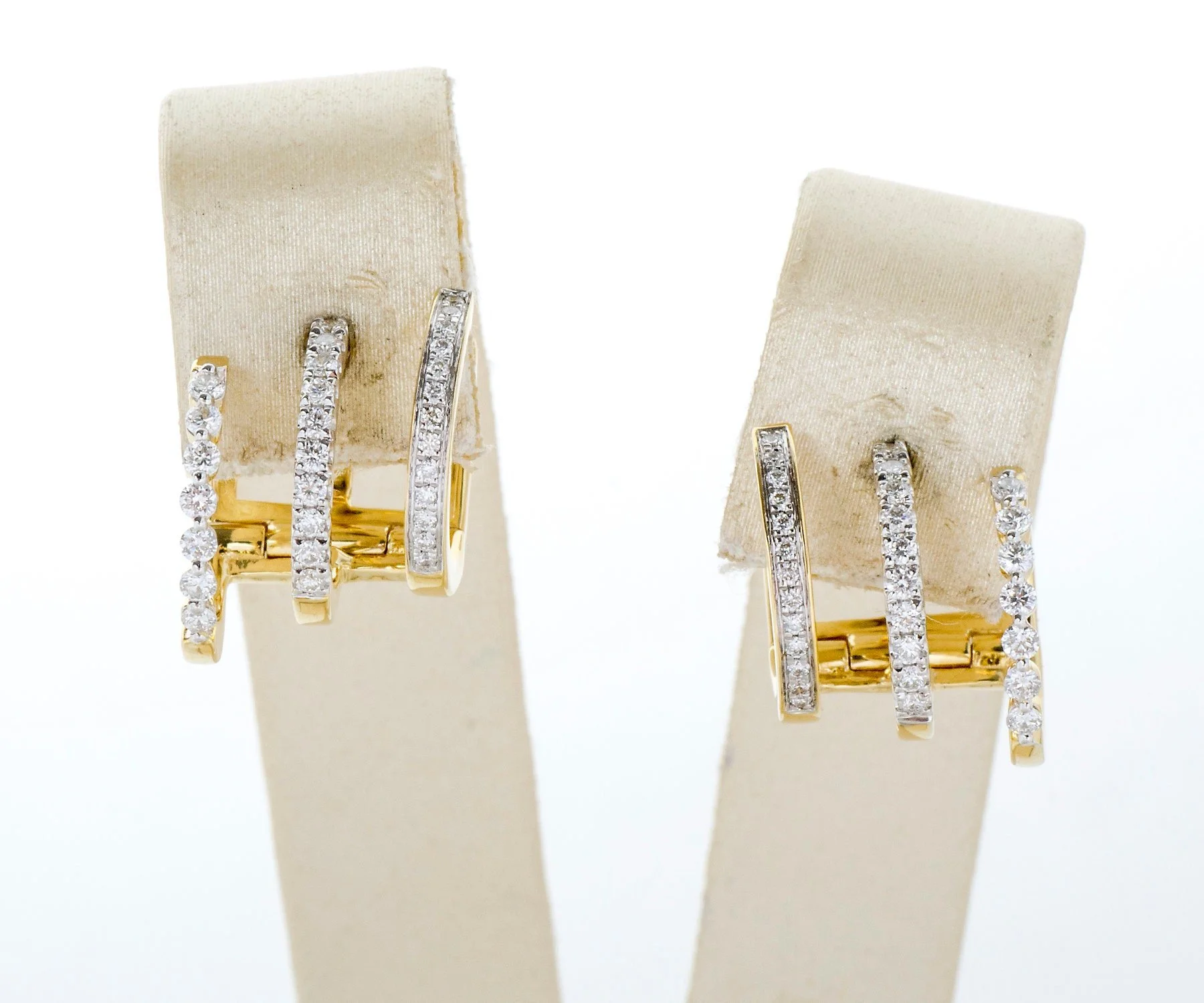 Fun! These triple hoop design 18k yellow gold earrings are for a single piercing but the appearance is that of multiple piercings. The middle hoop has the post. Sixty round brilliant diamonds with a total weight of 1/2 carat sparkle away in these eye-catching dazzlers!