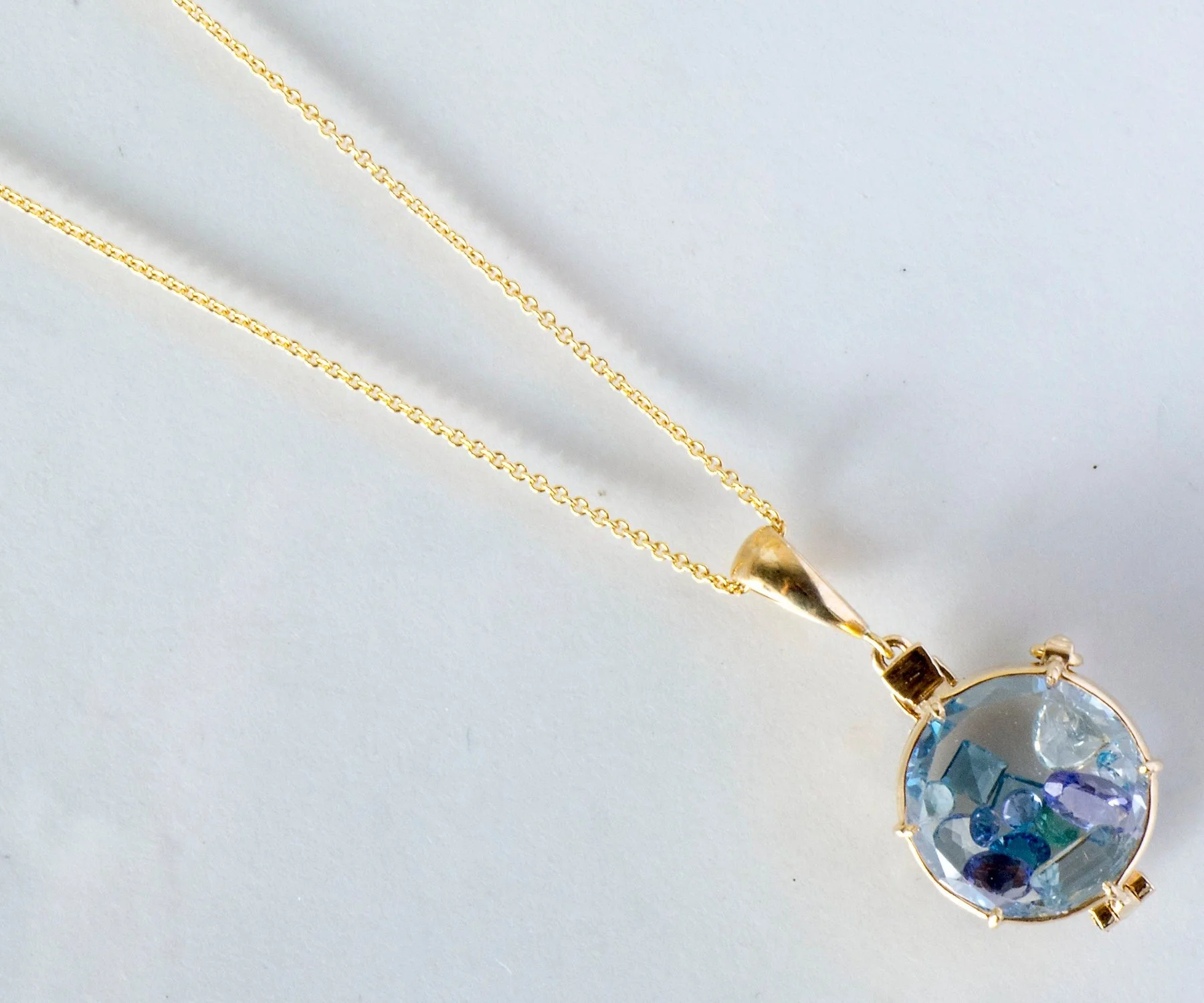 Locket Necklace - 14k Yellow Gold Rock Crystal Quartz Floating Aquamarine, Topaz and Tanzanite Locket Necklace 14k Yellow Gold Rock Crystal Quartz Aquamarine, Topaz & Tanzanite =1.39cts Pendant measures approximately 1" tall with bale, 1/2" without bale and 1/2" wide. 14k yellow gold chain is 18" long.