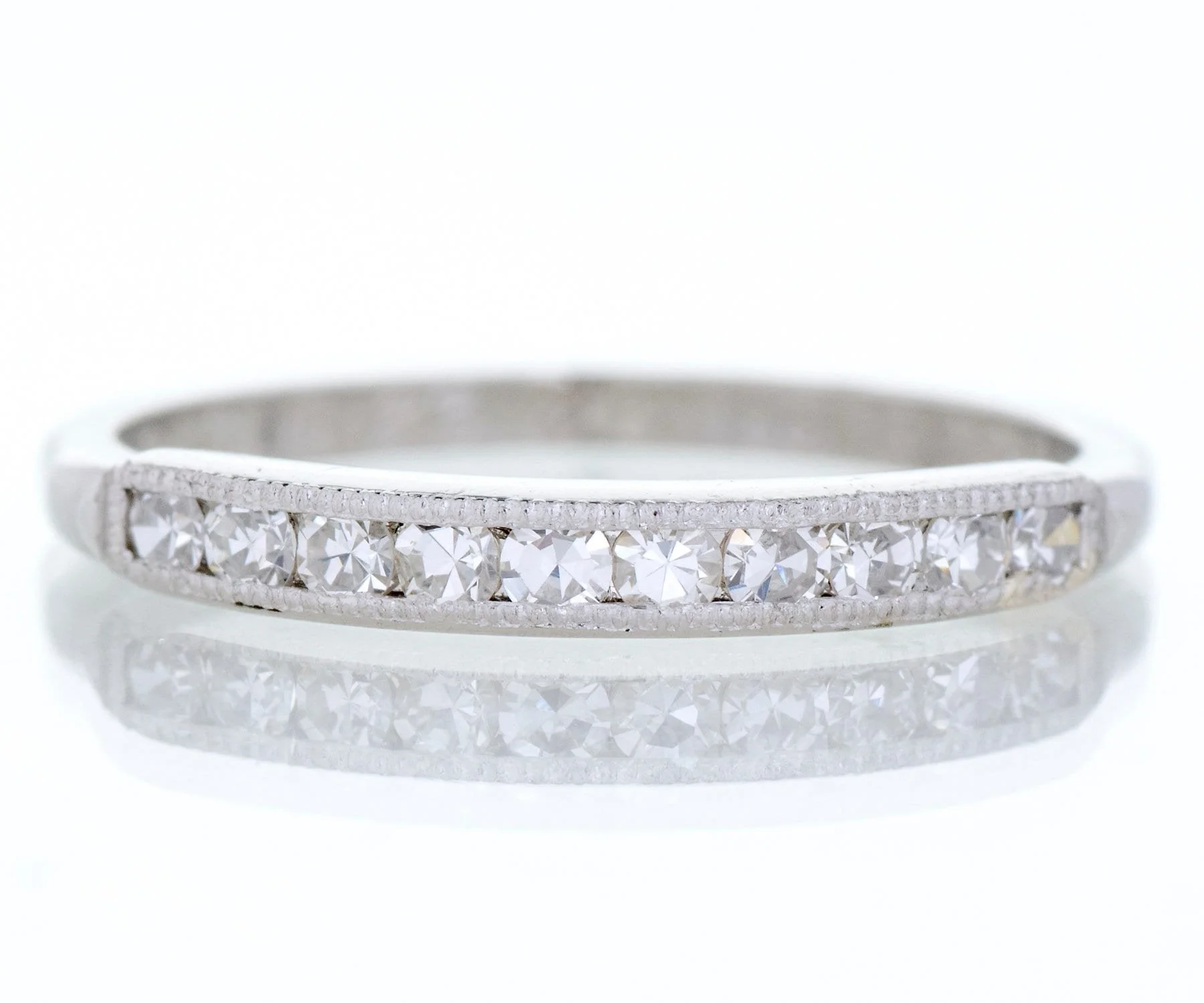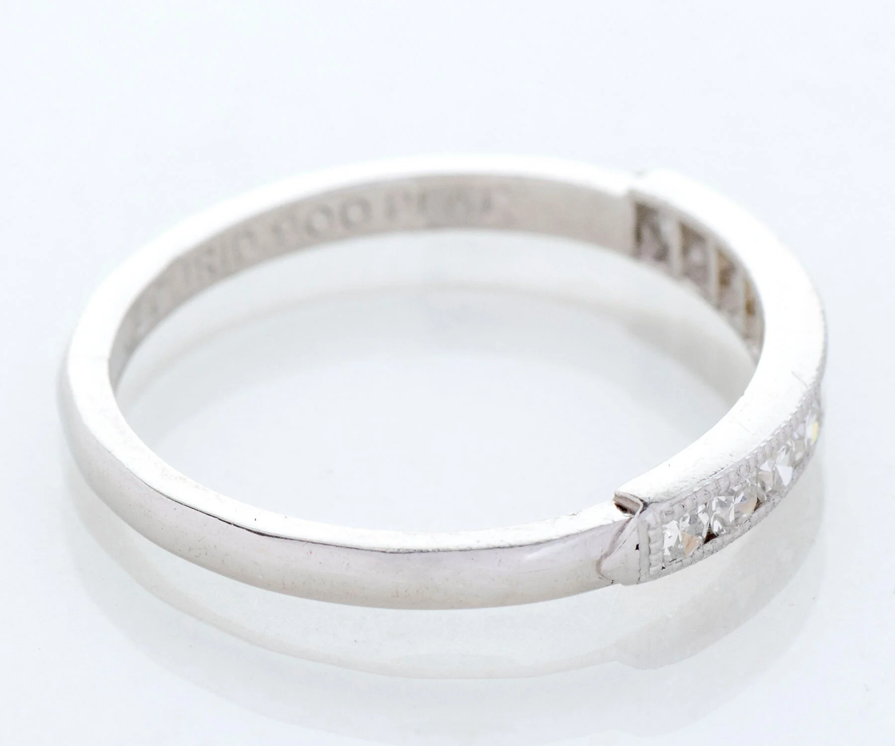 Antique Wedding Band - Antique Platinum Engraved "1941" Diamond Wedding Band Platinum 10 Single Cut Diamonds =.25cts VS1-VS2/G-H Engraved "J.C.M. to R.A.R. 8.23.41" Ring Size 4.5 (sizable) Band measures approximately 2.4mm at center, back of band is 1.5mm wide.