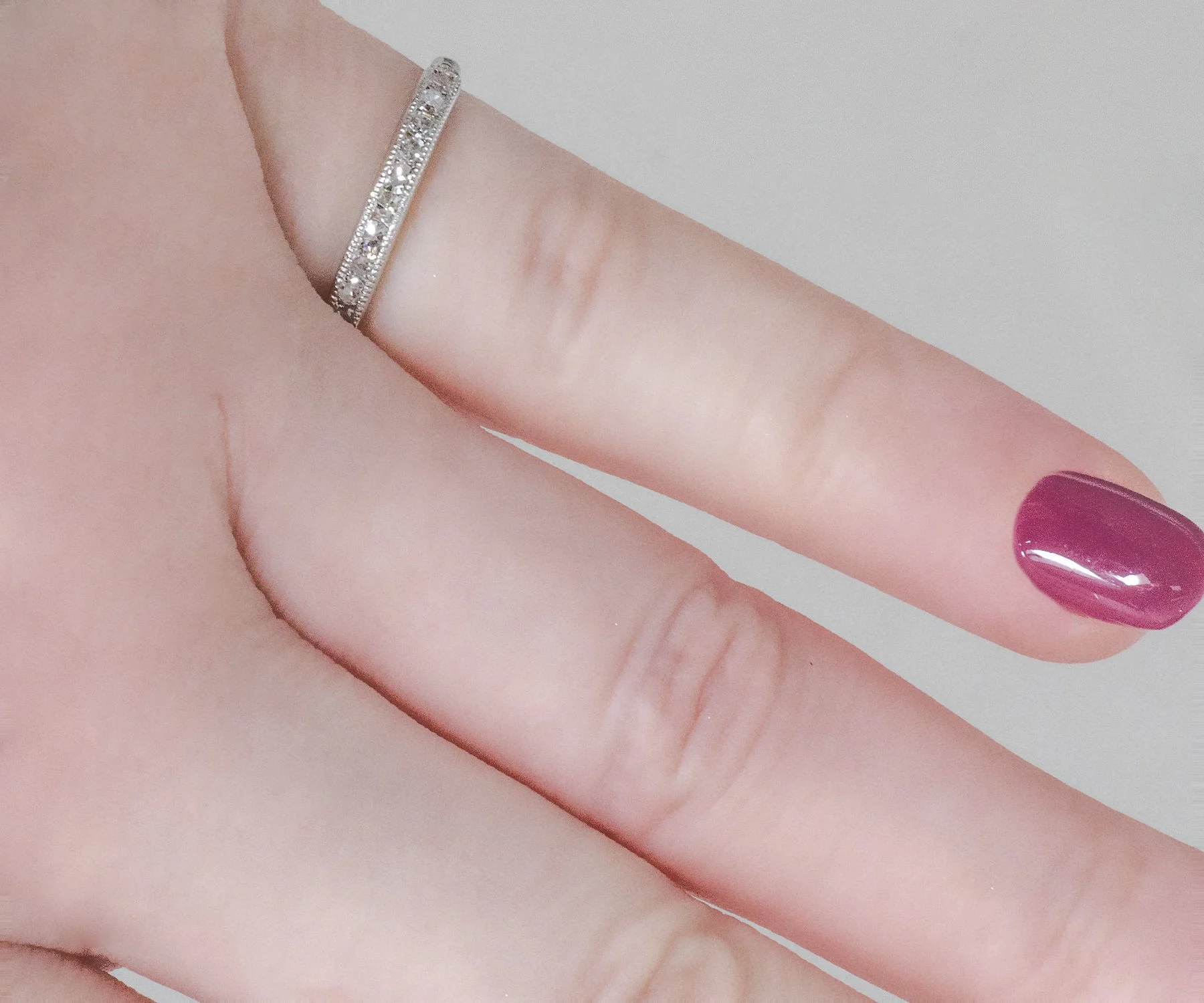 This is a dear sweet antique platinum diamond wedding band. One thing that makes this so pretty are the ten darling diamonds in it from the year "1941". Would look good with most any style engagement ring, or also worn alone. So cute and dainty with a touch of sparkle!