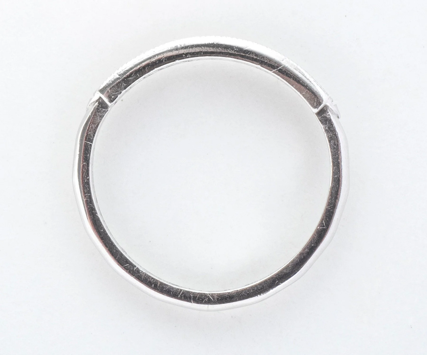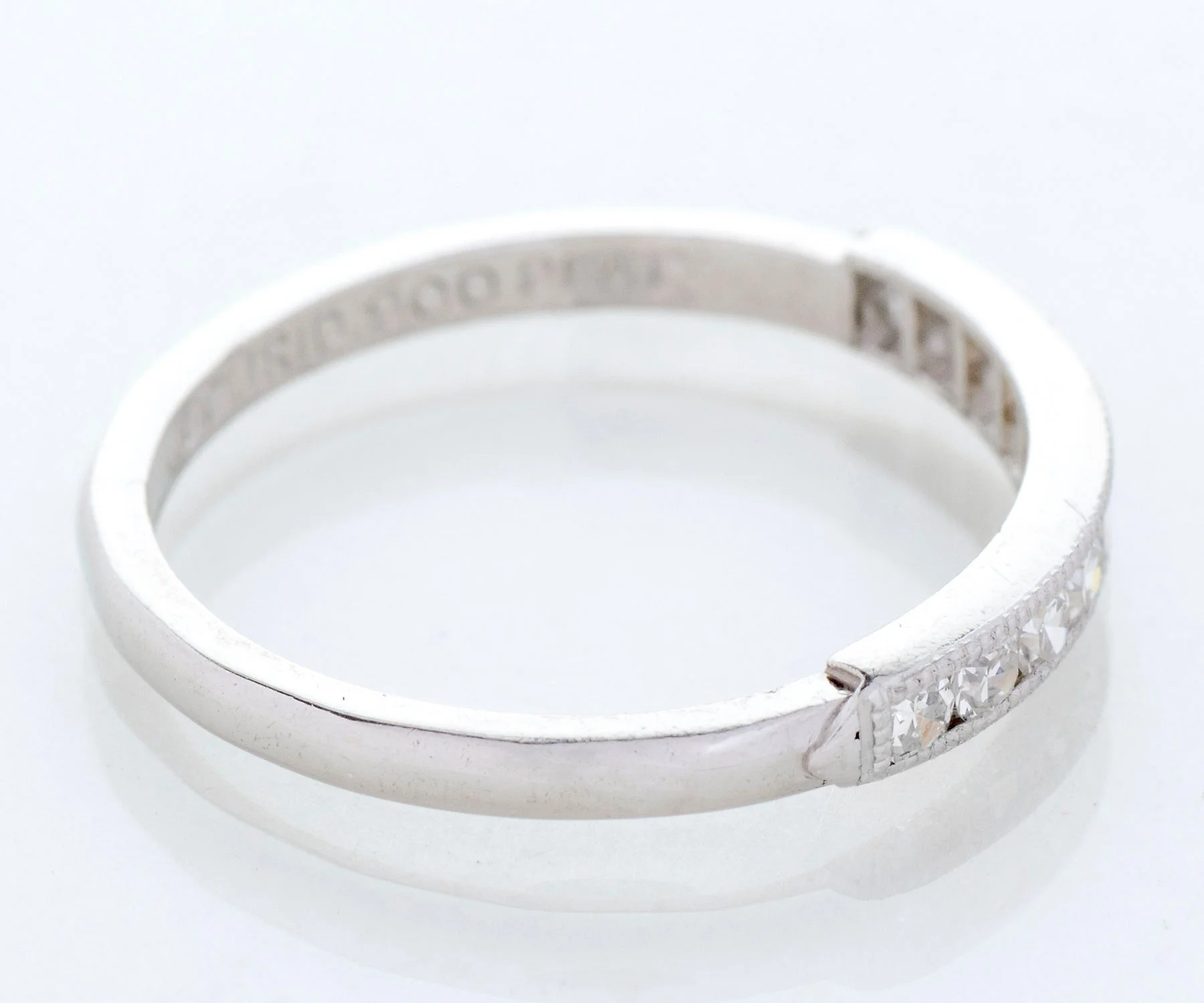 Antique Wedding Band - Antique Platinum Engraved "1941" Diamond Wedding Band Platinum 10 Single Cut Diamonds =.25cts VS1-VS2/G-H Engraved "J.C.M. to R.A.R. 8.23.41" Ring Size 4.5 (sizable) Band measures approximately 2.4mm at center, back of band is 1.5mm wide.