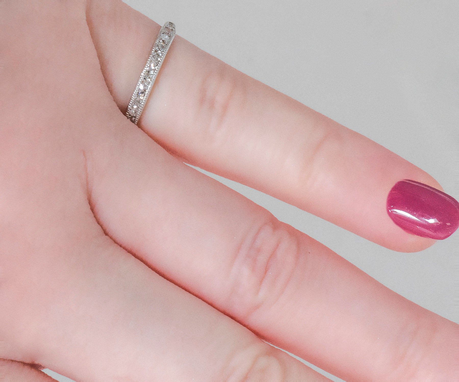 This is a dear sweet antique platinum diamond wedding band. One thing that makes this so pretty are the ten darling diamonds in it from the year "1941". Would look good with most any style engagement ring, or also worn alone. So cute and dainty with a touch of sparkle!
