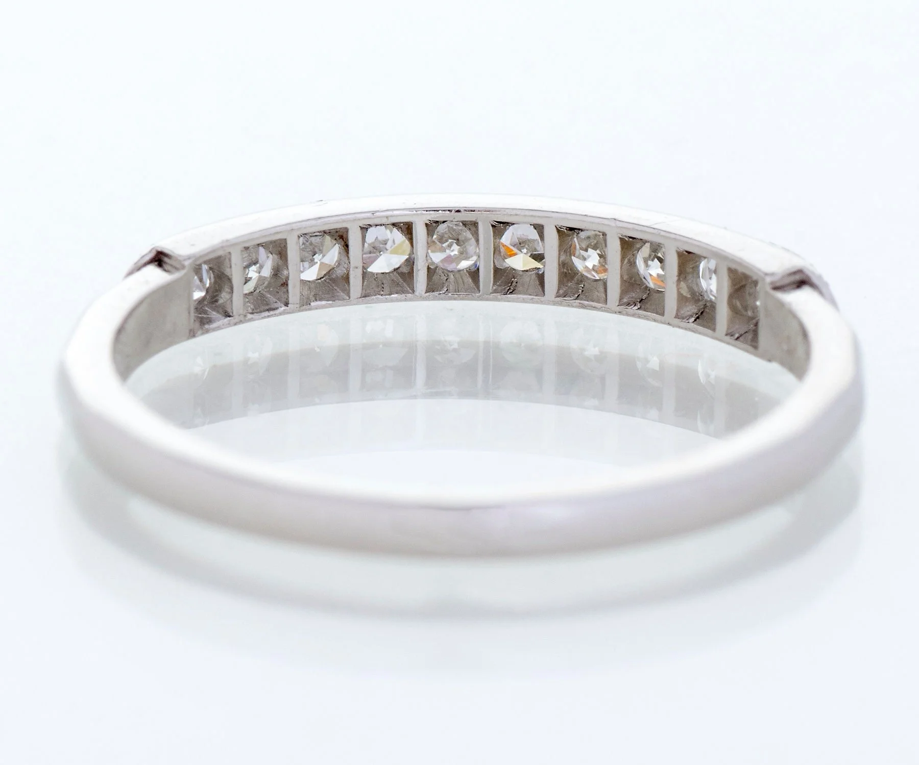Antique Wedding Band - Antique Platinum Engraved "1941" Diamond Wedding Band Platinum 10 Single Cut Diamonds =.25cts VS1-VS2/G-H Engraved "J.C.M. to R.A.R. 8.23.41" Ring Size 4.5 (sizable) Band measures approximately 2.4mm at center, back of band is 1.5mm wide.