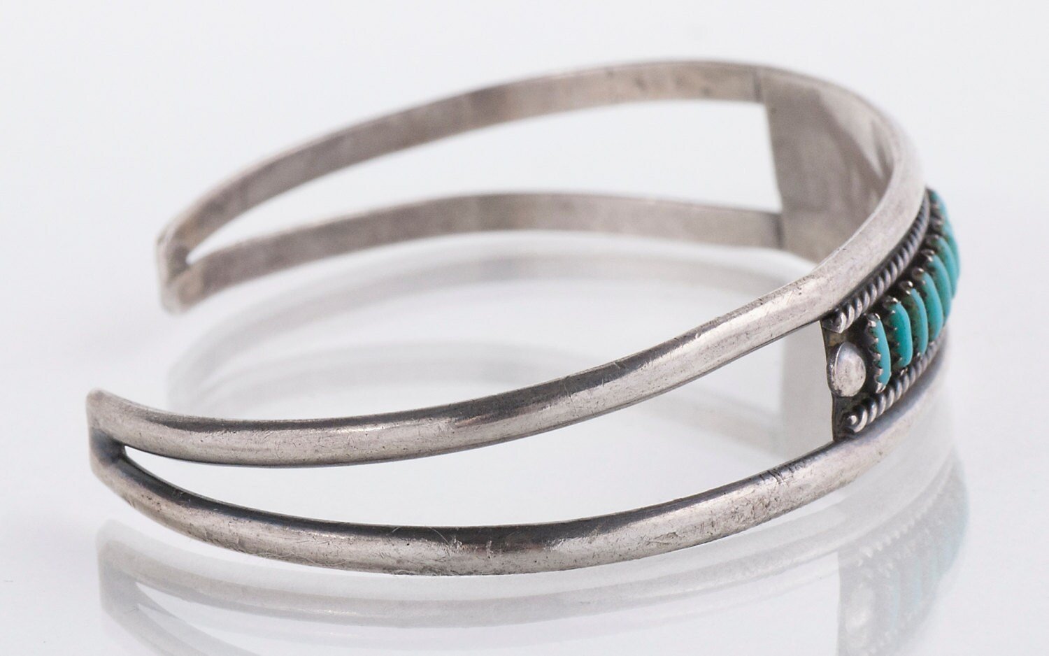 Store › Turquoise Cuff - Vintage Zuni Sterling Silver Petit Point Turquoise Cuff Image 1 of 5 Image 2 of 5 Image 3 of 5 Image 4 of 5 Image 5 of 5 Turquoise Cuff - Vintage Zuni Sterling Silver Petit Point Turquoise Cuff $395.00 Enjoy wearing this vintage piece of Native American history. It looks fabulous with a crisp white blouse! Turquoise Cuff - Vintage Zuni Sterling Silver Petit Point Turquoise CuffSterling Silver TurquoiseCuff measures 6.25" with gap. Gap measures 1".Cuff measures 1/2" in height. Please read our shop policies prior to purchase. Thank you for looking and contact us with any questions. Add To Cart Added! Enjoy wearing this vintage piece of Native American history. It looks fabulous with a crisp white blouse! Turquoise Cuff - Vintage Zuni Sterling Silver Petit Point Turquoise CuffSterling Silver TurquoiseCuff measures 6.25" with gap. Gap measures 1".Cuff measures 1/2" in height. Please read our shop policies prior to purchase. Thank you for looking and contact us with any questions.