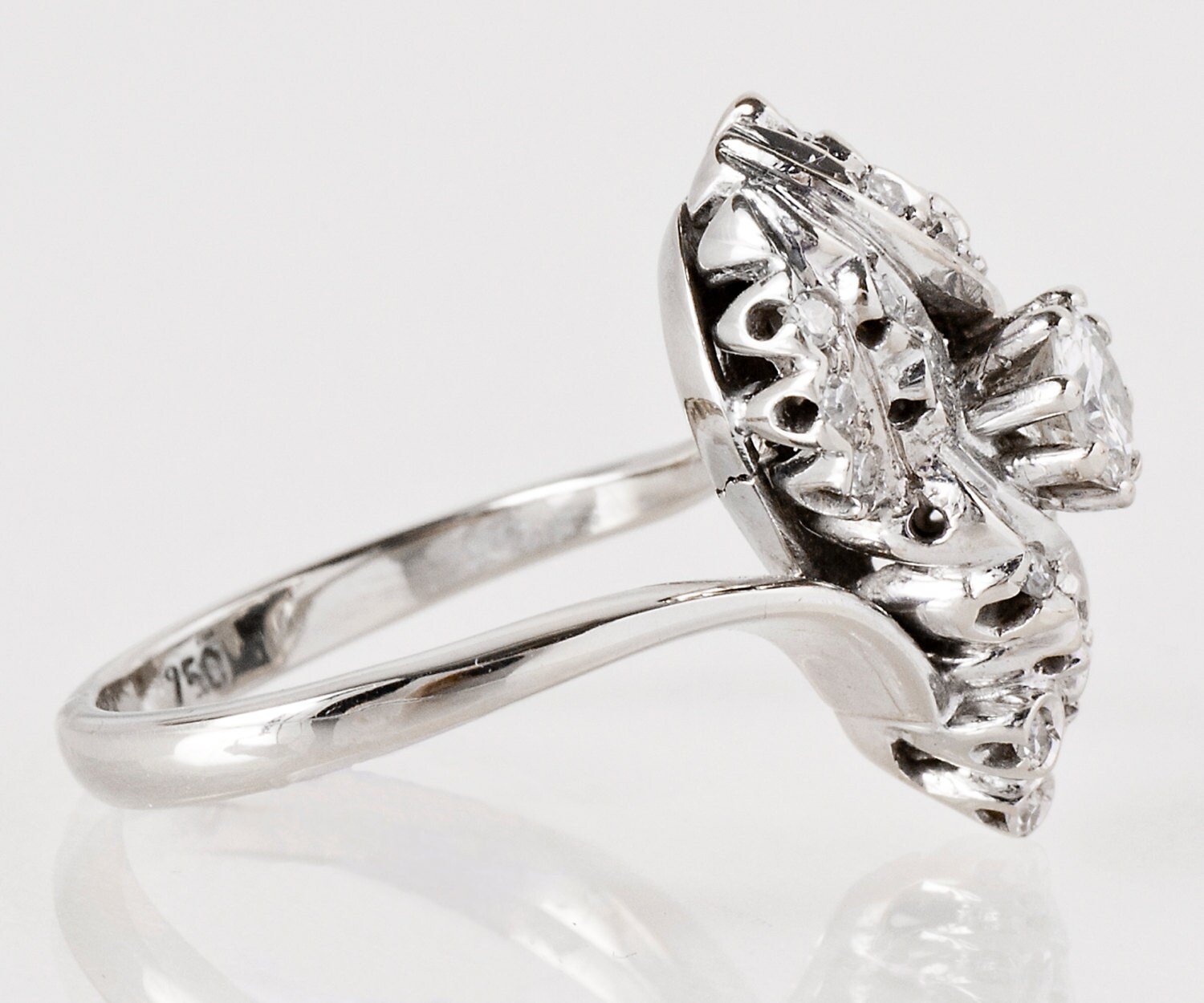 This ring is just lovely and the diamonds really sparkle brilliantly. This 1950s design is a fun look of the time period.
