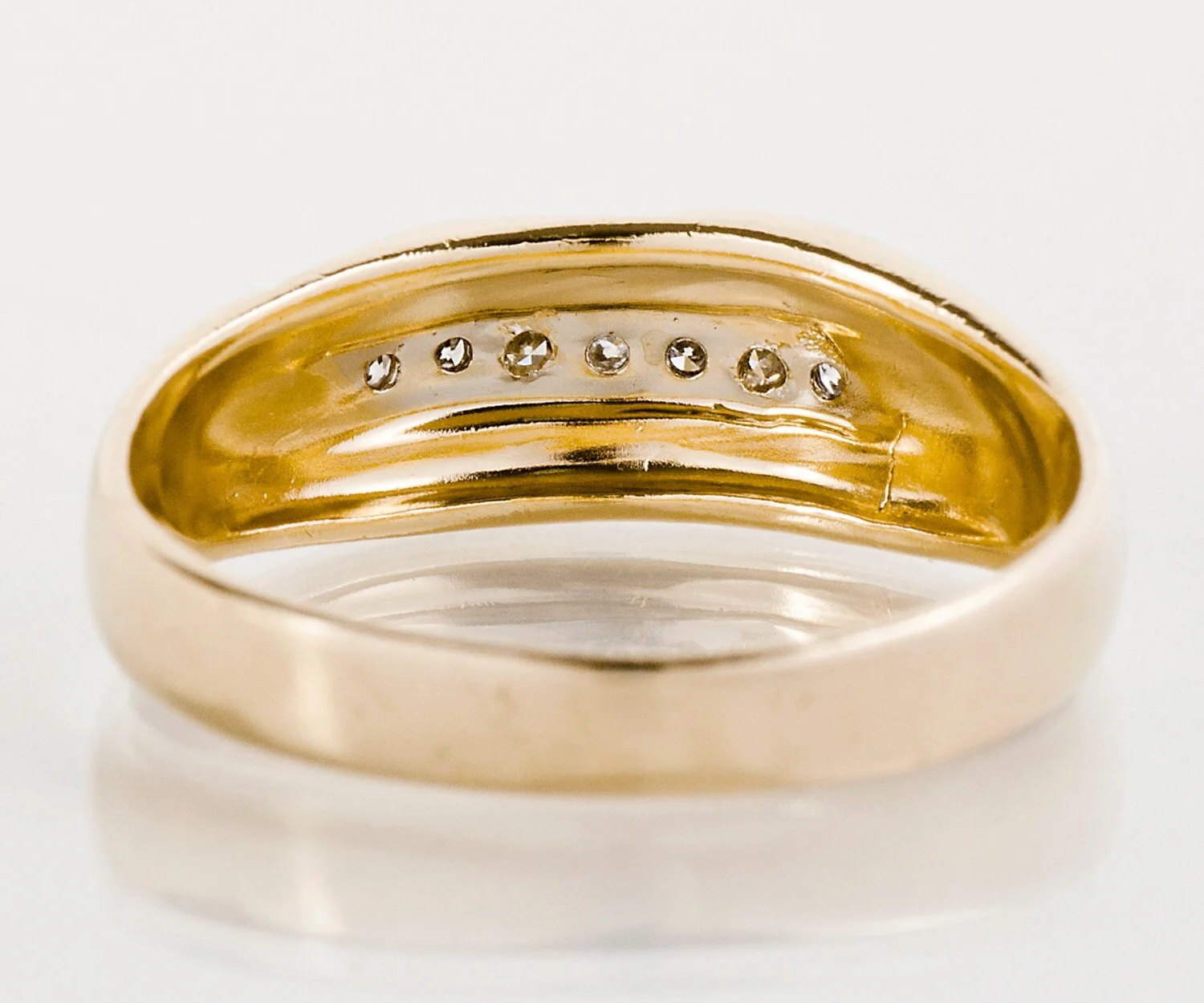 Vintage Band - Men's Band - Vintage 1950's 14k Yellow Gold Men's Wedding Band 1950's 14k Yellow Gold 7 Diamonds =.15cts VS1-SI2/G-I Ring Size 13.75 (ring is sizable) Ring measures approximately 8.2mm at center, back of band is 4mm.
