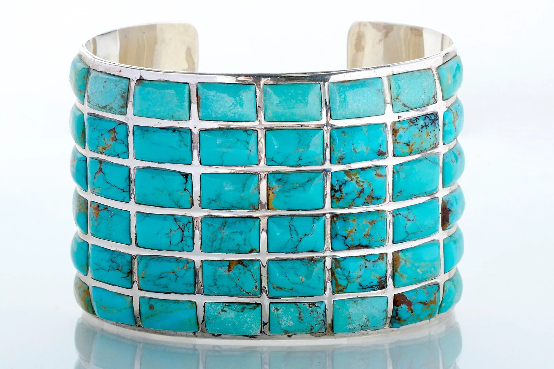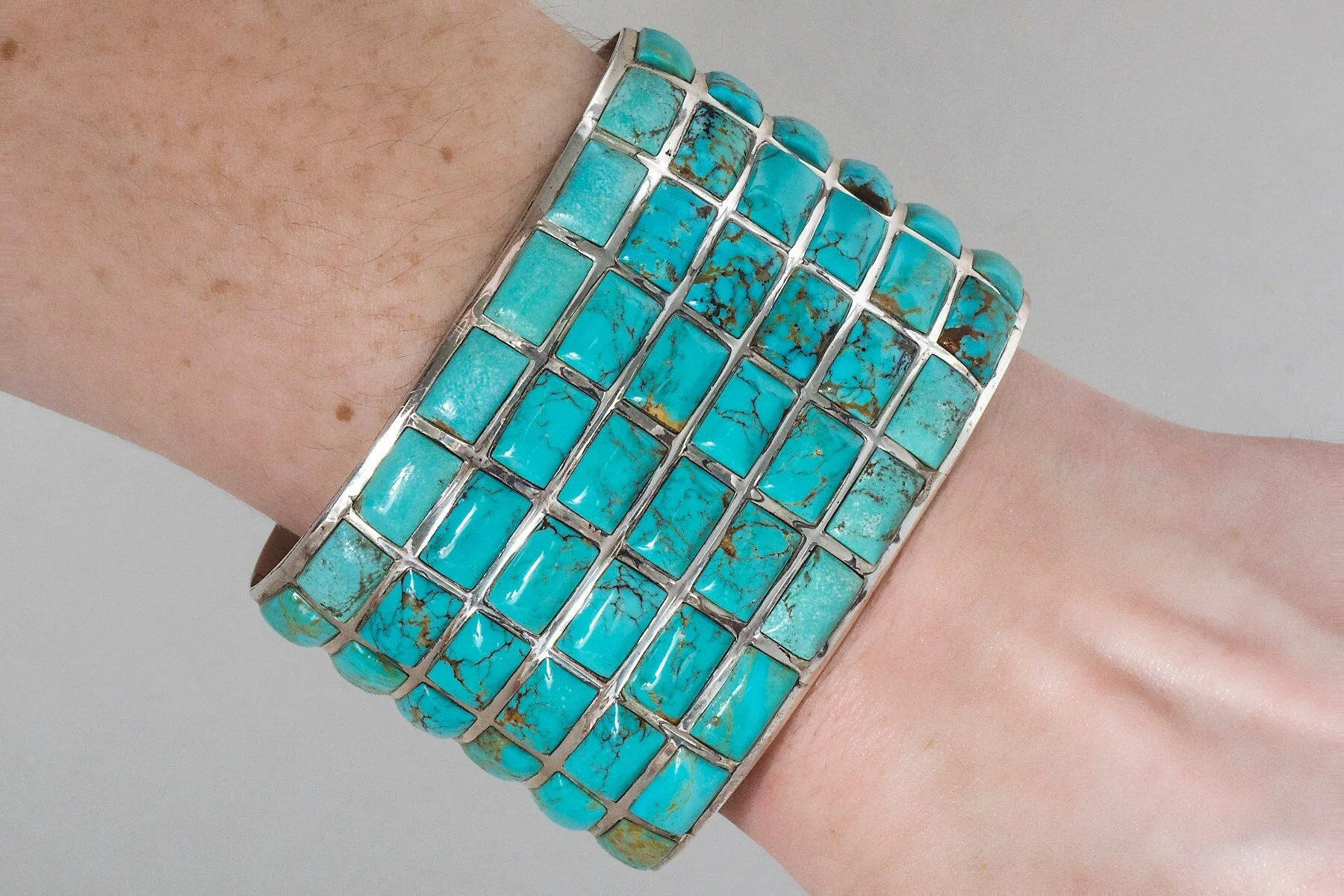 Wow! This vintage cuff is guaranteed to get attention and complete your outfit. Handcrafted by Navajo artist Sally Yazzie, the cuff is fully 2 inches wide and contains 48 pieces of stunning turquoise. The quality and workmanship of this sterling silver statement bracelet are really remarkable. Signed.