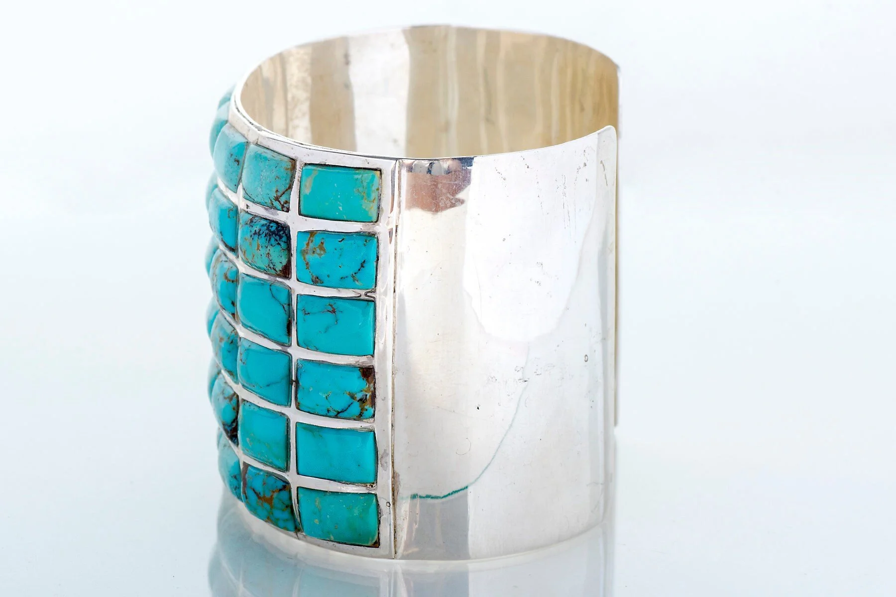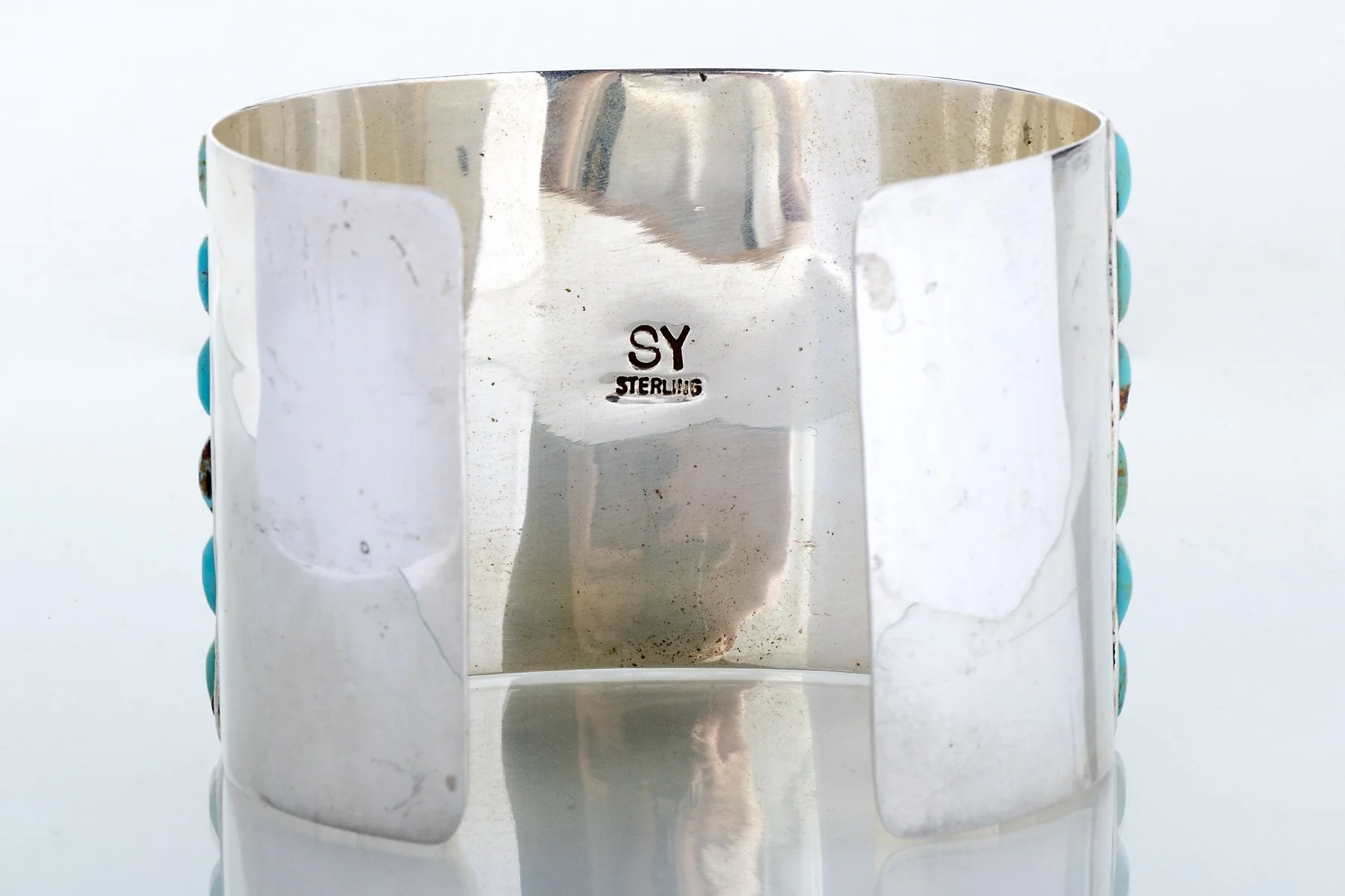 Vintage Bracelet - Vintage Navajo Sterling Silver and Turquoise Cuff - Sally Yazzie Sterling Silver Turquoise Inner circumference measures approximately 6.0 inches from end to end plus a 1.25 inch gap for a total of 7.25 inches. Cuff measures approximately 2.0 inches wide.